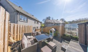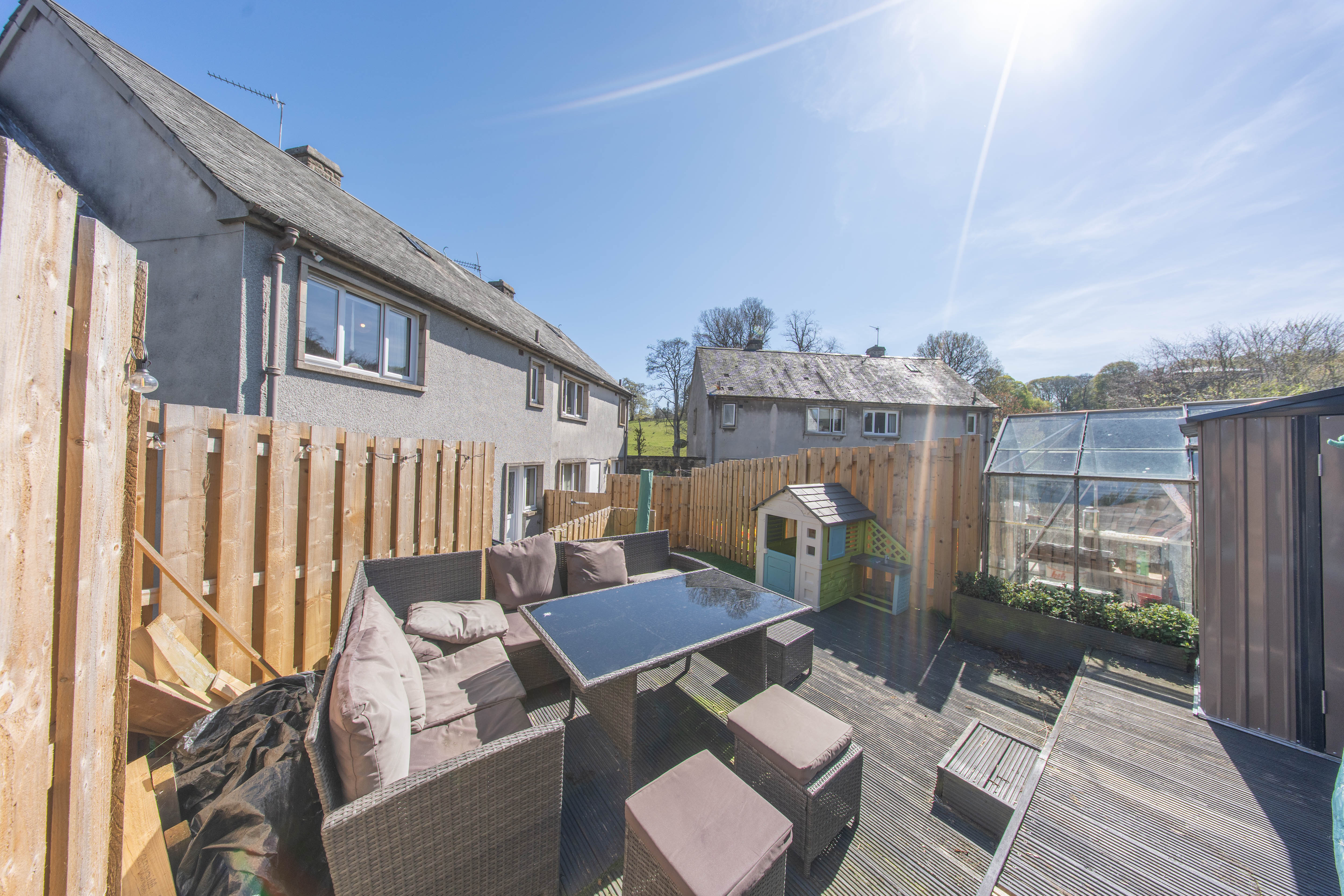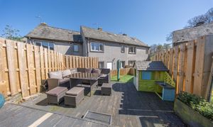 A fully enclosed rear garden is designed for low-maintenance and outdoor living. Steps lead up to an area of artificial lawn, providing a practical space for children or pets, while a generous decked area offers the perfect spot for seating and entertaining. The garden is bordered by timber fencing for privacy, and further benefits from a useful external storage cupboard, complete with power.