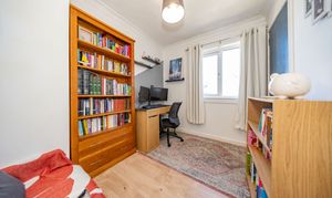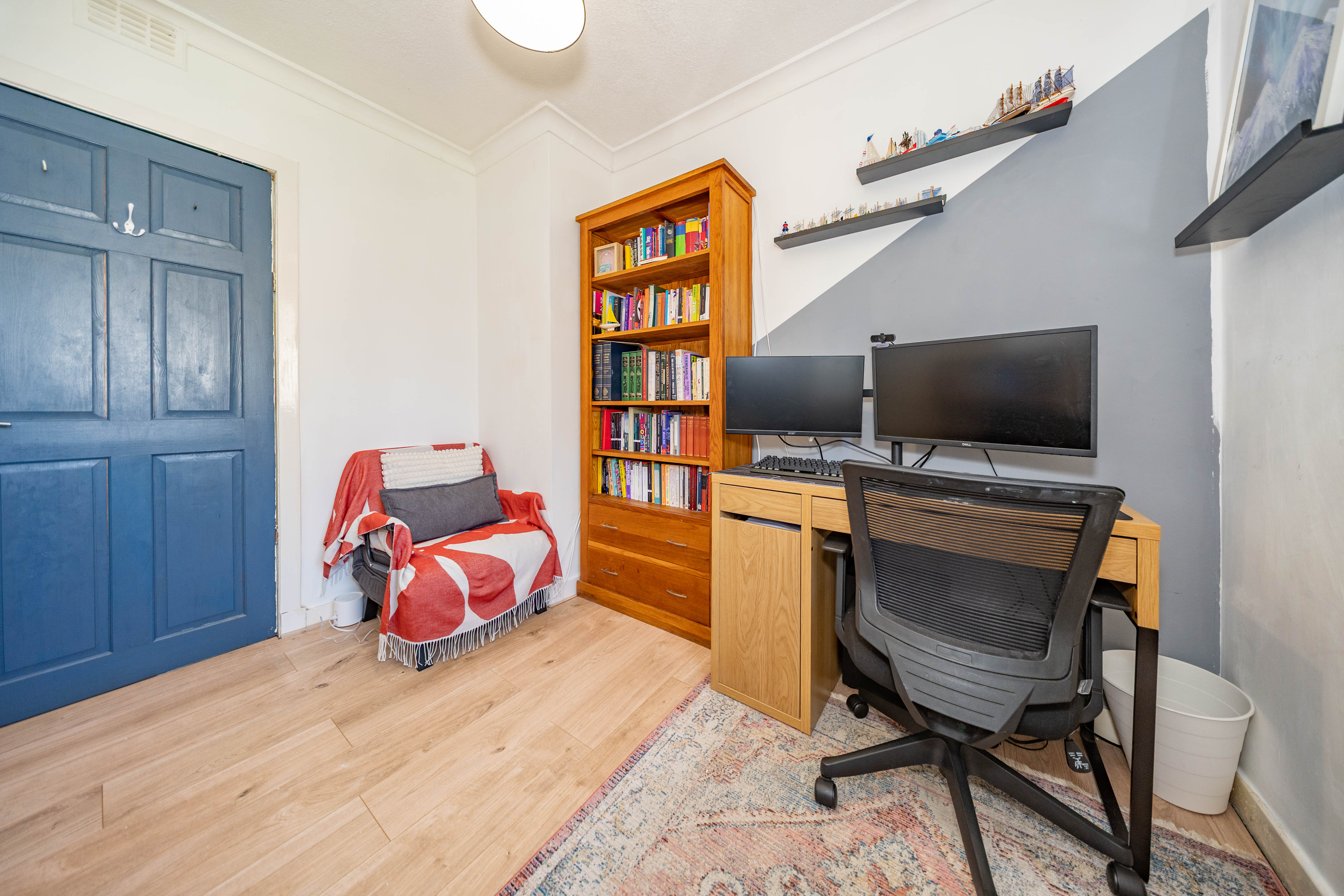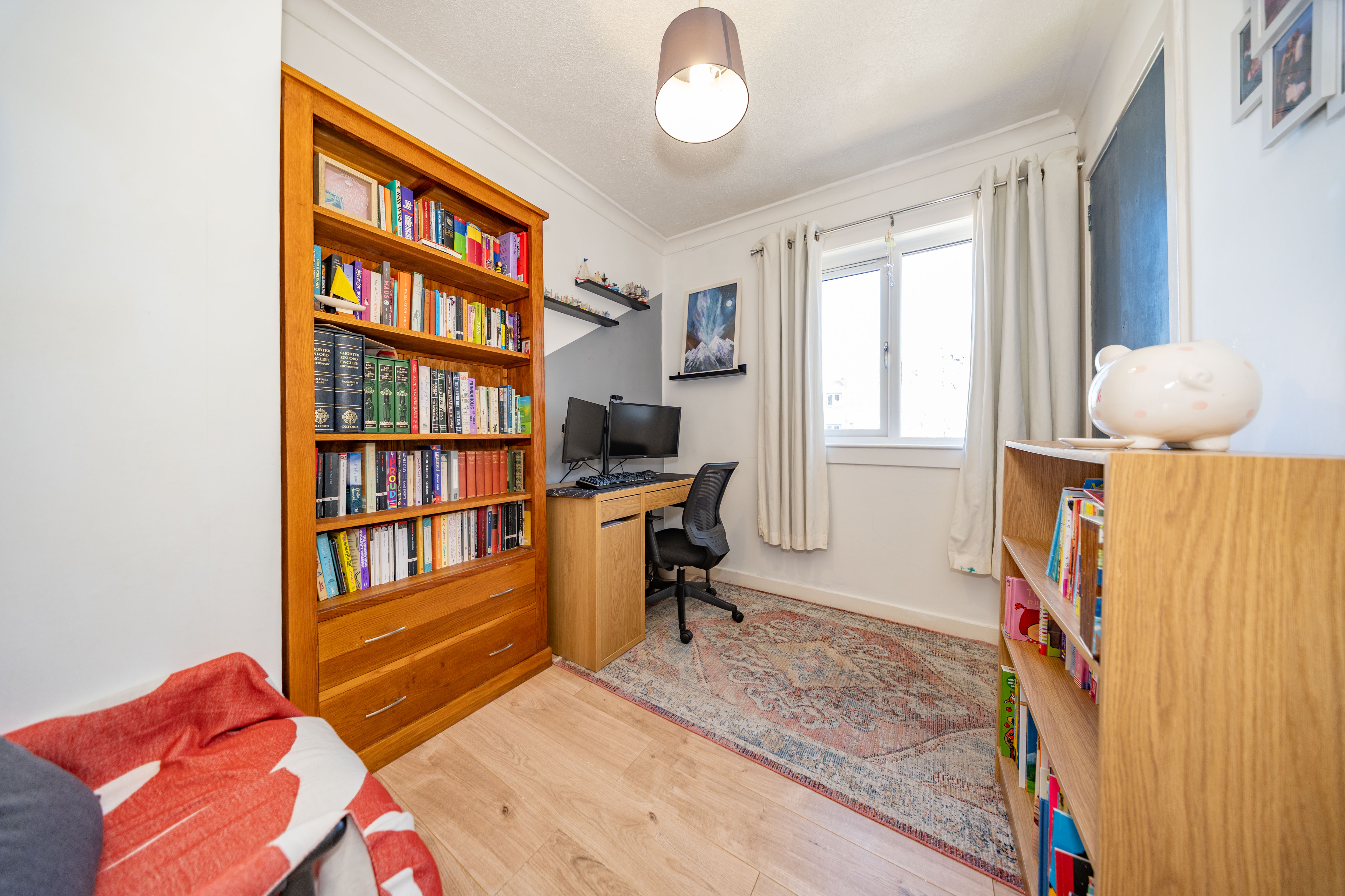 2.828m x 2.135m (09’04” x 07’00”) A bright and well-presented room, currently utilised as a home office, featuring laminate flooring and painted walls. A window to the front allows for good natural light, while the room benefits from built-in storage, a radiator, power points and a ceiling pendant light, making it a versatile space suitable for a bedroom, study or nursery.