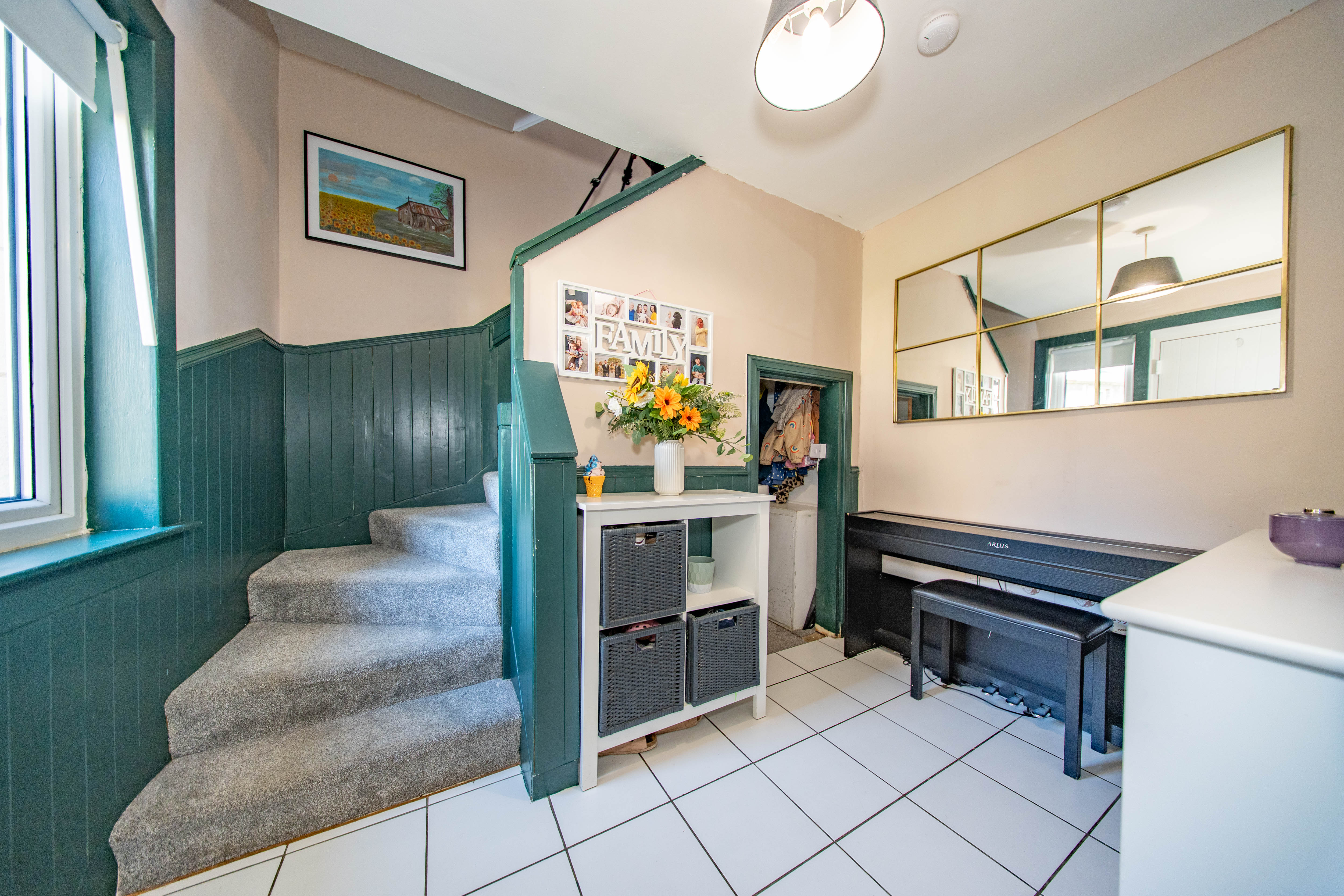 An exceptionally spacious hallway offers excellent room for coats, shoes and additional storage, with a useful area beneath the stairs. This area could also accommodate furniture – with a keyboard currently being used here. The space is enhanced by attractive half-height wooden panelled walls, with a tiled floor, ceiling-mounted lighting, a radiator, a smoke detector and power points.