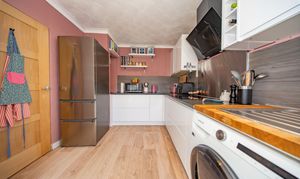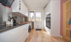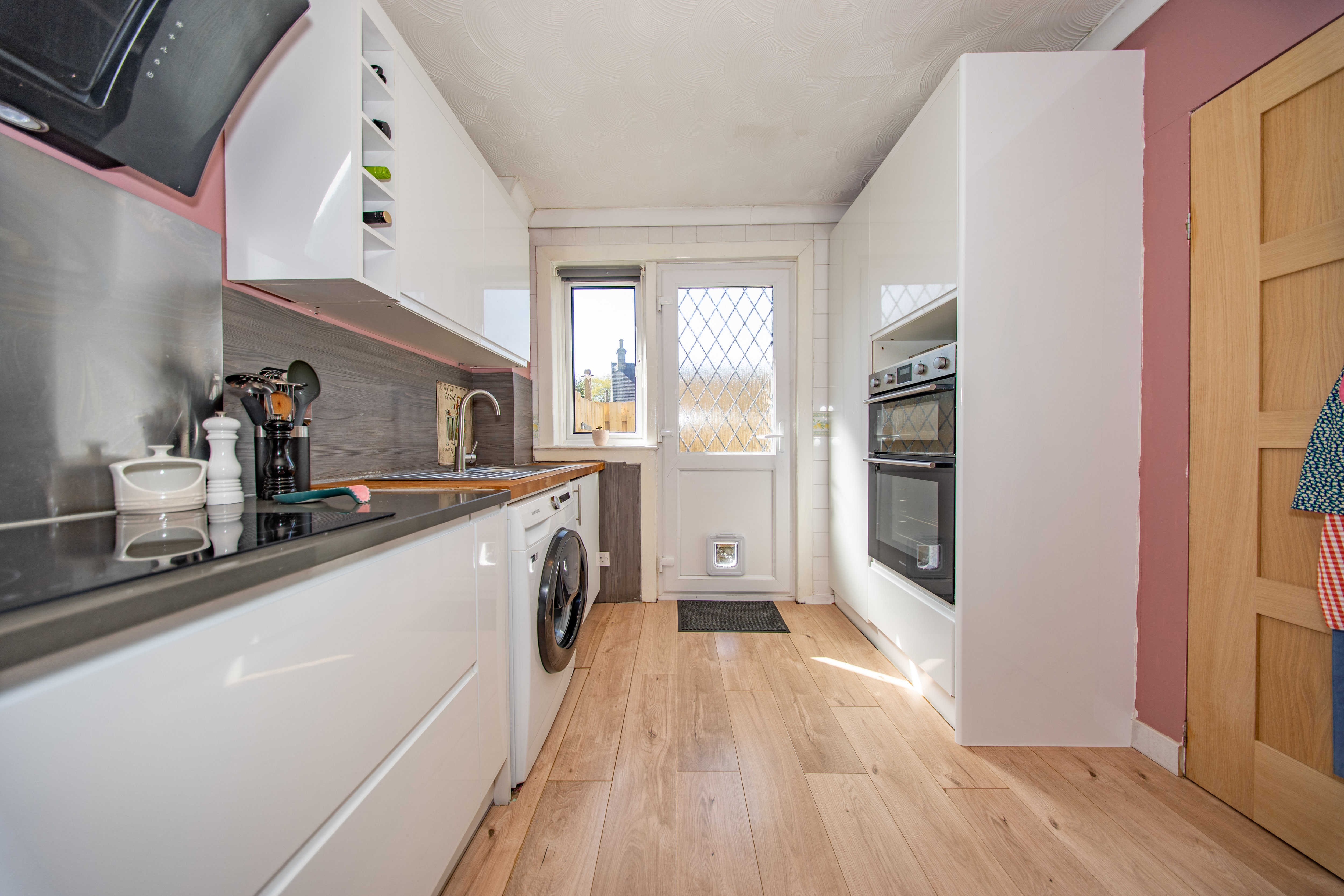 3.501m x 2.636m (11’06” x 08’08”) A well-appointed room fitted with modern white gloss wall and base units, complemented by a practical backsplash. The space includes a mid-height double oven and a four-ring induction hob with extractor fan above. A stainless-steel sink with drainer is positioned beneath the worktop, alongside designated space for both a washing machine and fridge freezer. A useful pantry provides additional storage, making this a highly functional and efficient kitchen space. Ceiling lighting and a heat detector finish the room.