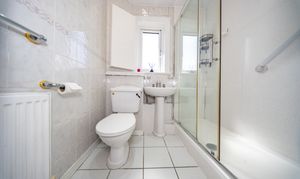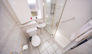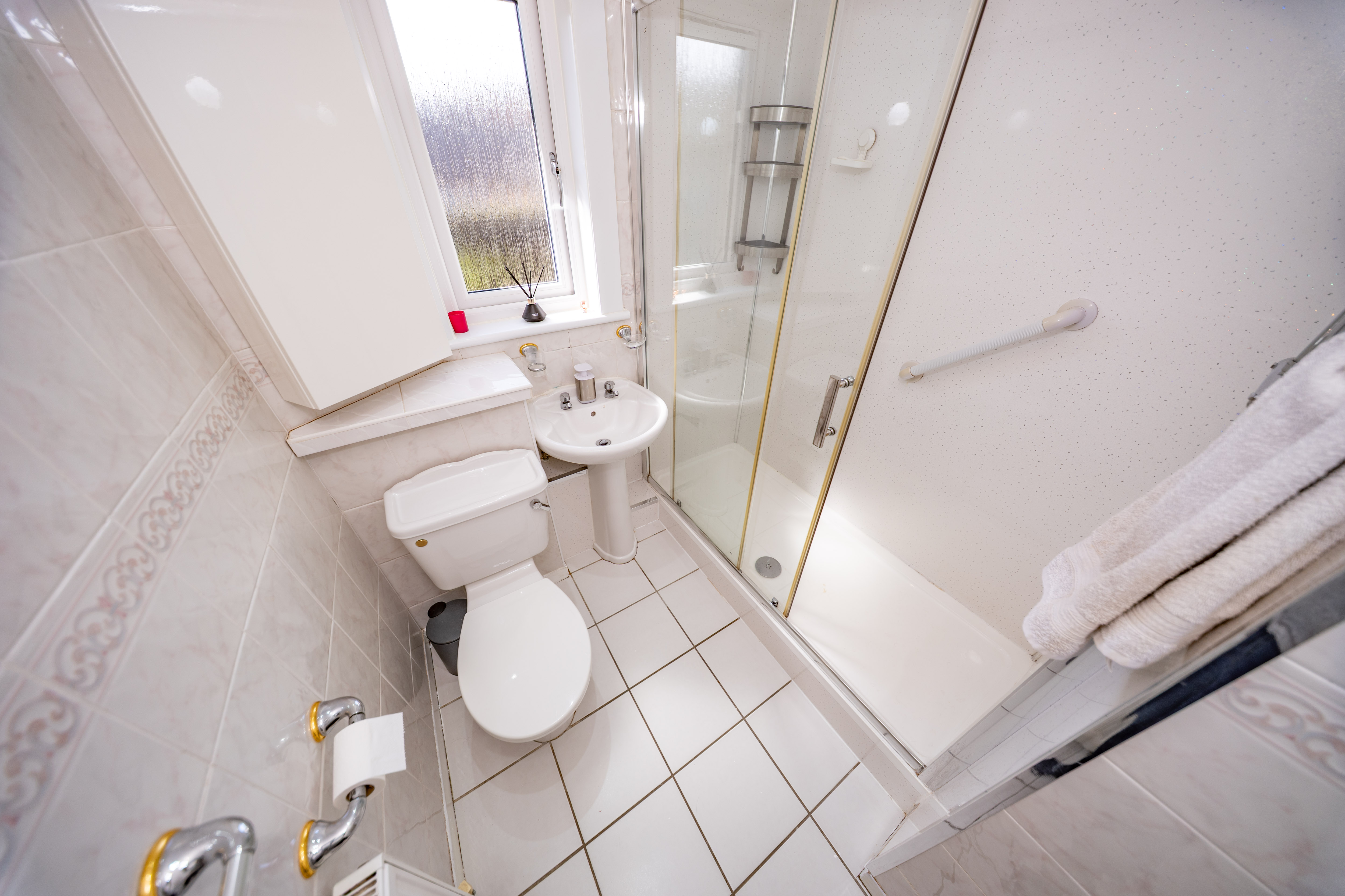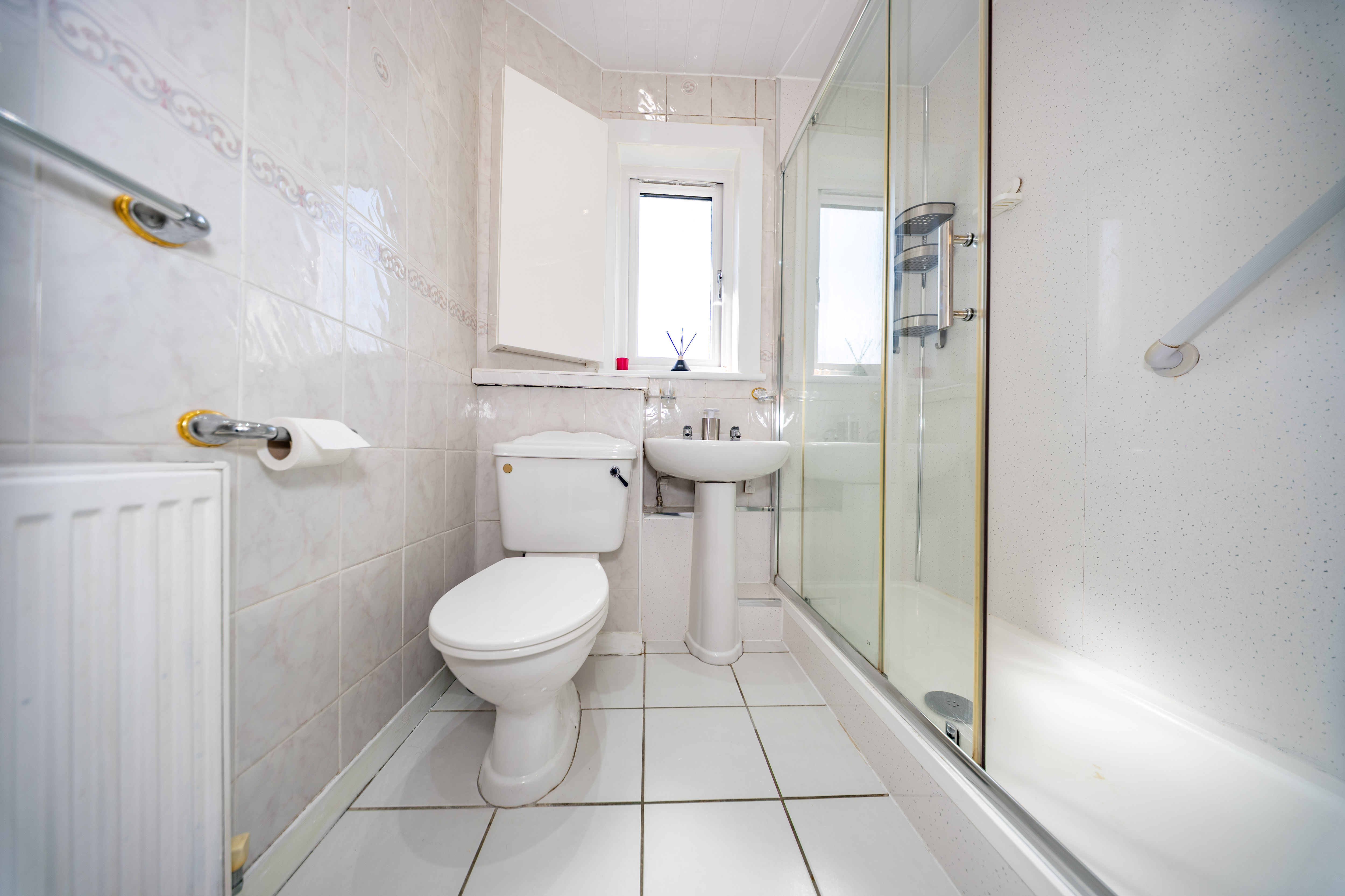2.217m x 1.878m (07’04” x 06’02”) A modern bathroom fitted with a walk-in shower and wet wall panelling, complemented by tiled flooring for a sleek, low-maintenance finish. The room includes a pedestal sink and close-coupled toilet, with a glazed window to the rear allowing for natural light and ventilation. Ceiling spotlights, a radiator and a wall-mounted medicine cabinet complete this well-equipped space.