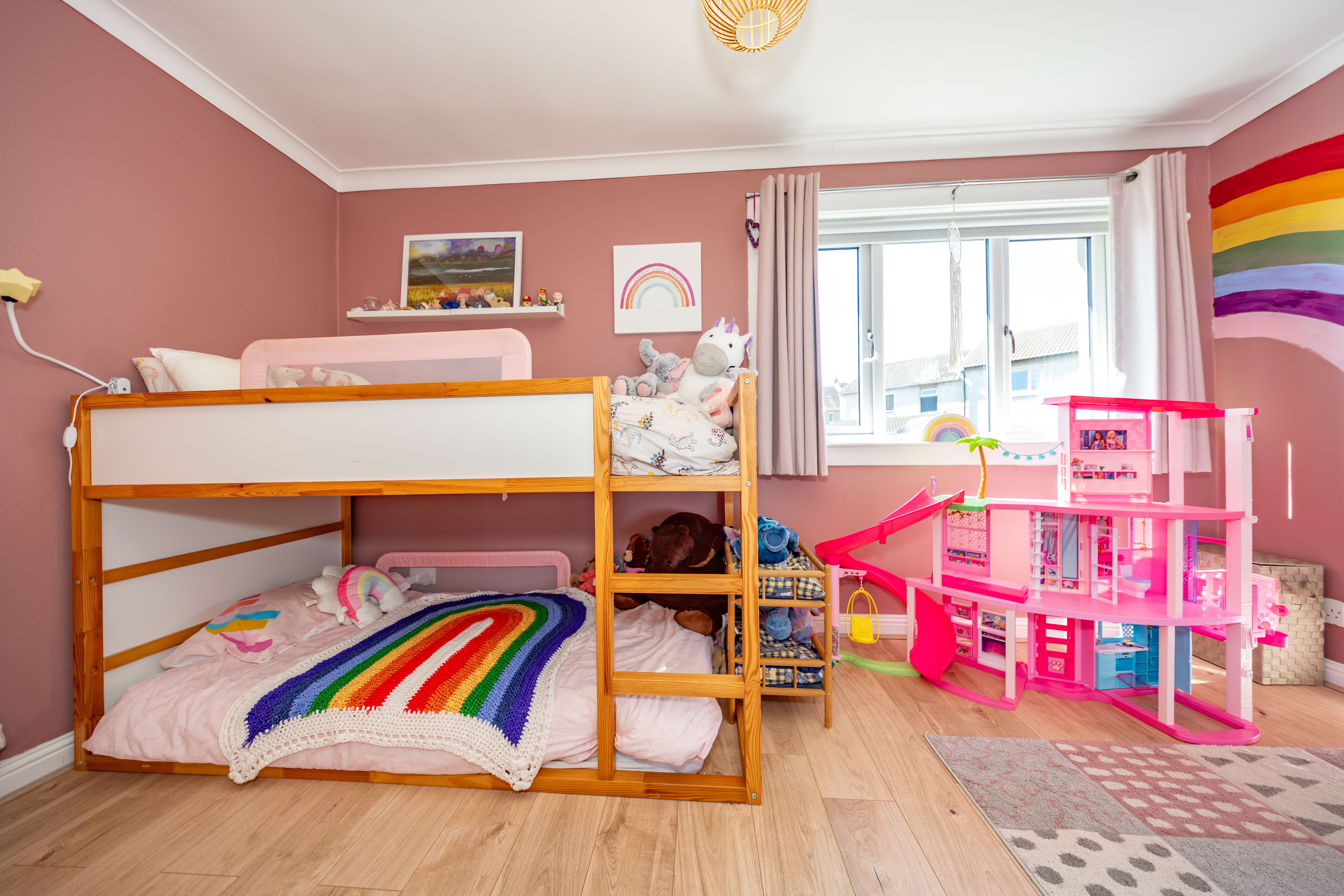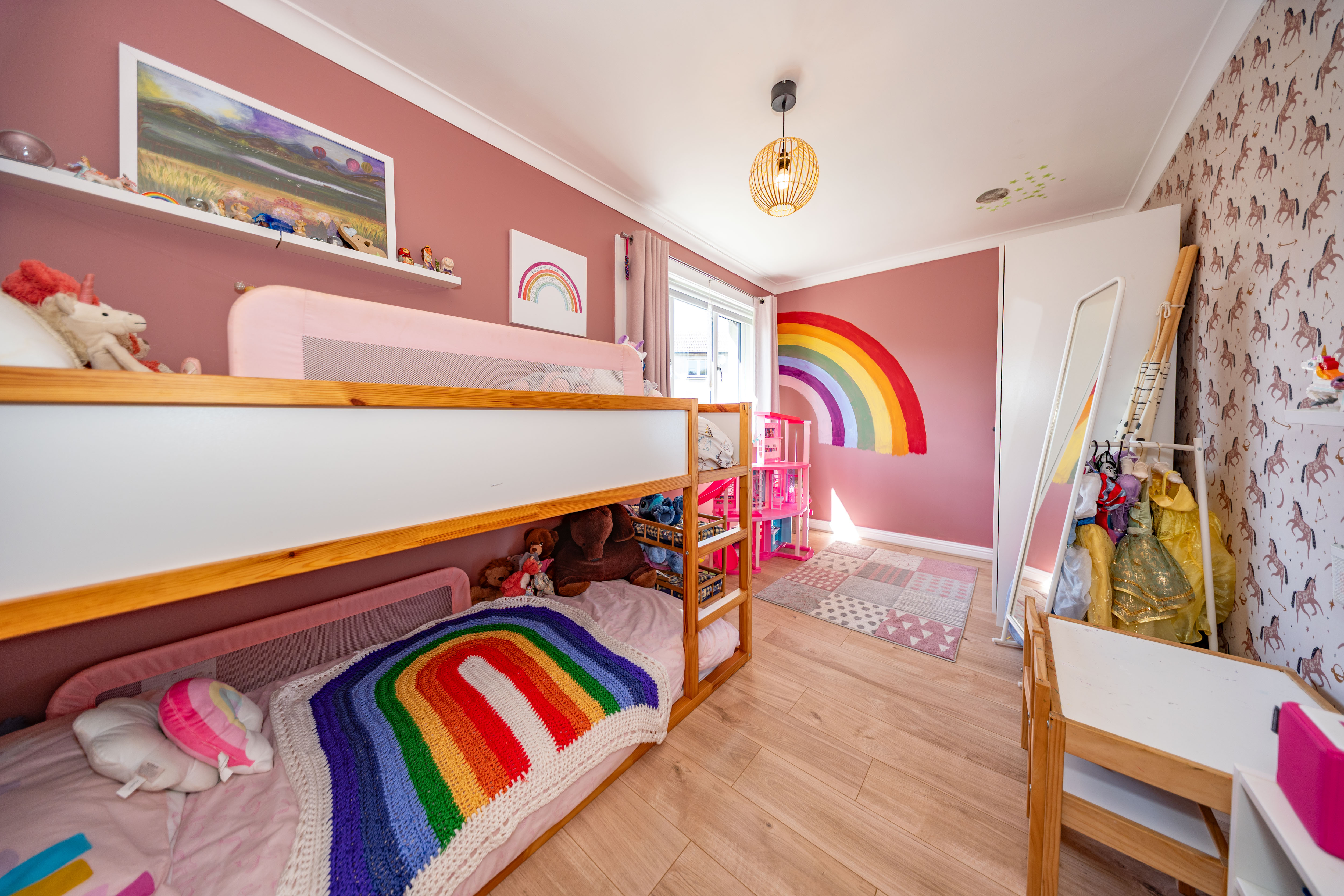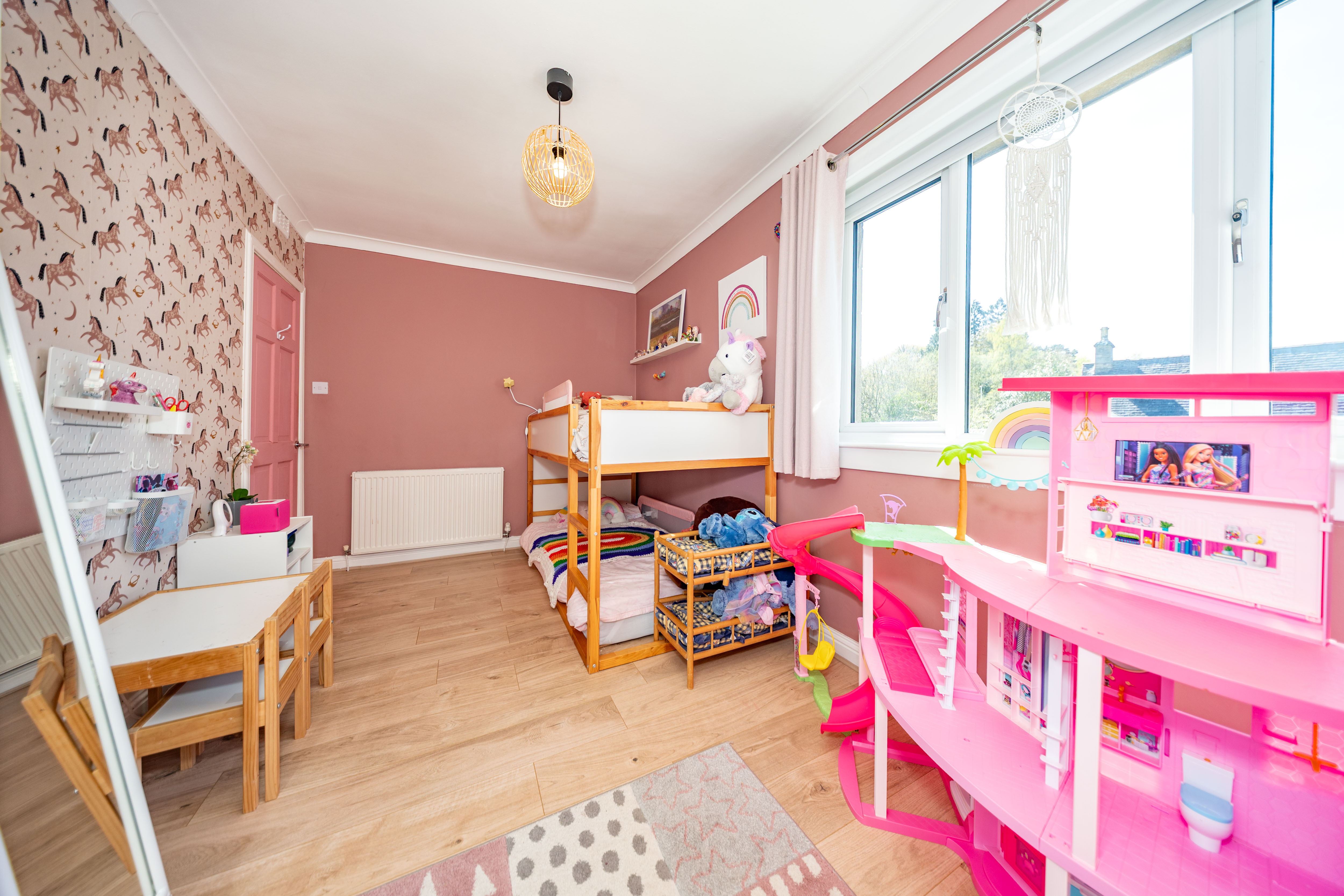 4.308m x 2.373m (14’02” x 07’10”) A generously sized room offering a bright and airy feel, with laminate flooring underfoot and a mix of painted and feature wallpapered walls, adding a touch of personality. The window enjoys a pleasant outlook over the rear garden, bringing in plenty of natural light. Finished with a radiator, power points and a ceiling pendant light, this is a well-proportioned room with flexibility for a range of uses.