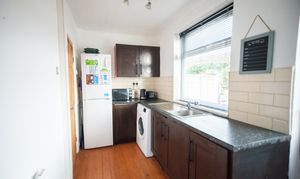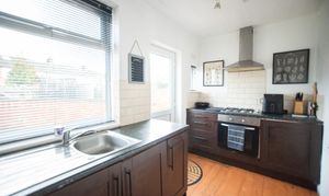 With wood flooring, shaker style kitchen units, laminate worktops, integrated oven and gas hob, stainless steel sink and tap, large window. radiator, and door to rear garden.