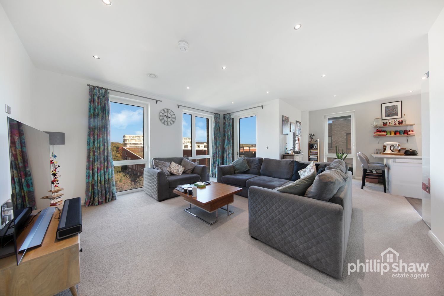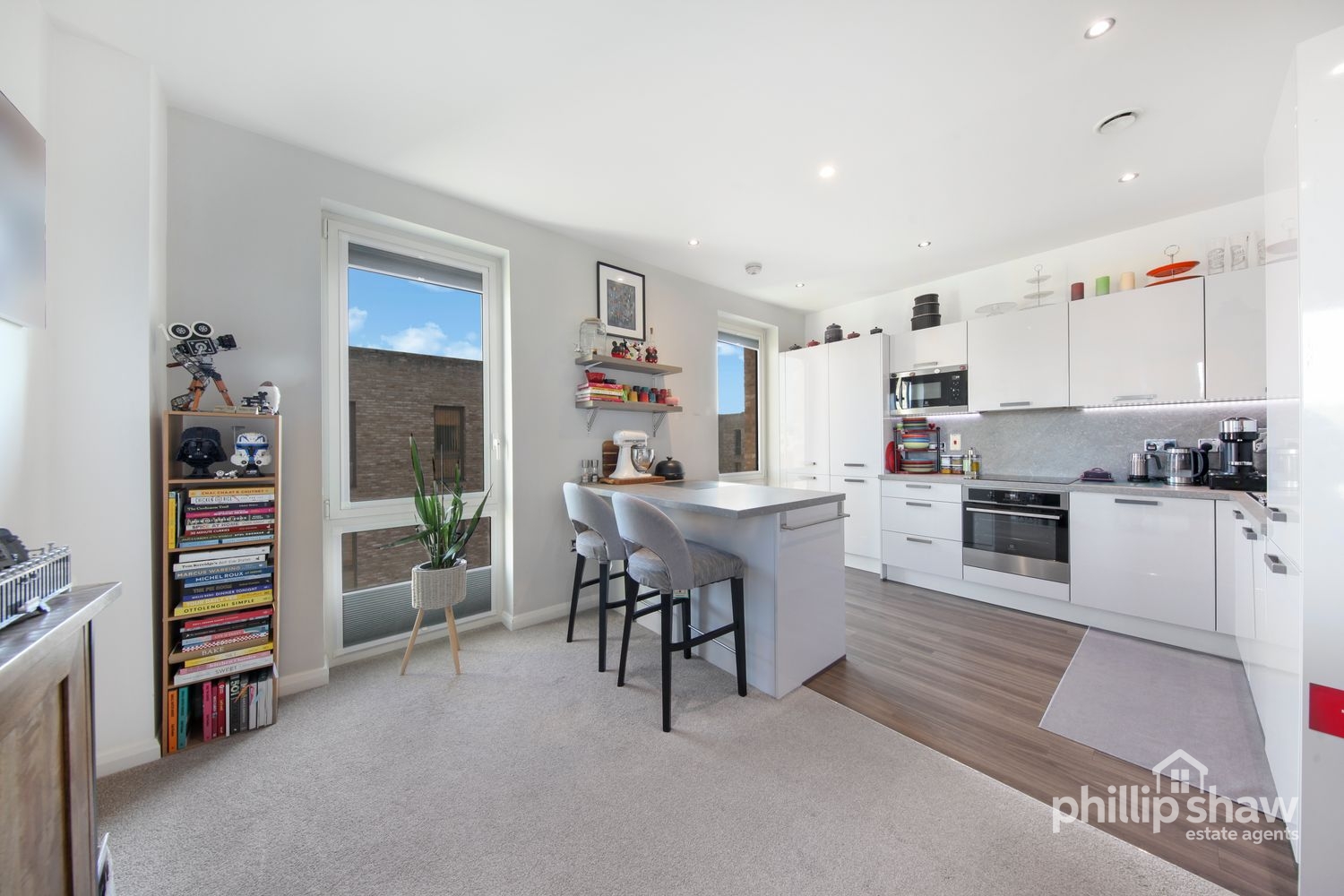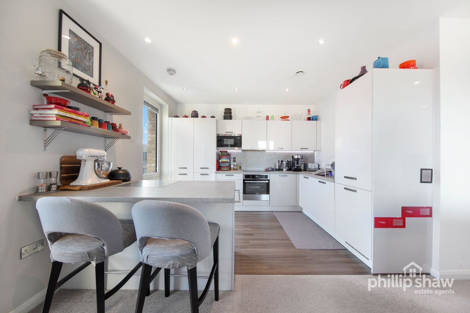 The property features floor-to-ceiling windows, allowing natural light to flood throughout, creating a bright and airy atmosphere. The generous open-plan lounge and dining area provides access to a private balcony, while the modern fitted kitchen includes a breakfast bar and comes complete with integrated appliances including AEG induction hob, AEG dishwasher, and Samsung fridge freezer, perfectly combining style and functionality.