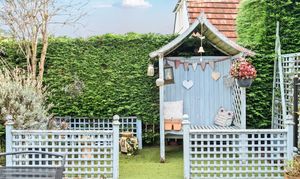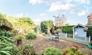 The private rear garden is mainly laid to patio with a section of lawn, bordered by hedges and featuring a useful wooden shed — perfect for outdoor dining or relaxing.