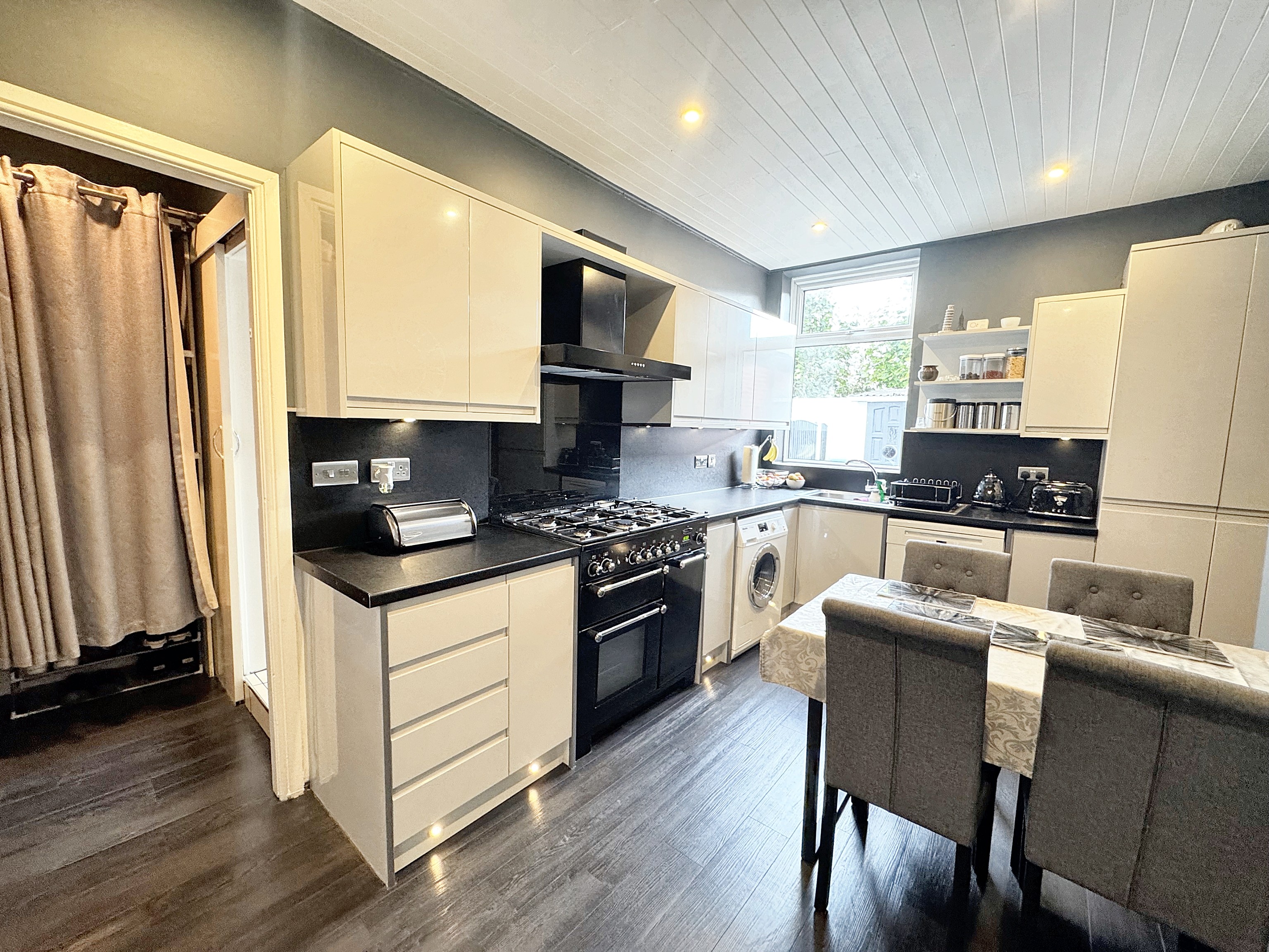 Window to the rear elevation. A range of wall and base units with contrasting work surfaces with a range cooker, extractor and freestanding appliances to be included. Spot lights. Internal door through to: