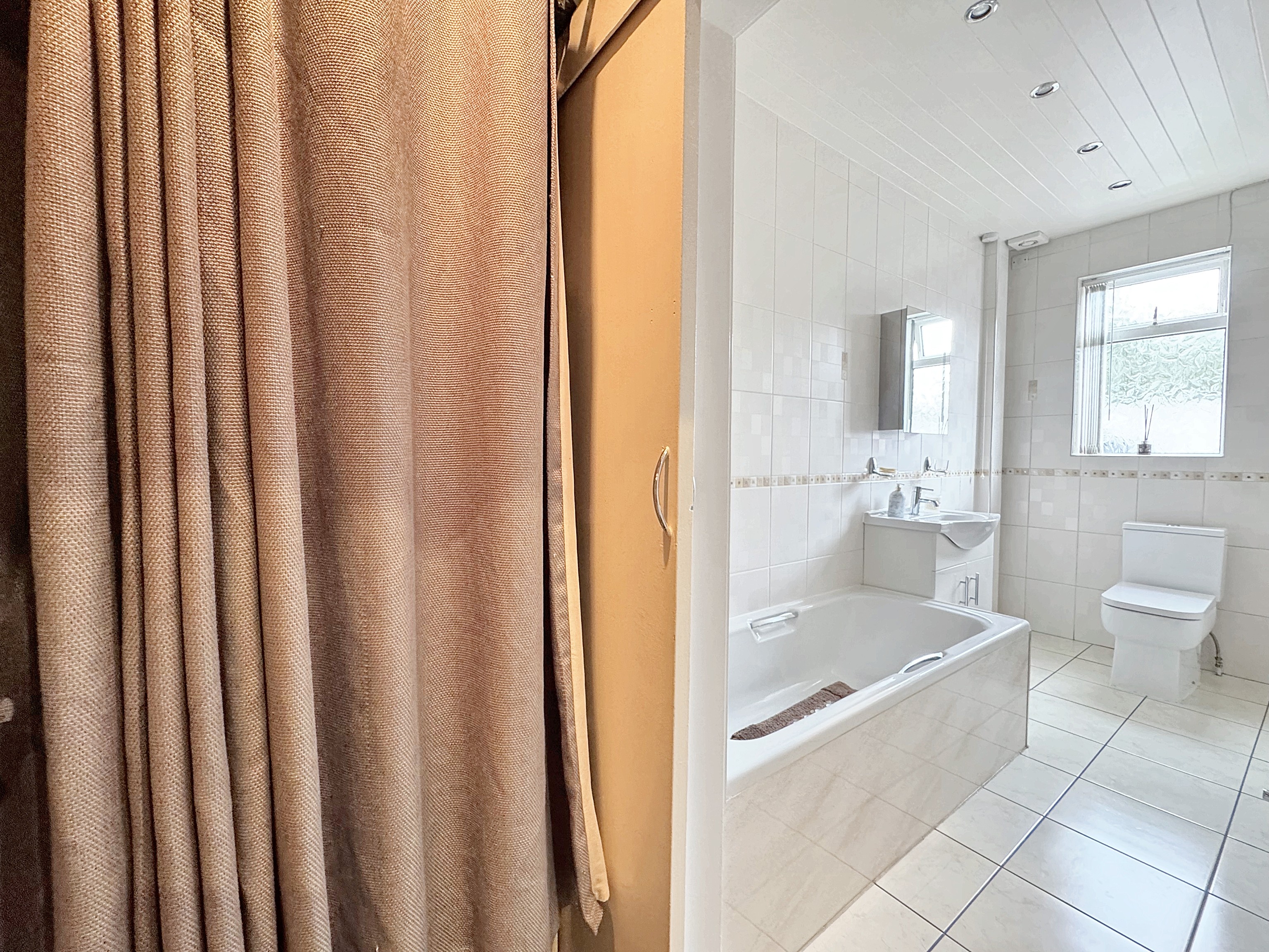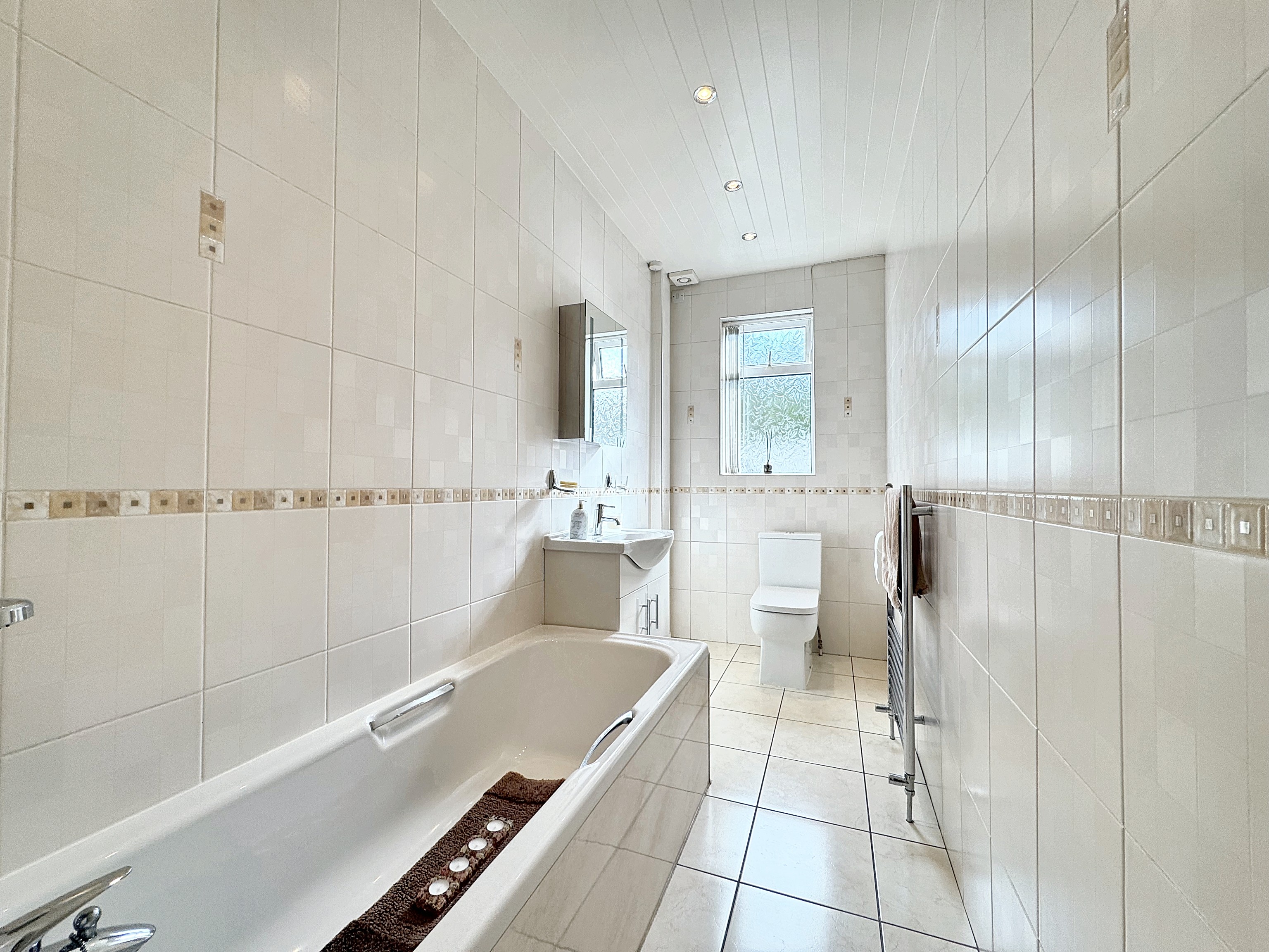Window to the rear elevation. Floor to ceiling tiled bathroom with shower over bath, low level W.C and wash basin with storage cupboard.