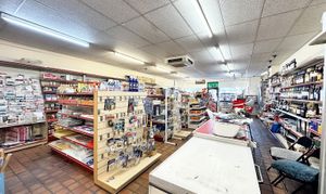 Shop front window and door to the front elevation. Rows of shelving and cabinets included. Internal door through to: