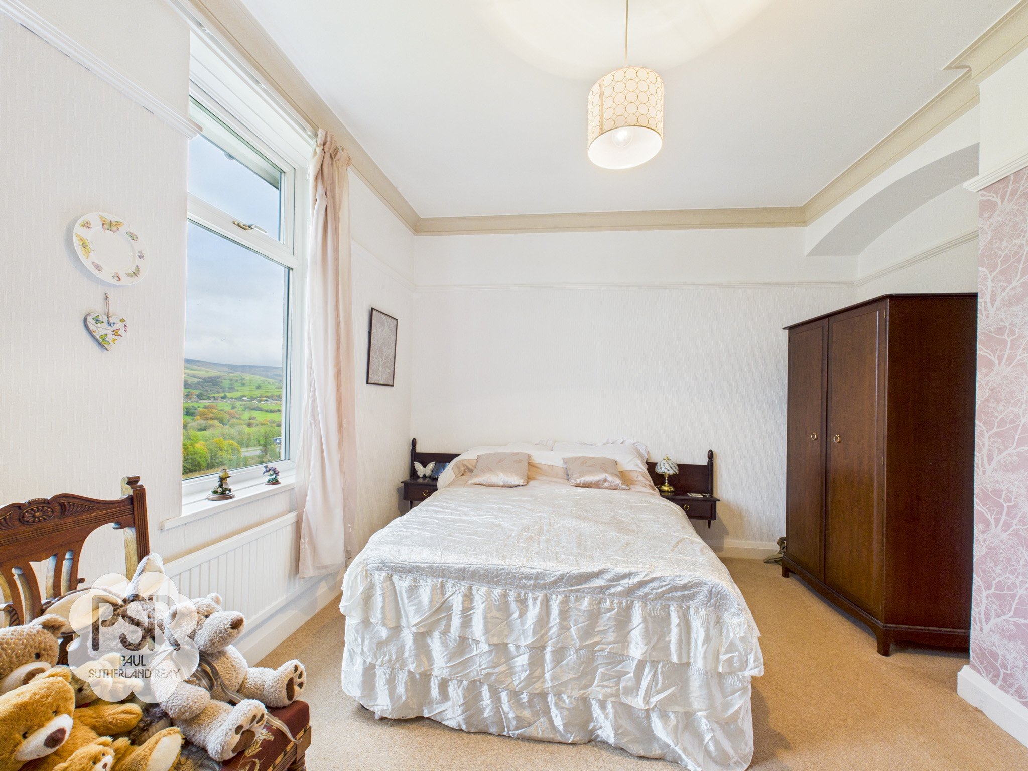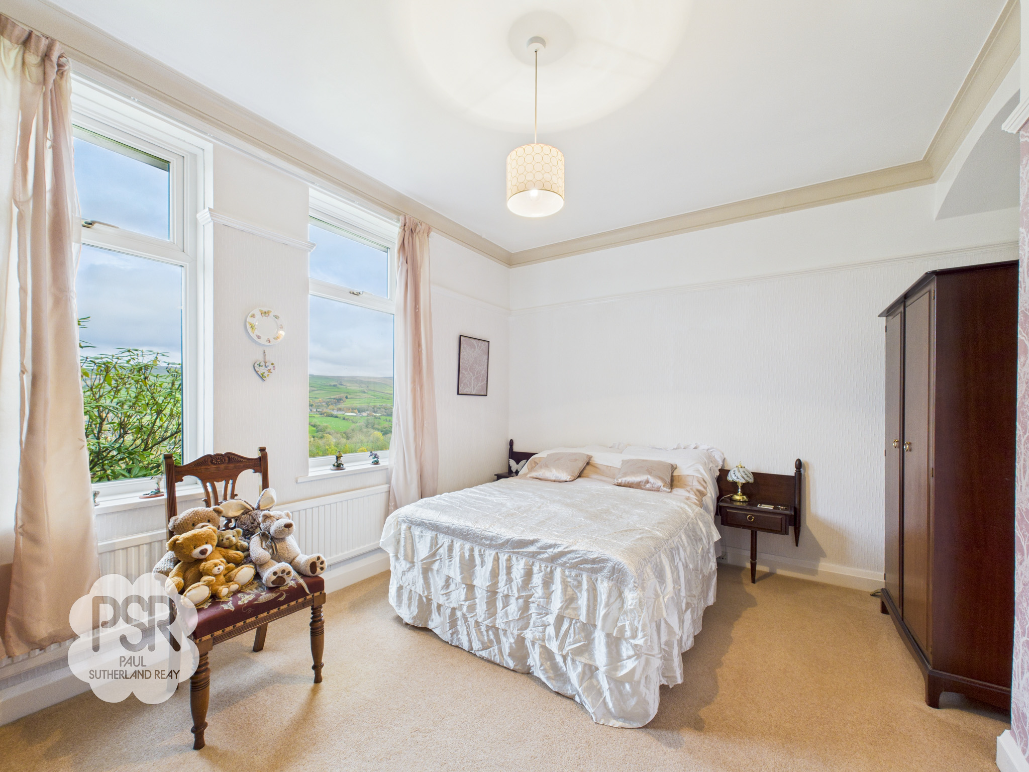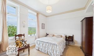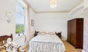 Enjoying far-reaching views towards South Head through two uPVC double-glazed rear windows, this bright and airy bedroom is finished with carpeted flooring, traditional picture rails, ceiling pendant lighting, and a radiator.