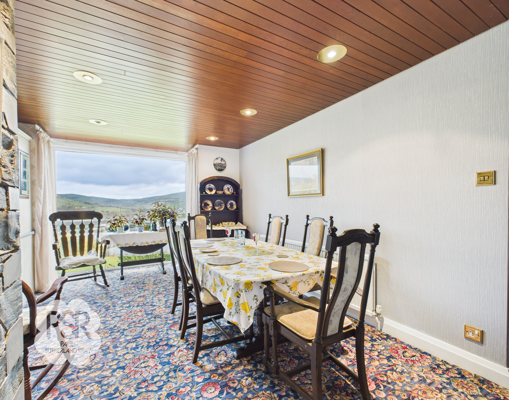 A beautifully appointed kitchen enjoying a uPVC double-glazed window to the rear elevation with stunning views towards South Head. Finished with slate-effect vinyl click tile flooring, part tiled walls with matching splashbacks, and a timber panelled ceiling with recessed spotlighting. The room is fitted with a range of matching oak-effect wall and base units complemented by granite-effect worktops and under-cabinet lighting. Features include a gas-converted Range cooker with black stainless steel extractor hood, integrated microwave and dishwasher, bespoke integrated butcher’s block, and space for a fridge freezer. An open-plan serving bar connects seamlessly to the dining area, creating a practical and sociable layout.