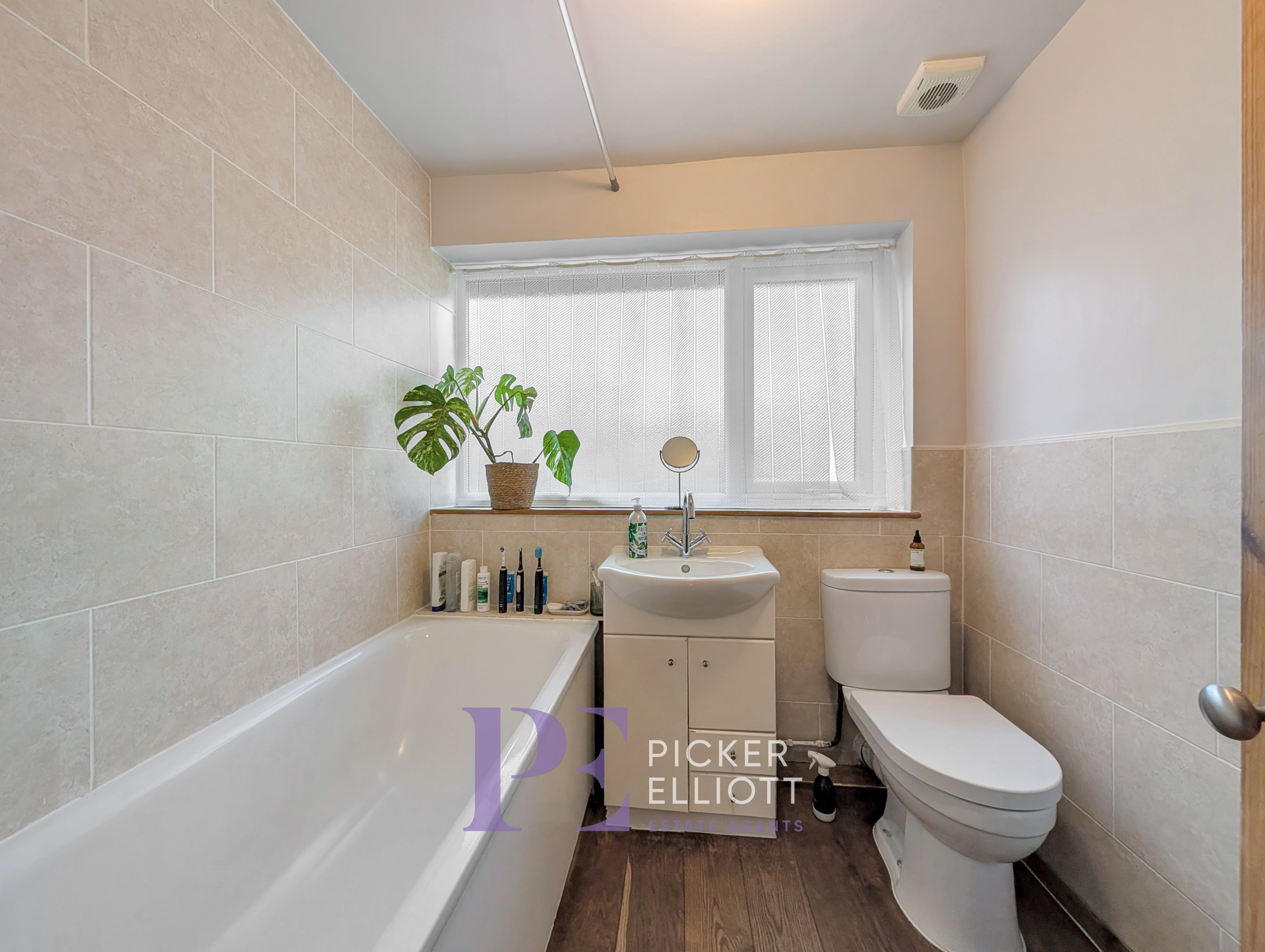 With a white suite comprising bath with shower, wash basin with vanity unity and a low-level button-flush toilet. There is a UPVC double glazed window with frosted glass, and a centrally heated towel rail.