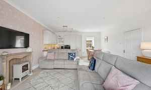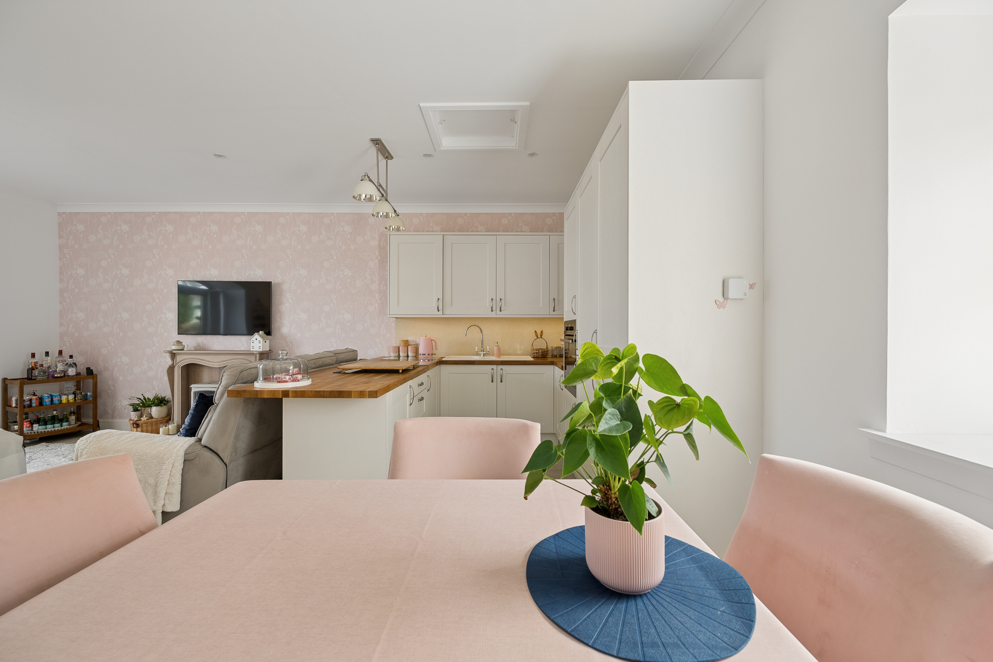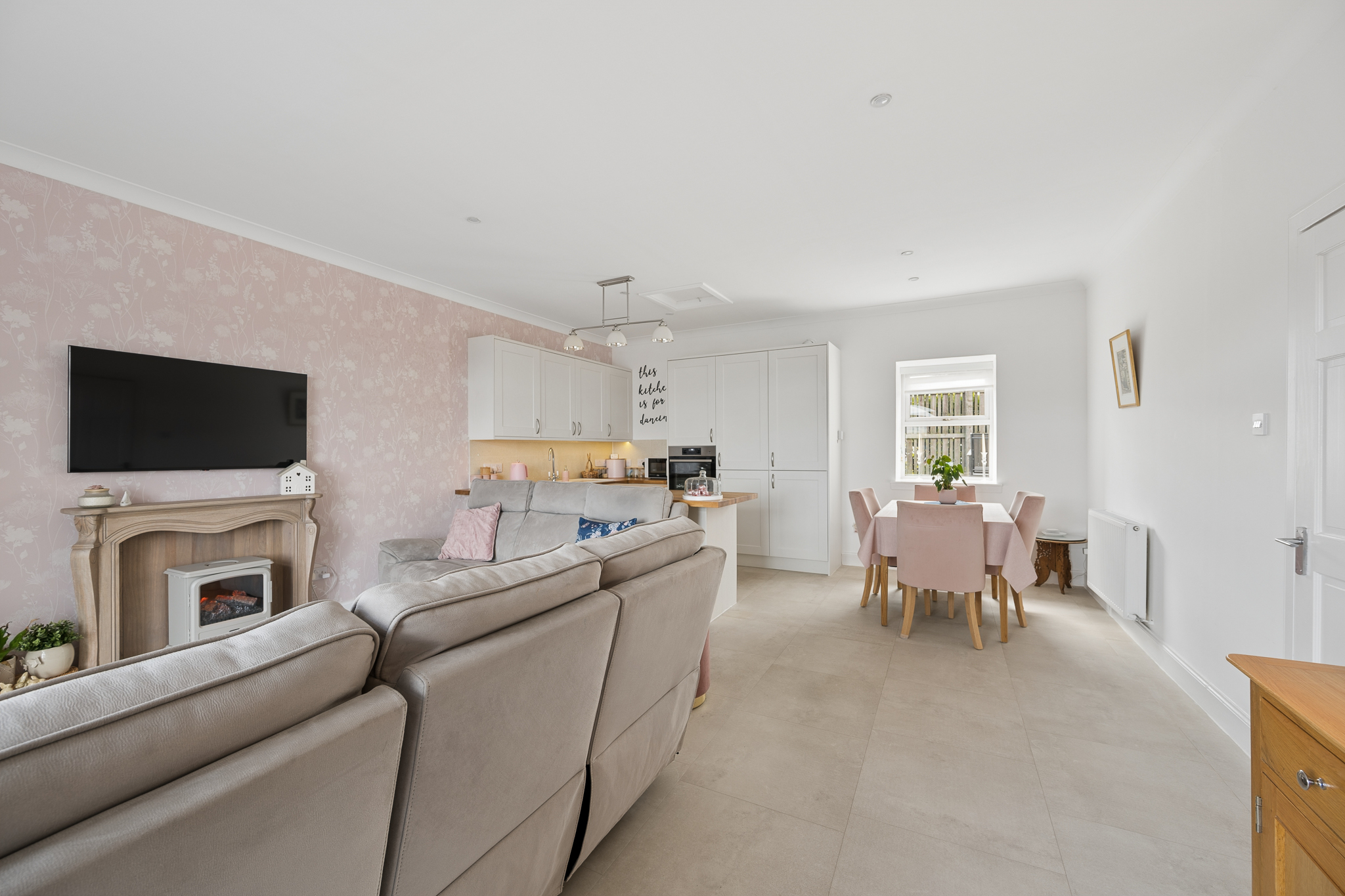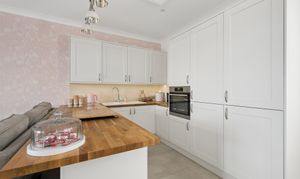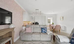 To the left, you are drawn into the impressive open plan kitchen, dining and living space, undoubtedly the heart of the home. The kitchen is beautifully designed with sleek shaker style wall and base units in a soft neutral finish, perfectly complemented by solid wood worktops that add warmth and texture. Integrated appliances and modern fittings enhance both style and functionality, while the breakfast bar provides a casual dining option and a natural divide within the space. The flooring transitions seamlessly into stylish large format tiling, adding a clean and contemporary feel throughout.