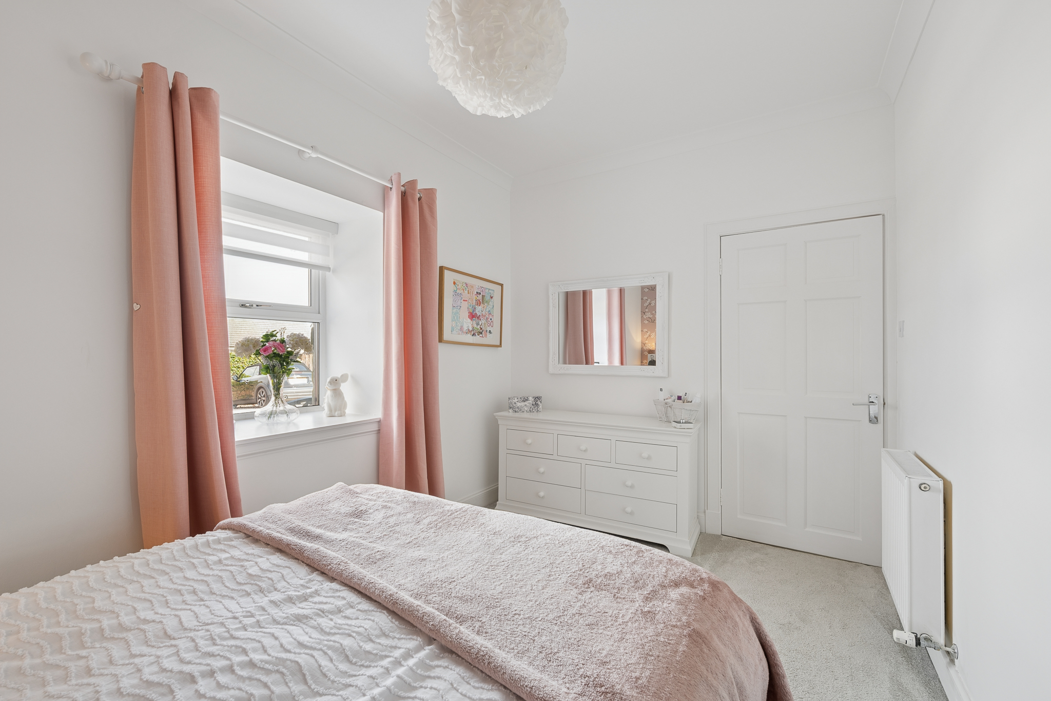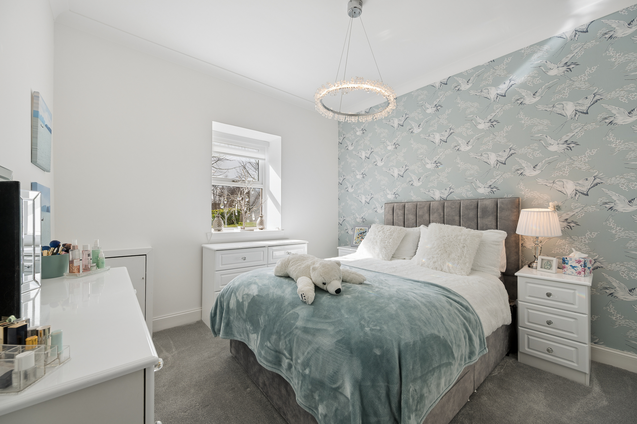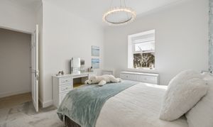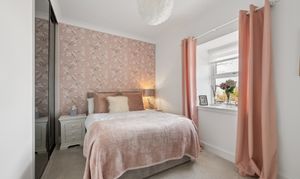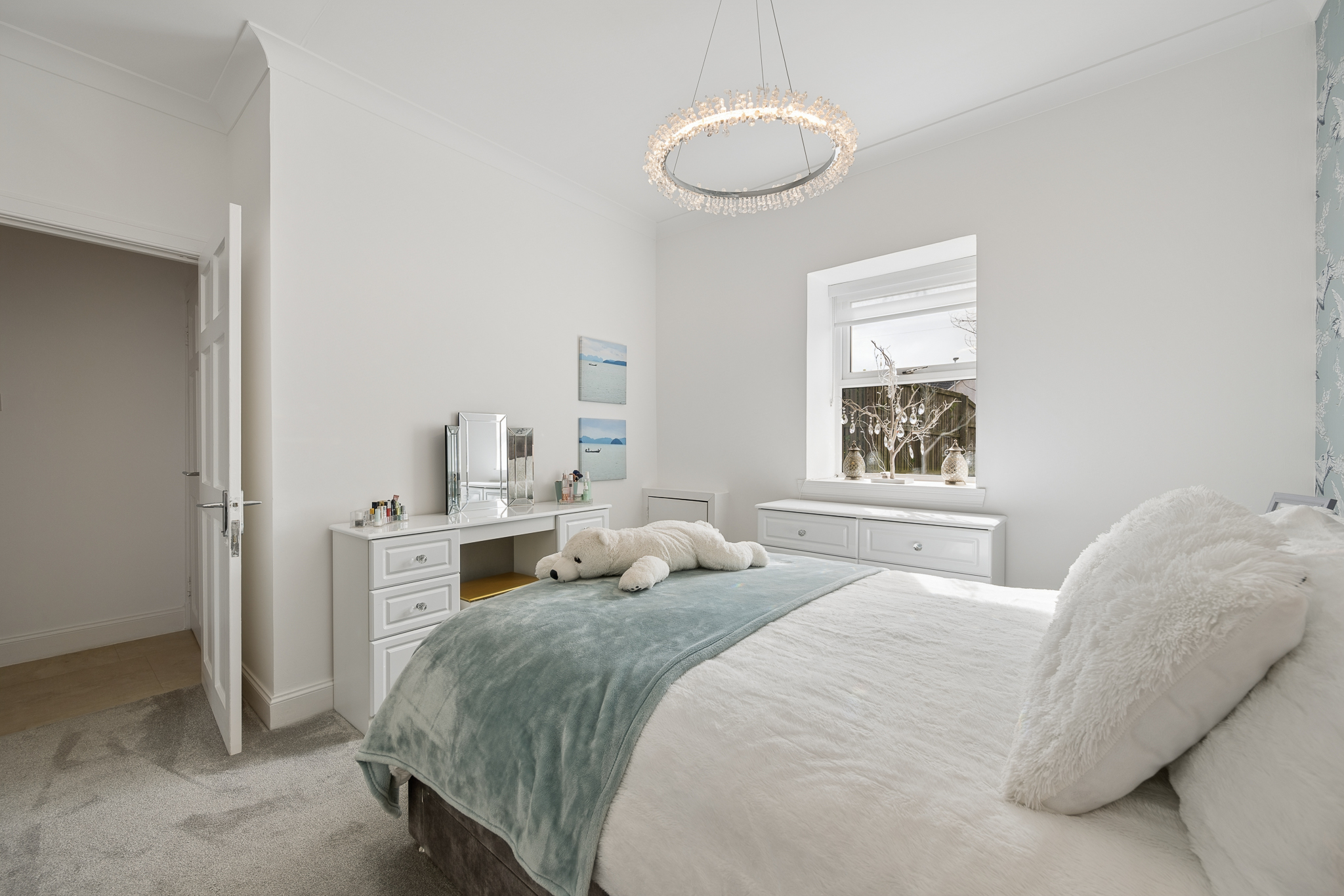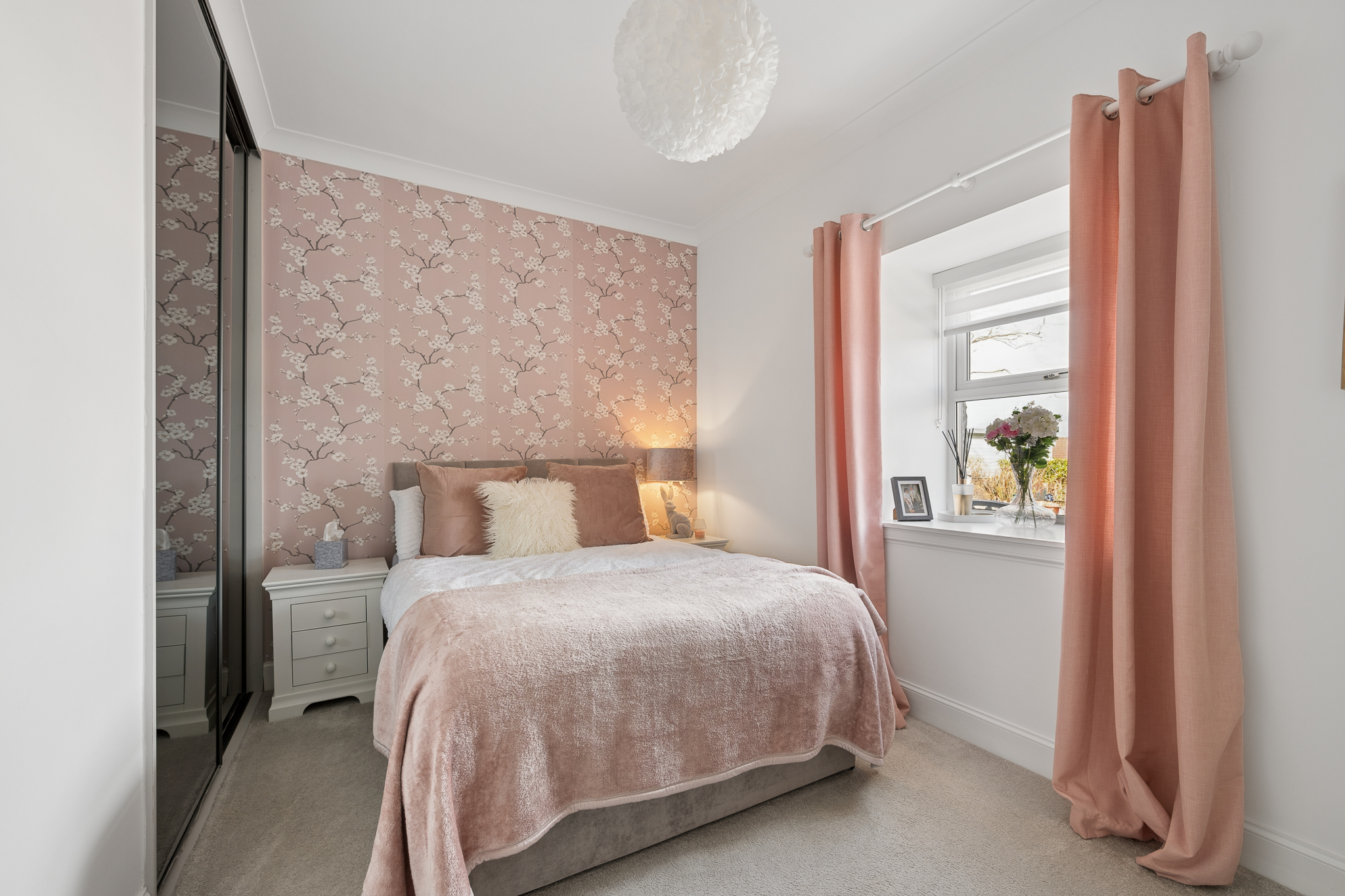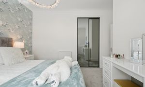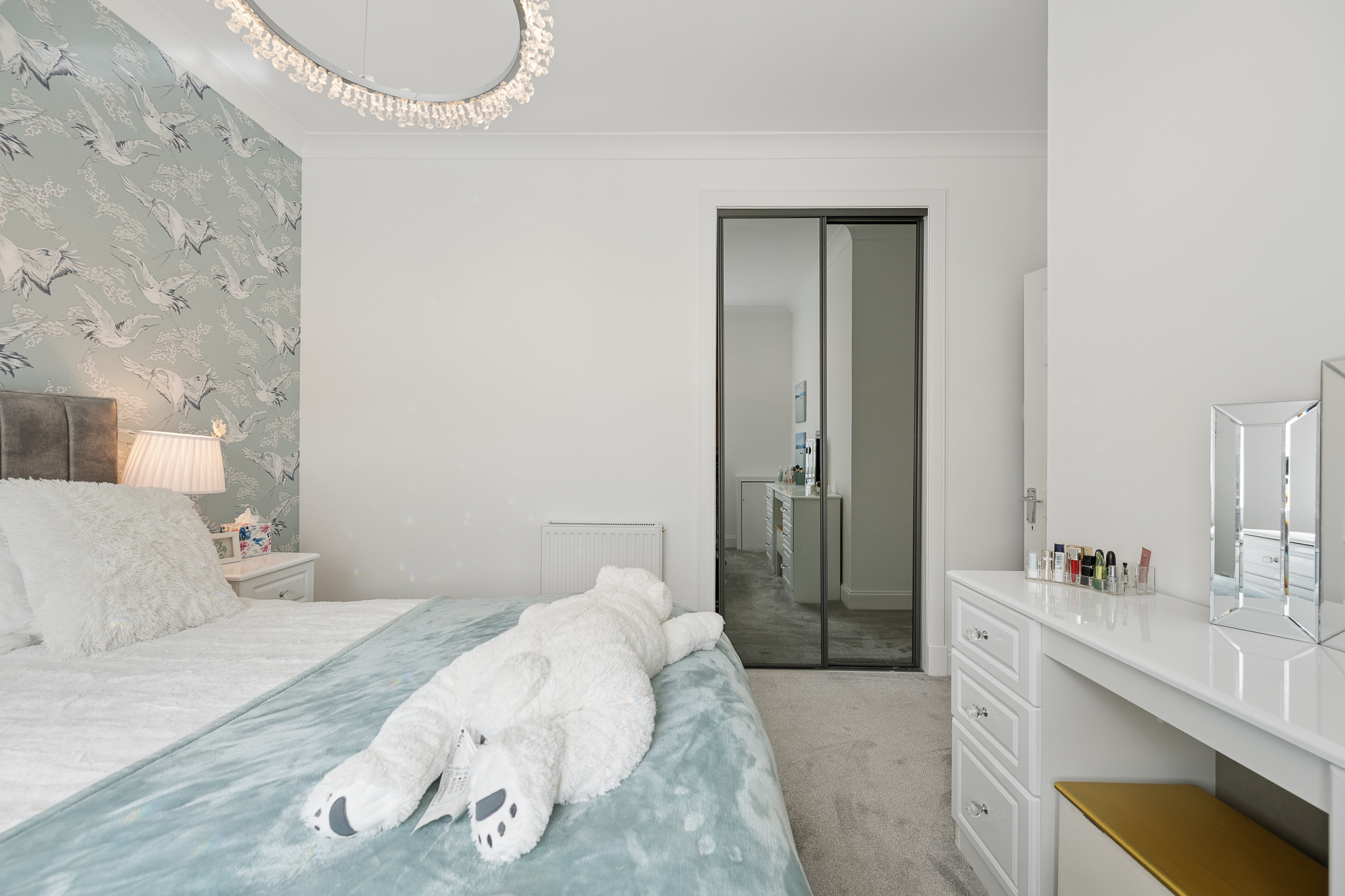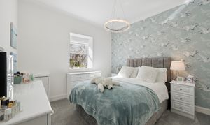 To the right of the hallway are two well appointed bedrooms, both finished to an exceptional standard with plush carpeting and tasteful décor. Each bedroom benefits from fitted wardrobes, providing excellent built in storage while maintaining a sleek and uncluttered feel. The principal bedroom is particularly spacious and enhanced by elegant feature wallpaper and statement lighting, creating a calm and luxurious retreat.