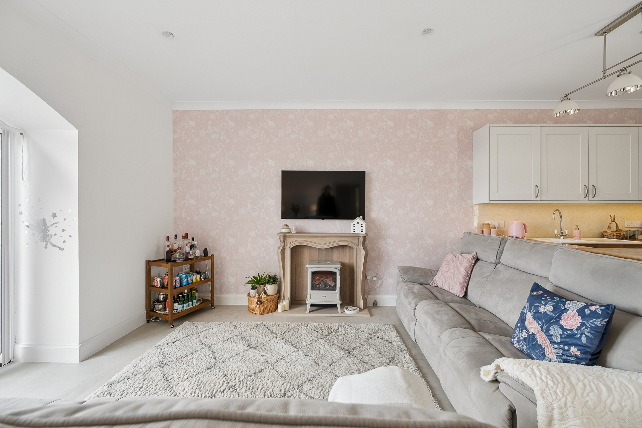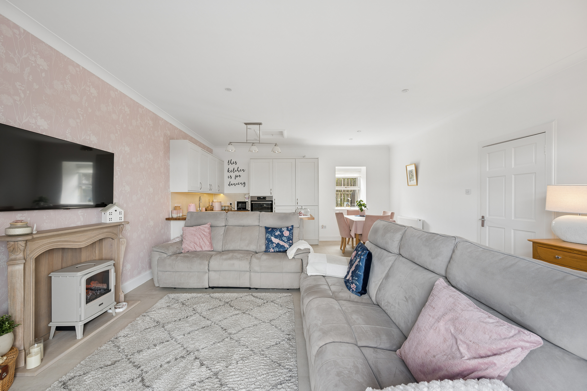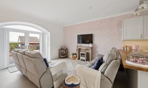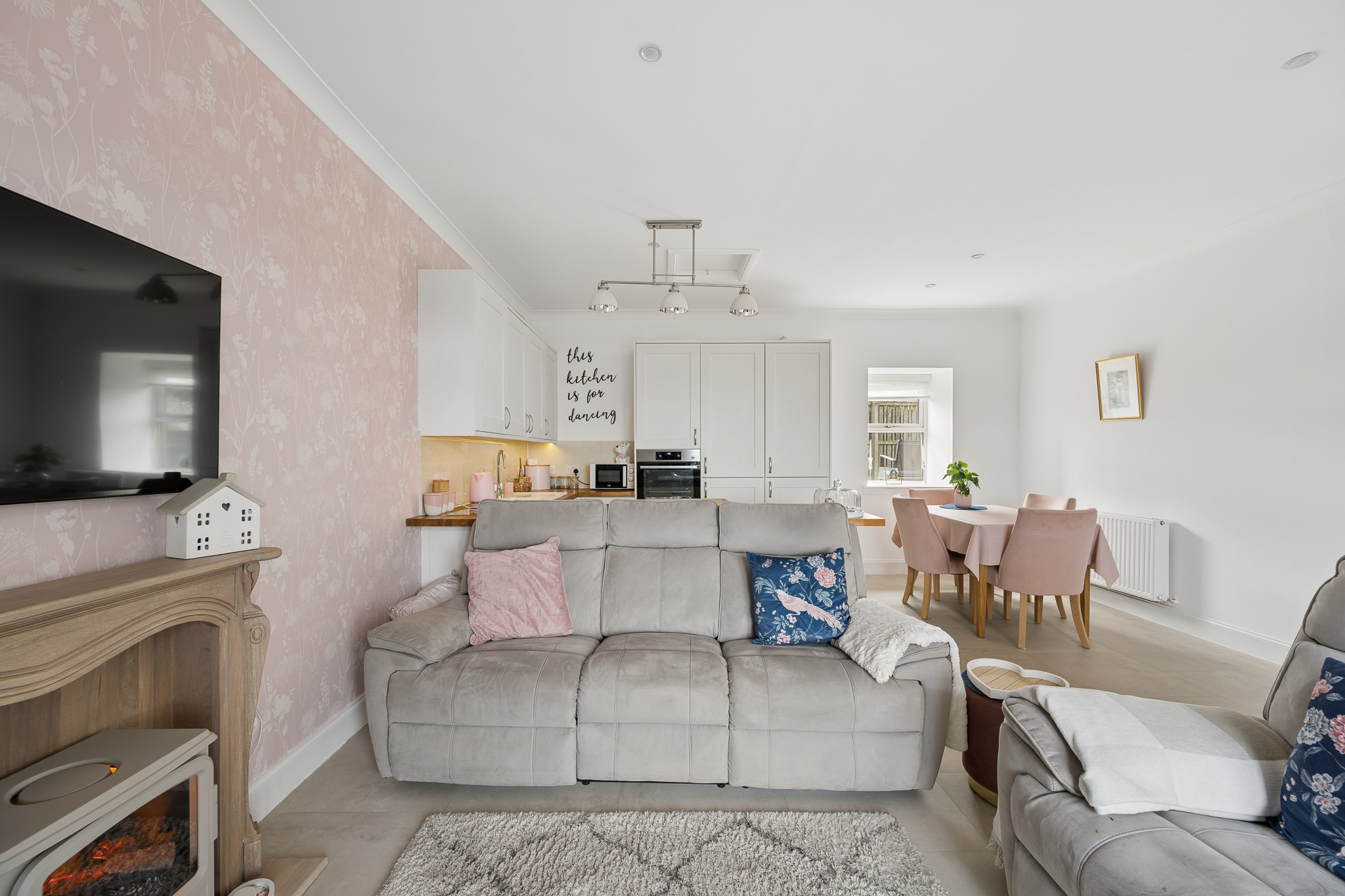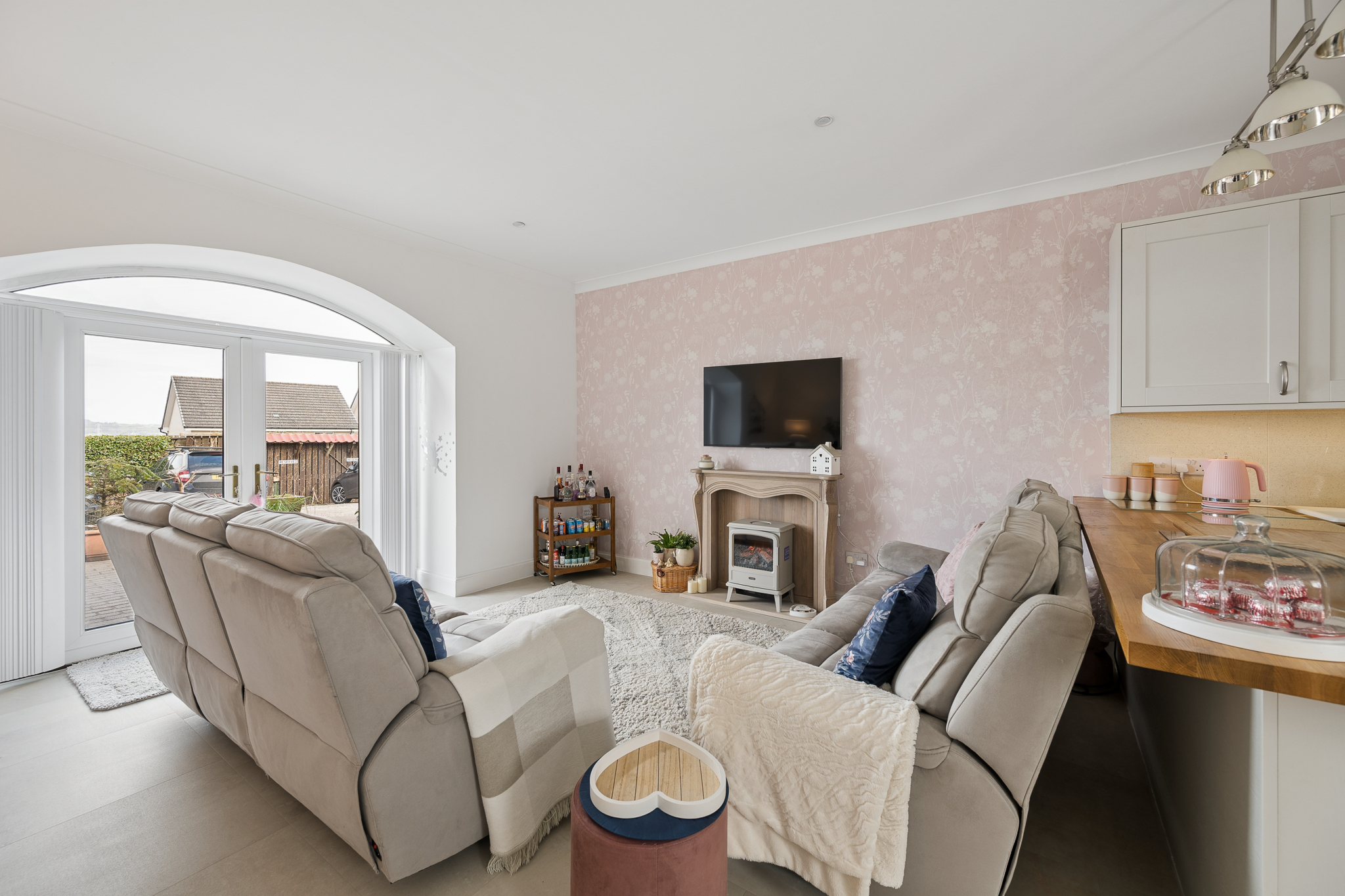 The living and dining areas are generously proportioned and flooded with natural light, enhanced by elegant décor including soft pastel feature walls and modern lighting. A charming focal fireplace creates a cosy atmosphere, while large patio doors framed by a feature arch invite the outside in, leading directly to the front patio area, perfect for relaxing or entertaining.
