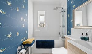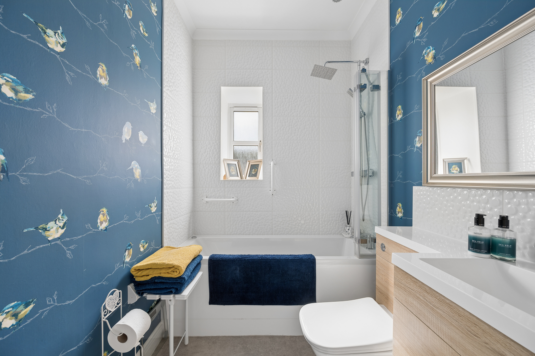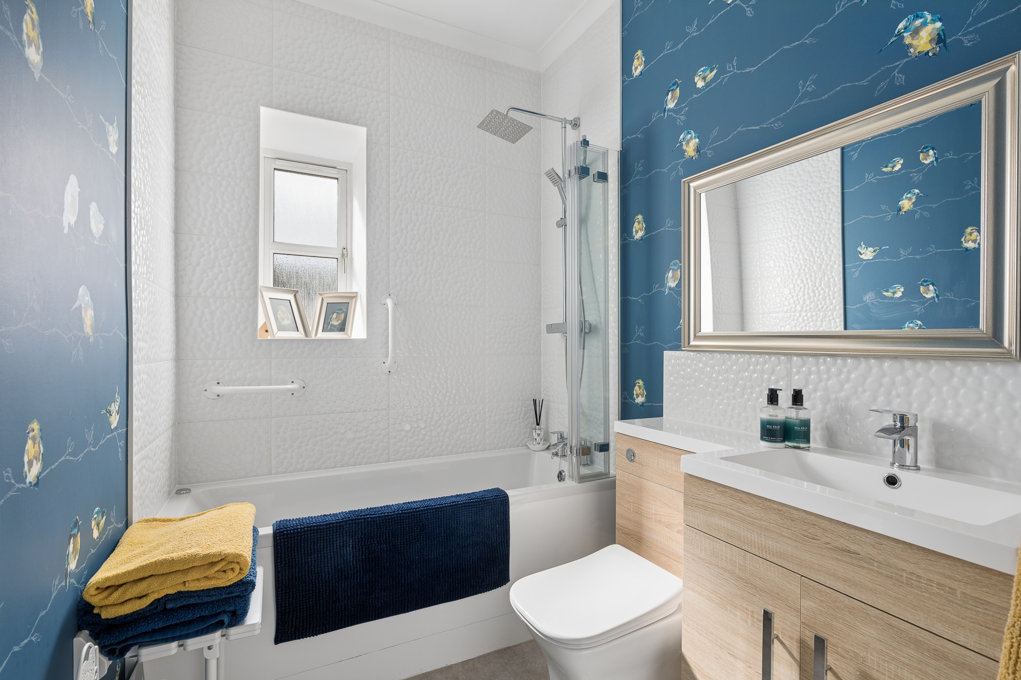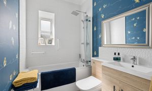 Returning to the hallway, directly ahead is the beautifully finished bathroom, featuring a modern three piece suite with a shower over a whirlpool bath, contemporary vanity unit with wood effect detailing, and stylish tiling complemented by bold feature wall décor, adding a unique and vibrant touch.
