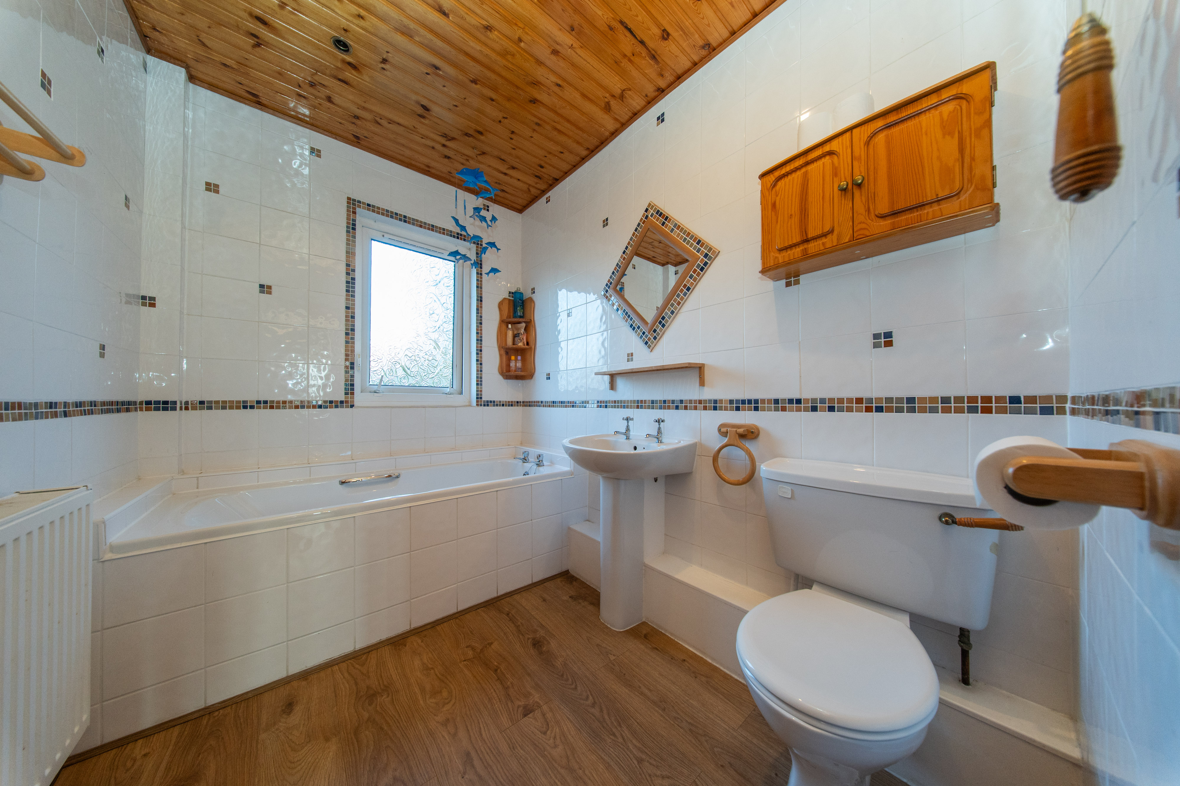 This convenient ground floor bathroom is tastefully finished with white tiled walls and laminate flooring. The suite comprises a close coupled toilet, pedestal sink, and a bath, providing a clean and functional space. Natural light streams in through a rear facing window, complemented by downlights to create a bright and welcoming atmosphere, while a radiator ensures comfort.