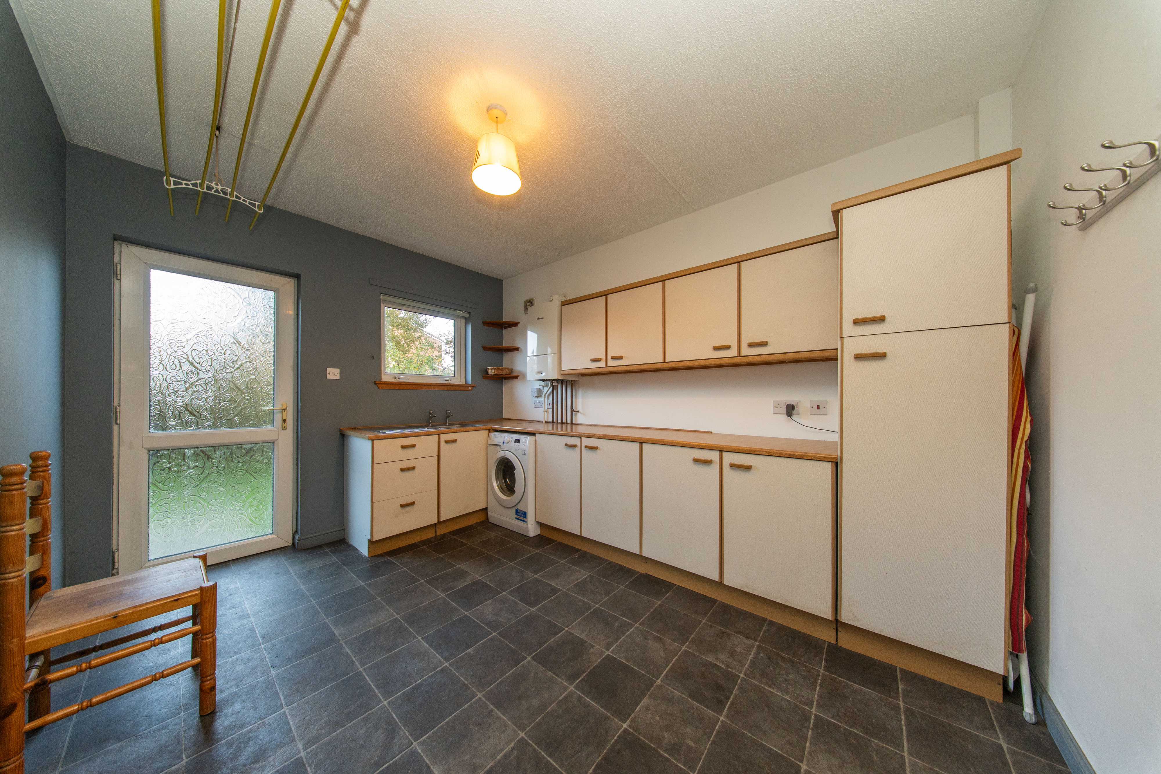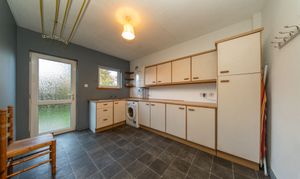 The generous utility room provides a highly practical space, featuring white and blue painted walls and black vinyl tile flooring. Ample storage is offered by a combination of floor and wall units with cream and wood fronts, complemented by a wood effect laminate work surface. There is space for an under counter washing machine, making this a functional hub for the home. A glazed upvc door offers convenient access to the rear garden, while a rear facing window allows natural light to fill the room. Internal access to the garage is also available from this space. The utility room is completed with a stainless steel sink and drainer with dual taps, an extractor fan, ceiling light, radiator, power points, and a ceiling mounted clothes hanging rail, making it both practical and versatile.