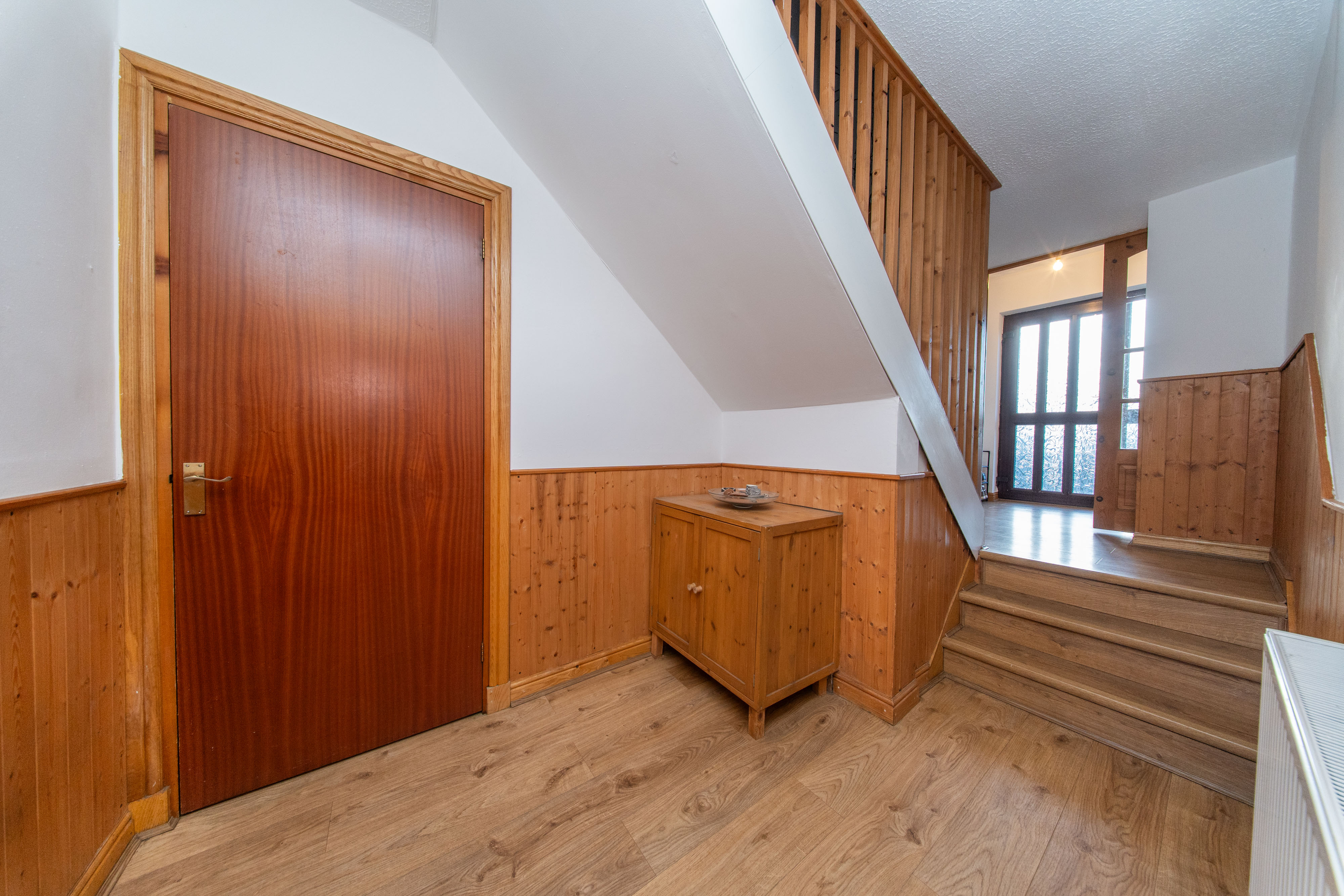 A glazed upvc door, complemented by an adjacent window, welcomes you into this bright and inviting vestibule, allowing natural light to flow in. The space features fresh white painted walls and stylish wood laminate flooring, creating a modern and airy feel. A ceiling light and power points complete this area. Decor continues into the hallway with laminate floor, half wood panelled and white painted walls. A ceiling light, a power point, a smoke detector, and a radiator add functionality and comfort.