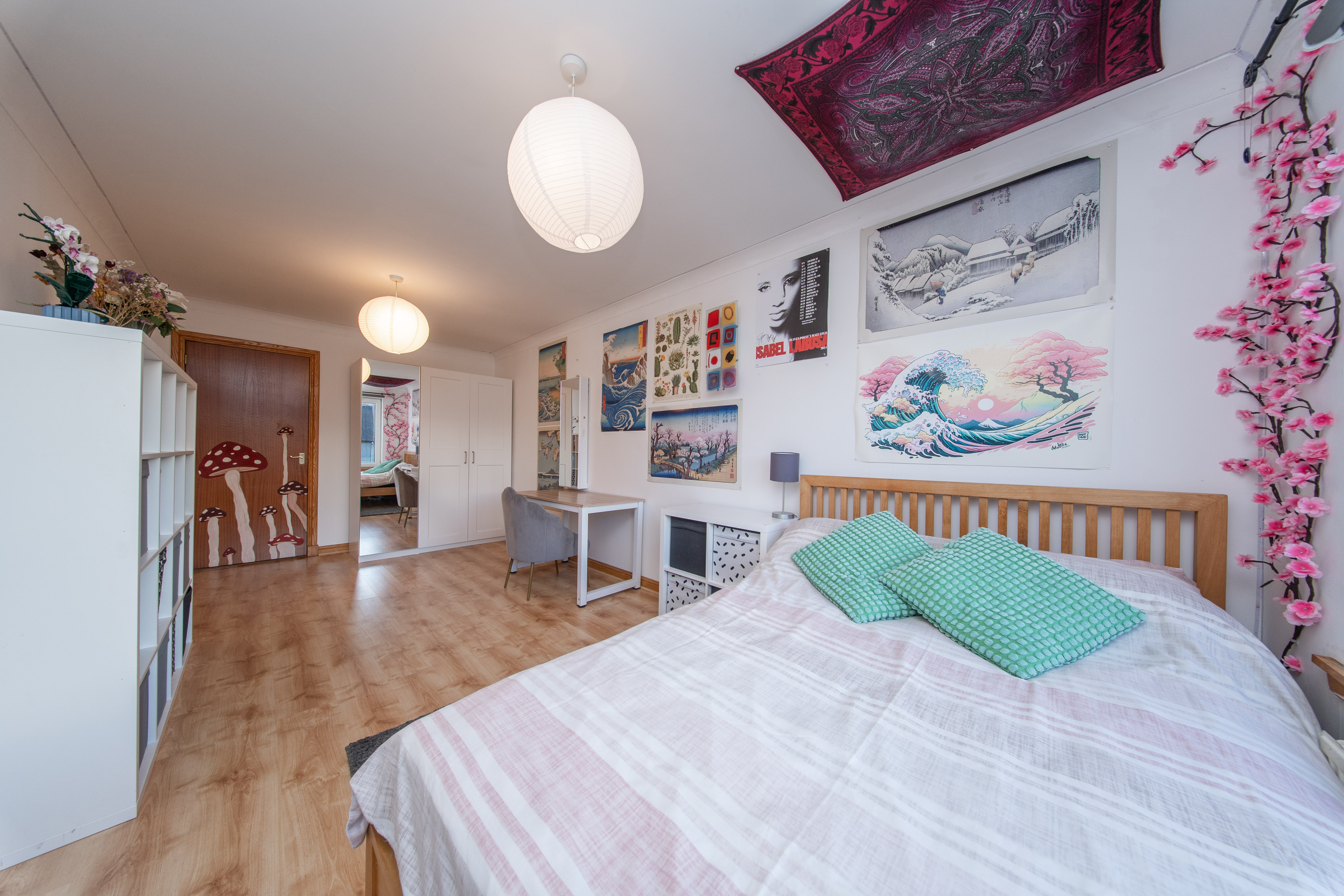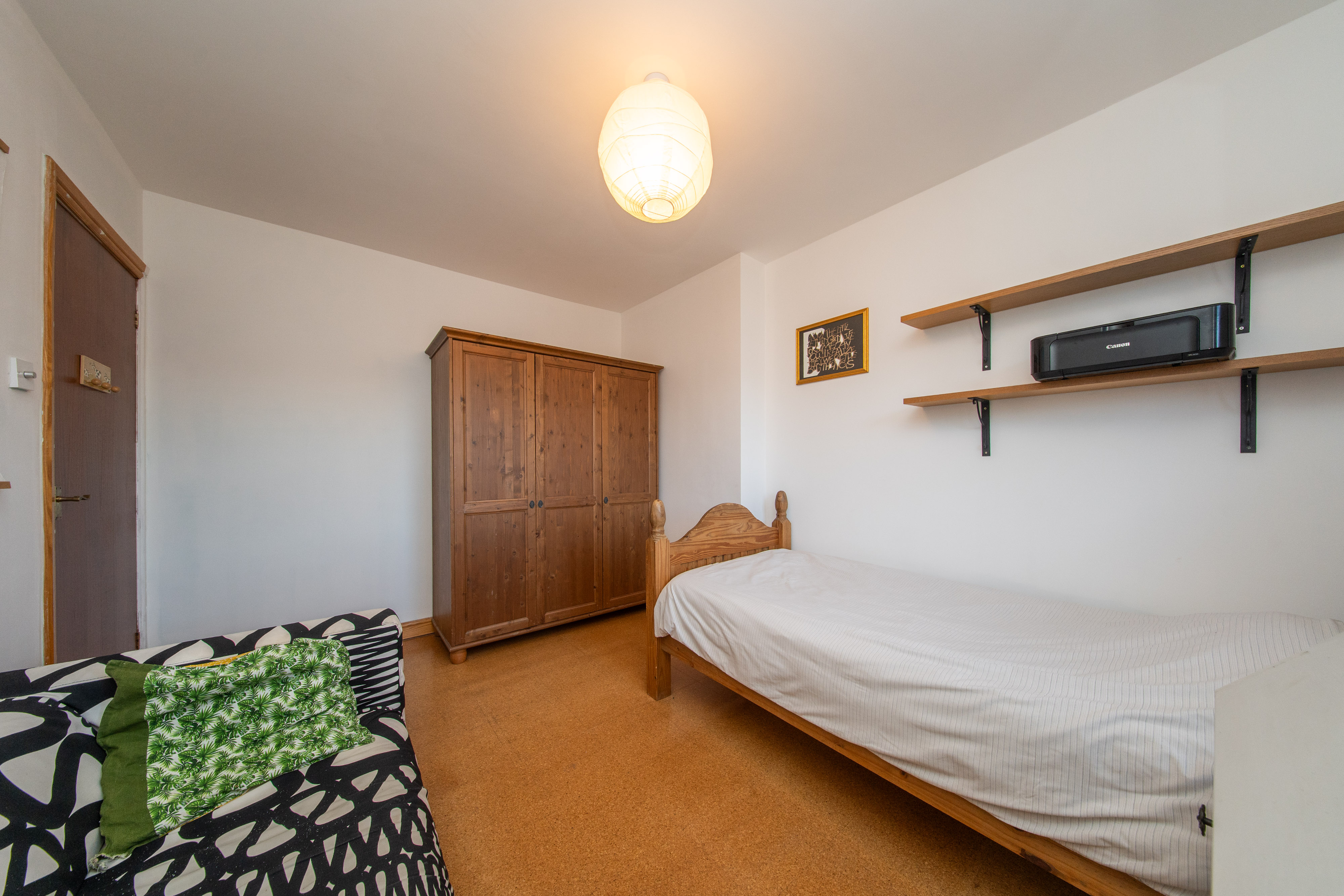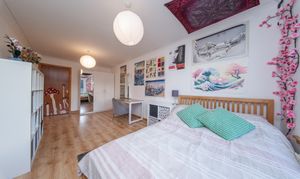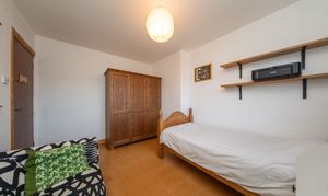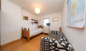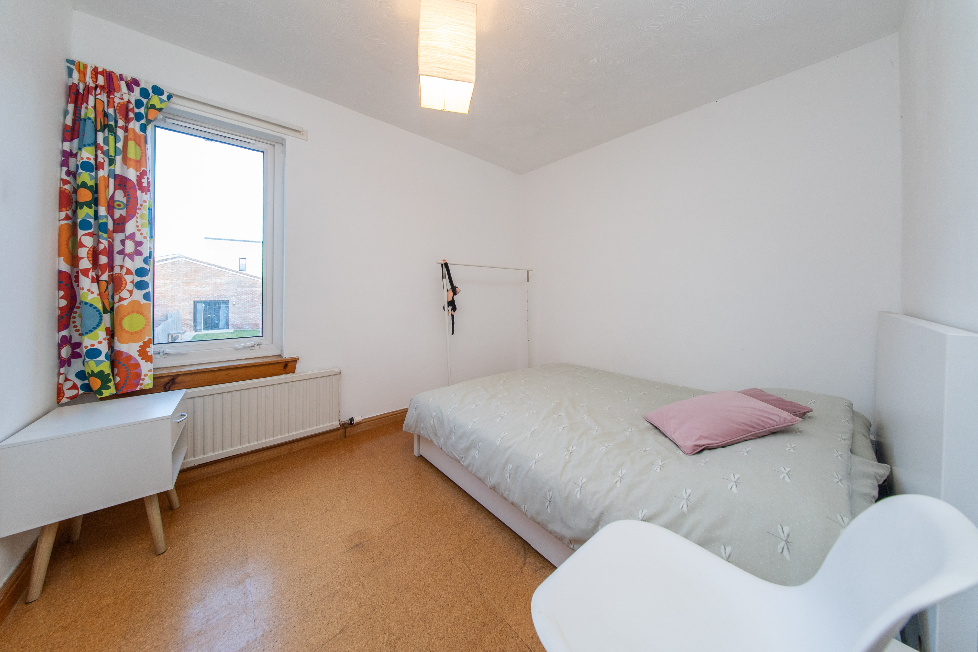 This fourth double bedroom has been finished with white walls and cork tiles to the floor. A window to the rear of the property, allows in natural light. Power points, a ceiling light and a radiator are included.
