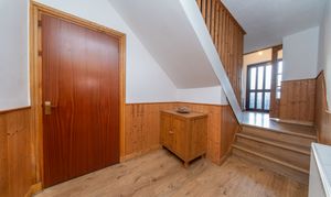 The décor seamlessly extends up the staircase, where carpeted stairs meet a laminate finished landing and white painted walls. The area is well lit by two ceiling lights and is equipped with a smoke detector, power points and an attic hatch.