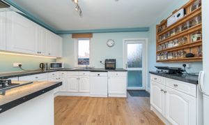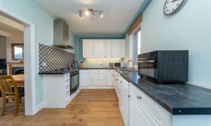 This practical kitchen features a combination of wall and floor units with white fronts, complemented by sleek black work surfaces. Tastefully decorated with two tone turquoise walls, a tiled splashback, and continued laminate flooring, the room offers a modern and inviting atmosphere. The kitchen comes complete with built-in appliances, including an under counter oven, four ring gas hob, and a stainless steel and glass extractor hood, all included in the sale. There is ample space for a tall fridge freezer and an under counter dishwasher. A stainless steel sink with drainer and mixer tap completes the practical and contemporary setup. Natural light floods the space through the rear window and glazed upvc door, which provides direct access to the garden. Completing the room are a ceiling light, under unit lighting, a heat detector, and power points.