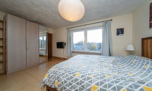 This delightful room features magnolia painted walls and cork tile flooring. It boasts an integrated cupboard, offering shelving space. The room is bathed in natural light from a large window to the front of the property, further enhanced by a ceiling light. The space provides a radiator and power points.