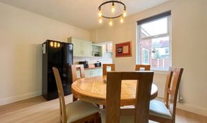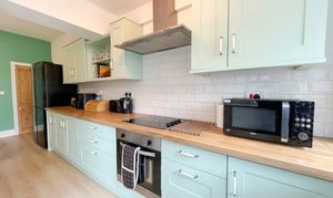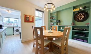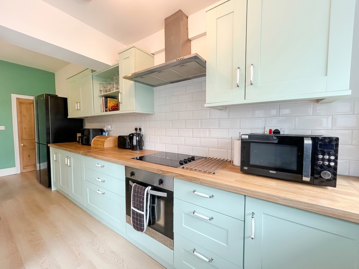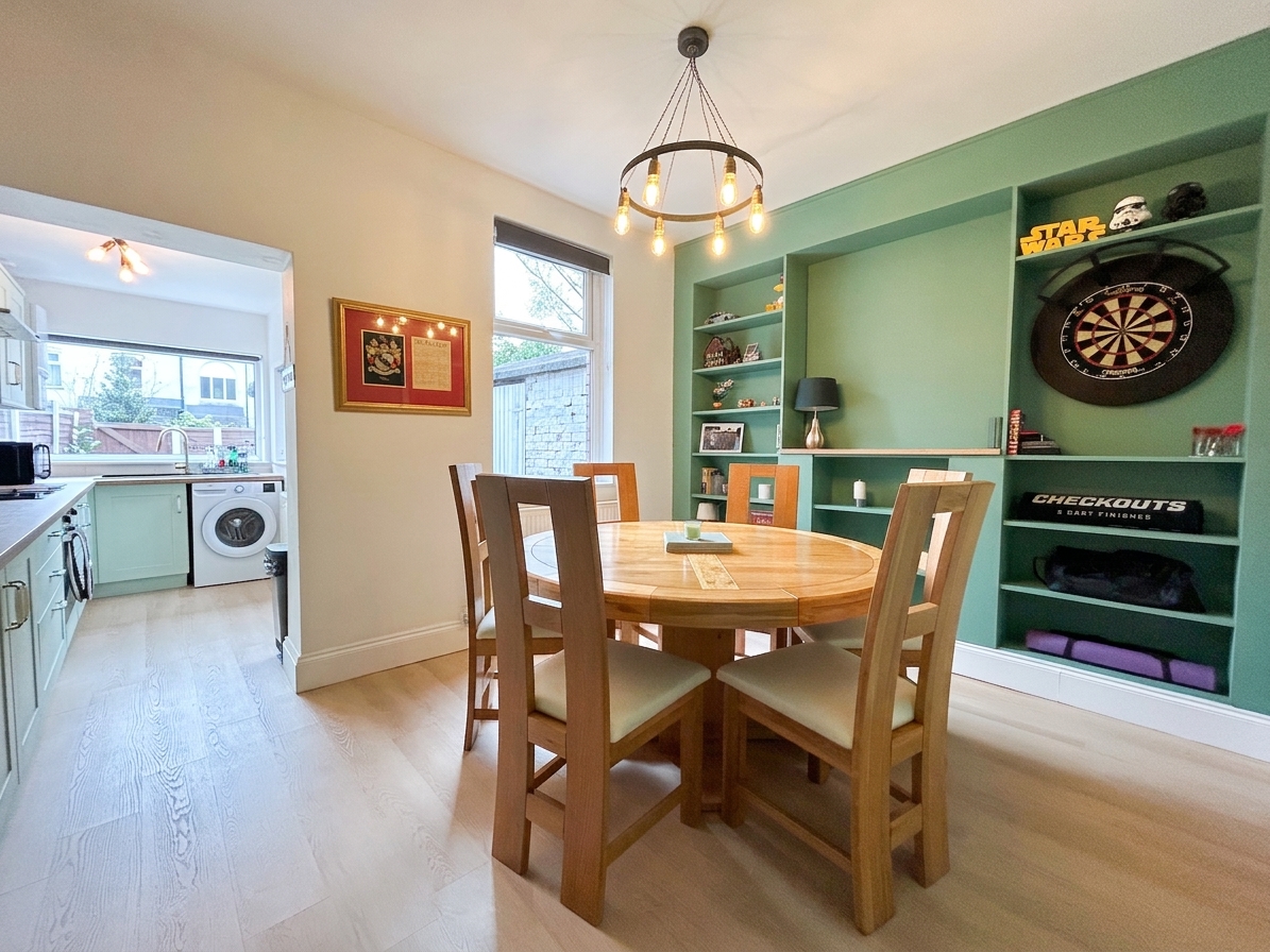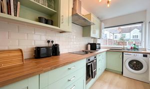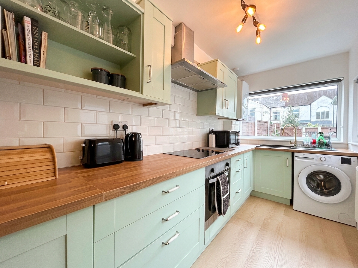 Dual aspect window to rear and side elevations. Fitted with a range of modern wall and base units with contrasting worktops completed with; hob, oven, extractor, space for fridge freezer and space for washing machine. External door to side elevation leading to garden patio.