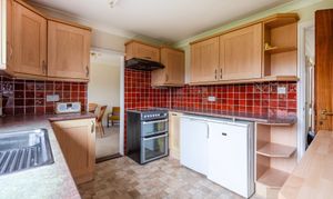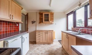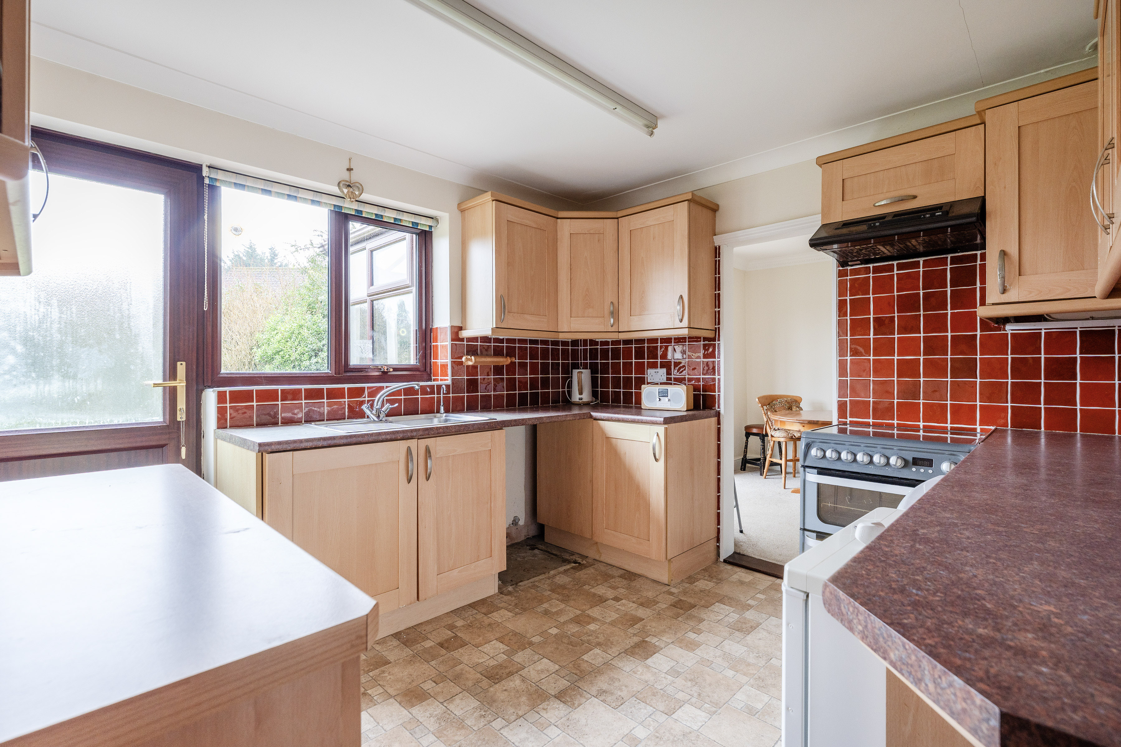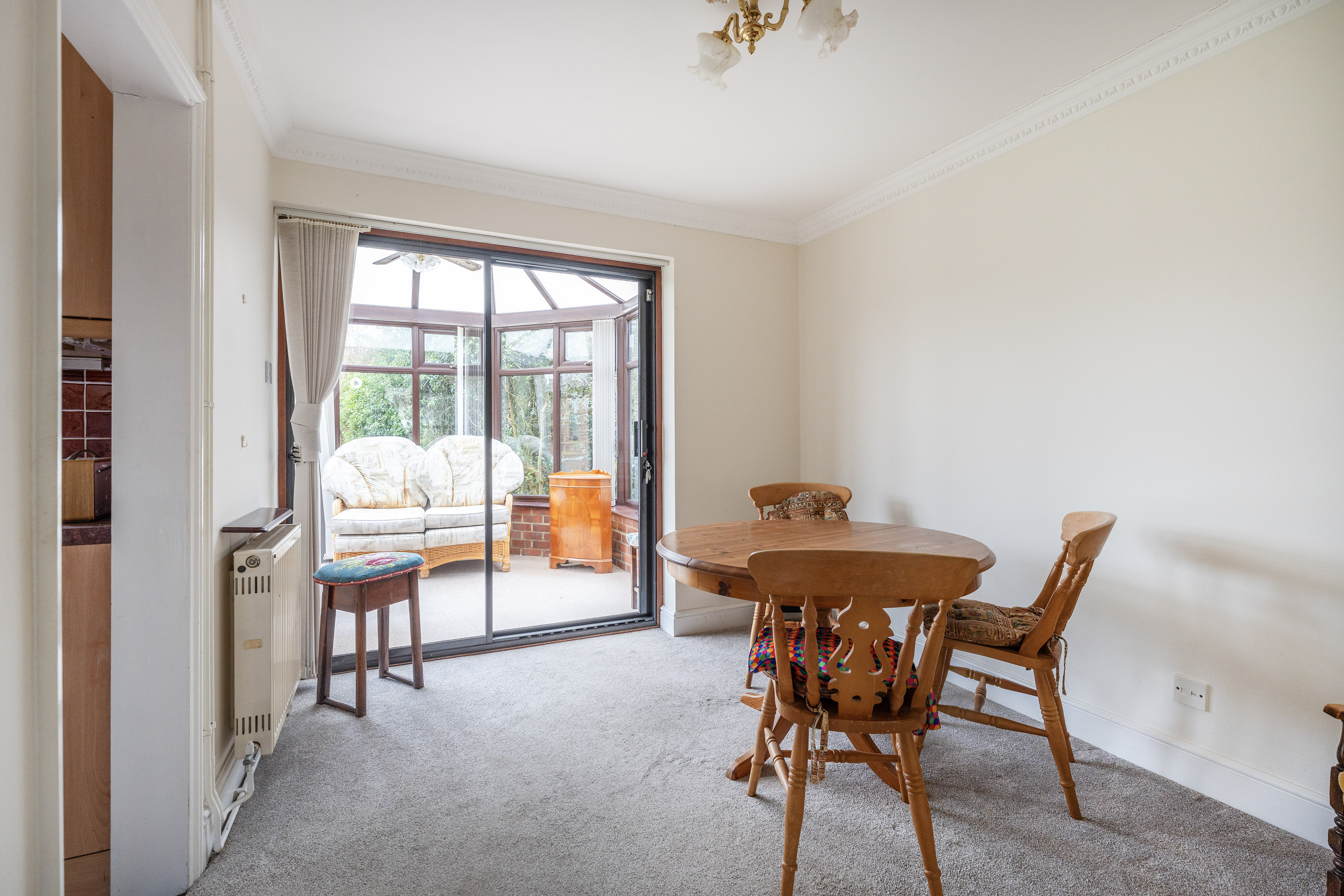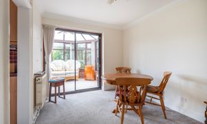 Internal double doors open into the dining room, creating a natural flow through the home. From here, there is direct access into the kitchen, fitted with cabinetry, a freestanding oven and under-counter space ready for your own appliances. Sliding doors lead from the dining room into the conservatory, where panoramic views across the garden invite you to slow down and enjoy the changing seasons.