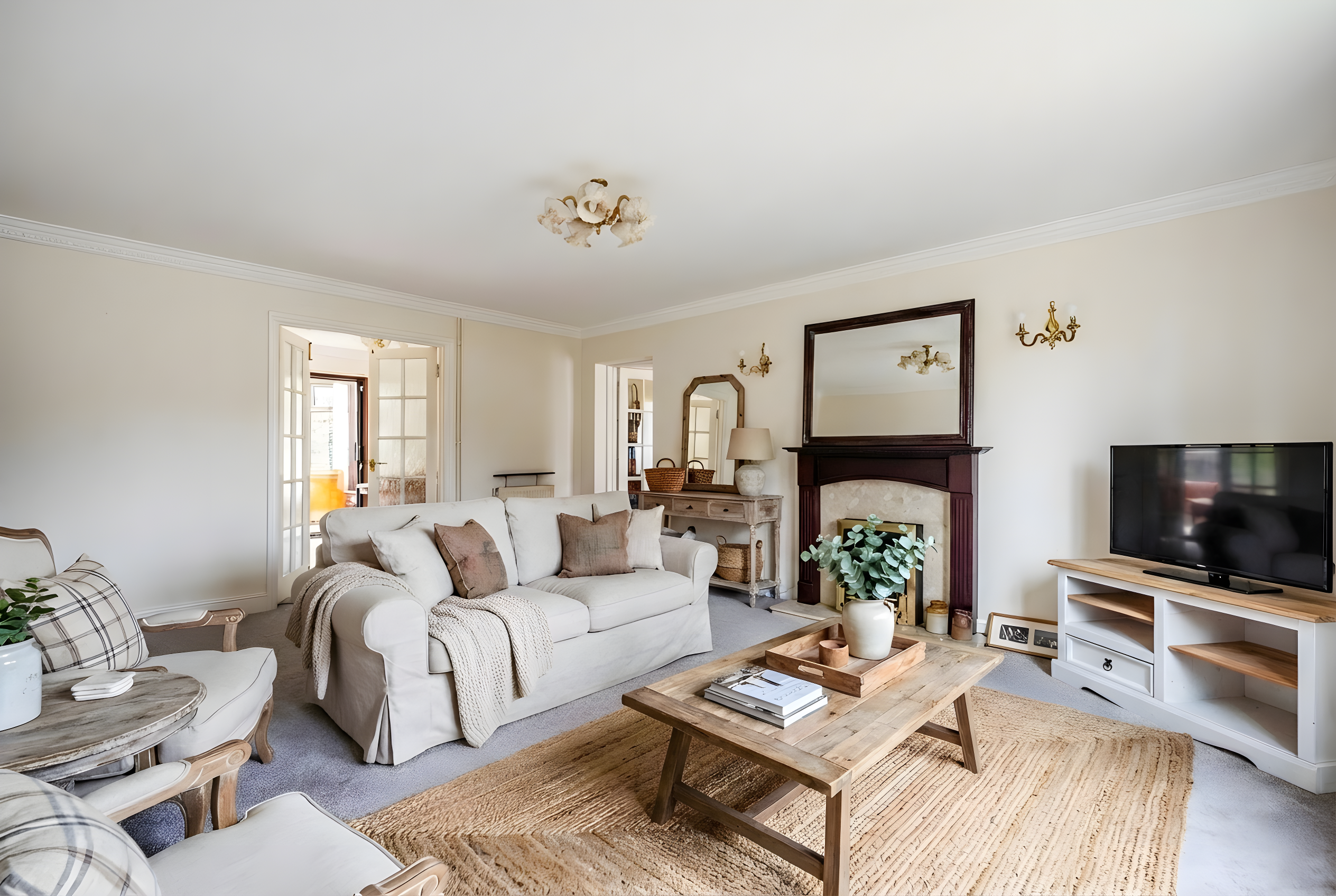 - Internal double doors that open into the dining room, with easy access into the kitchen and sliding doors into the conservatory, offering panoramic views of the garden