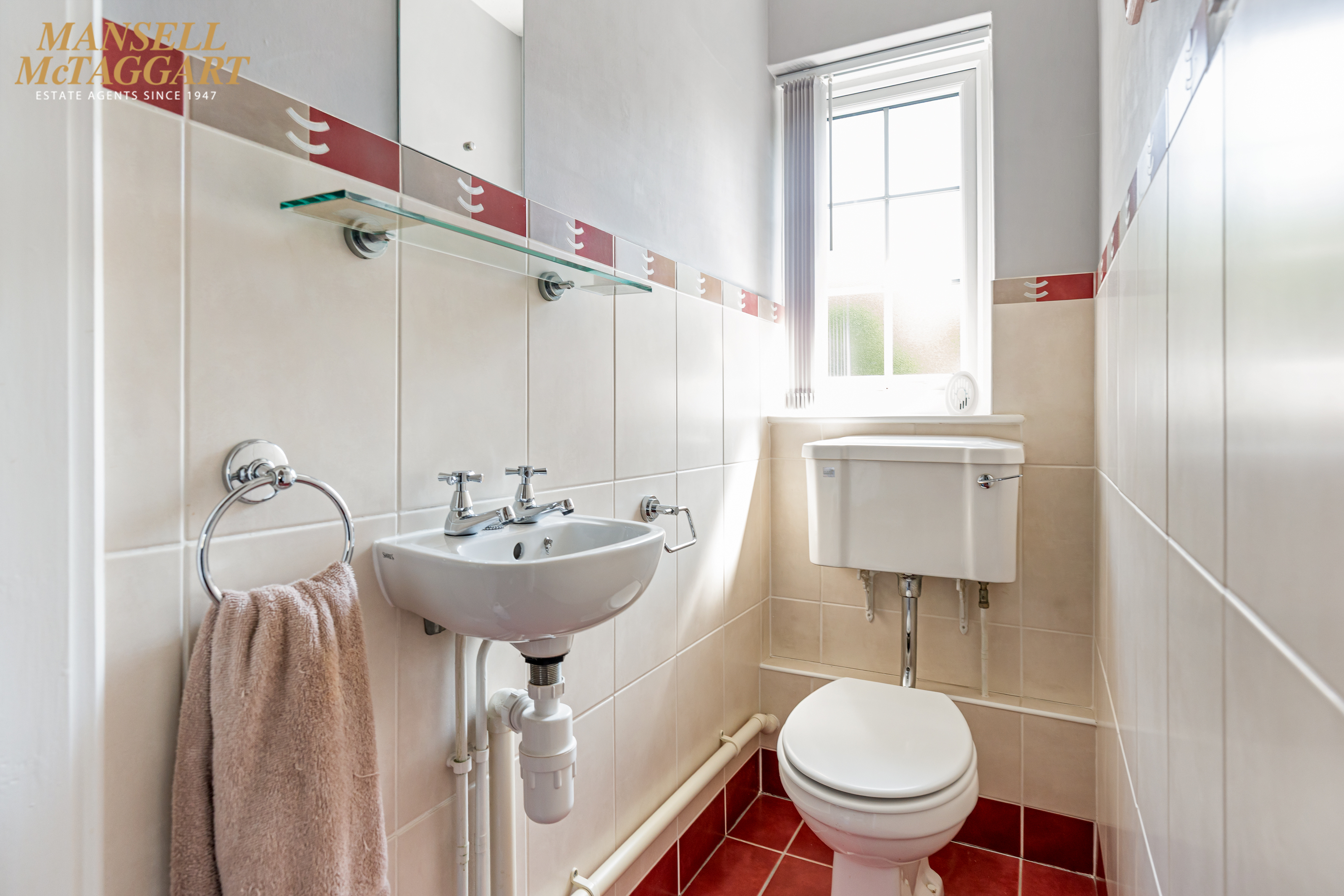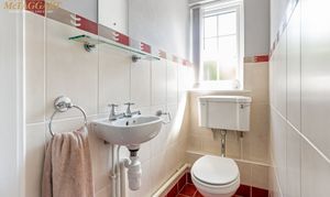 W/C has a tiled floor with part-tiled walls, basin, low level w/c and frosted uPVC double glazed window.