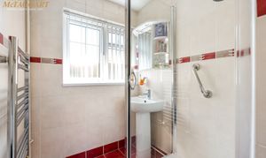 The bathroom has fully tiled walls/floors, basin with mirrored vanity storage unit over, towel rail, large single shower cubicle with frosted uPVC double glazed window for ventilation.