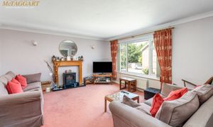 A large, bright carpeted room with big uPVC double glazed window to front communal area, electric fire seated within an ornate wooden fireplace as focal point, multiple power sockets can be found with TV point, space for sofas/seating areas and additional dining area.