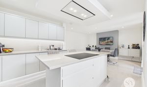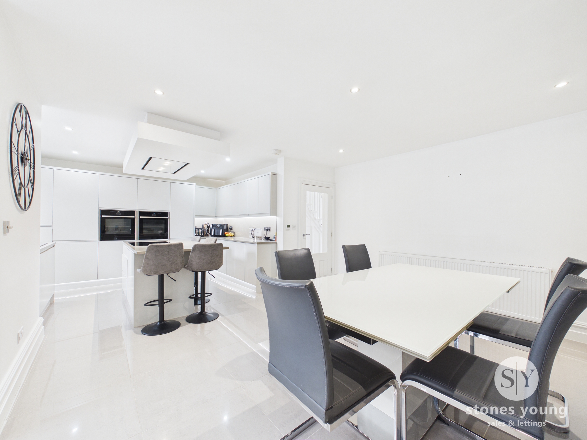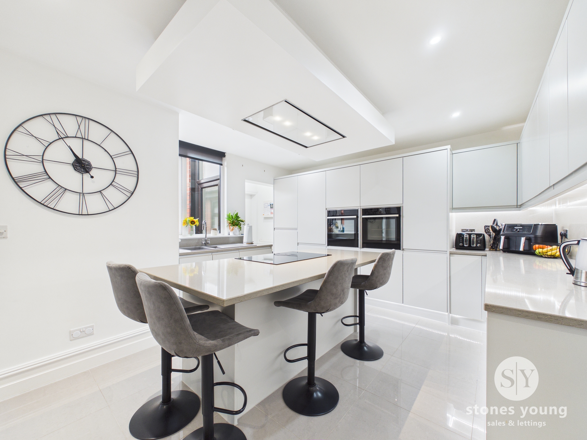 Tiled flooring with underfloor heating, fitted wall and base units with contrasting Quartz work surfaces, Neff induction hob, Neff extractor fan, integrated fridge freezer, Neff double oven, integrated dishwasher, sink and drainer, ceiling spot lights, space for dining table, double glazed uPVC windows.