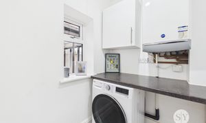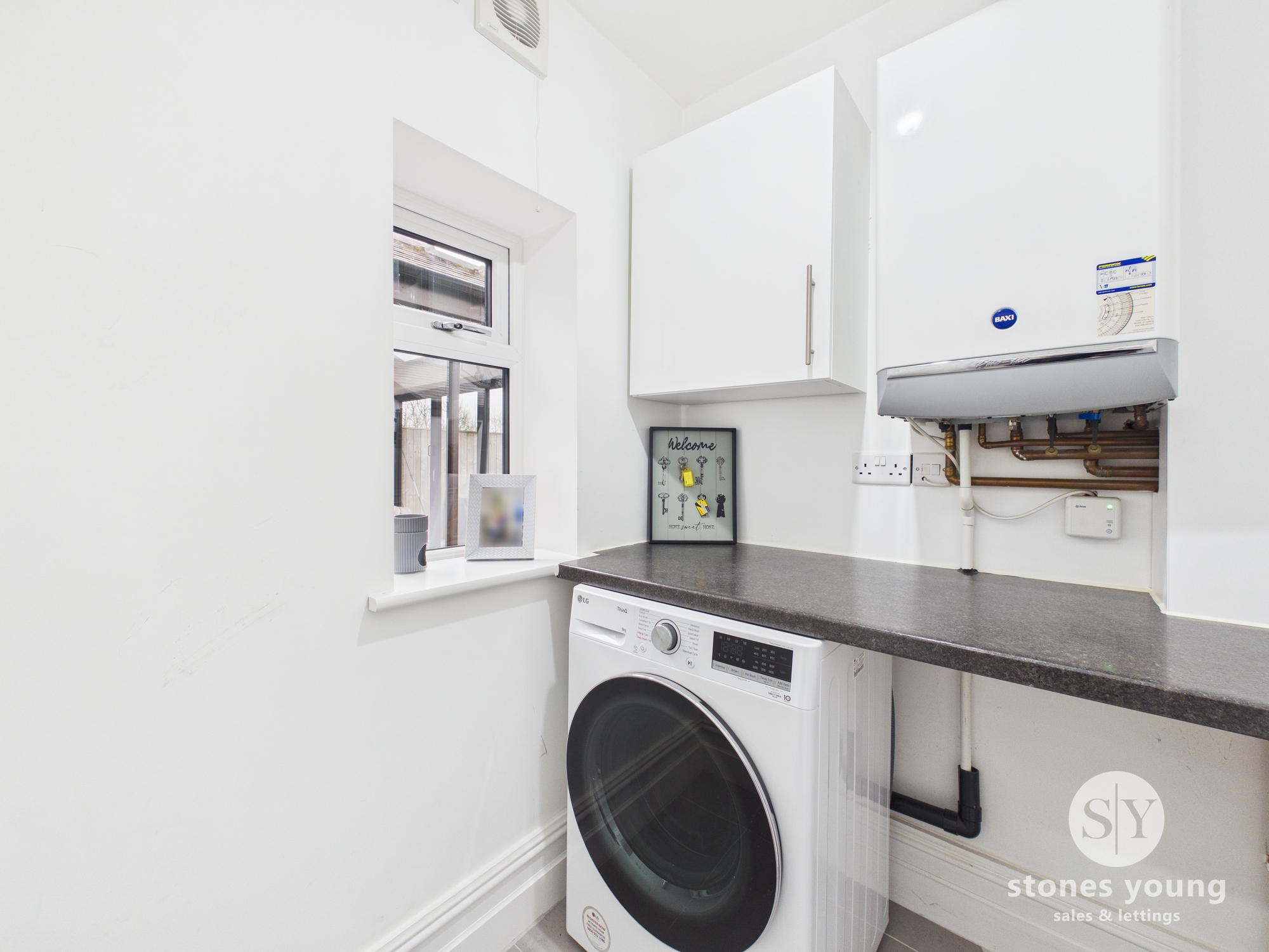 Tiled flooring, space for washing machine and tumble dryer, wall mounted boiler, double glazed uPVC window.