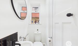 Tiled flooring, two piece in white comprising of wc and basin, tiled splash backs, door leading to under stairs storage, double glazed frosted uPVC window, panel radiator.