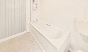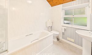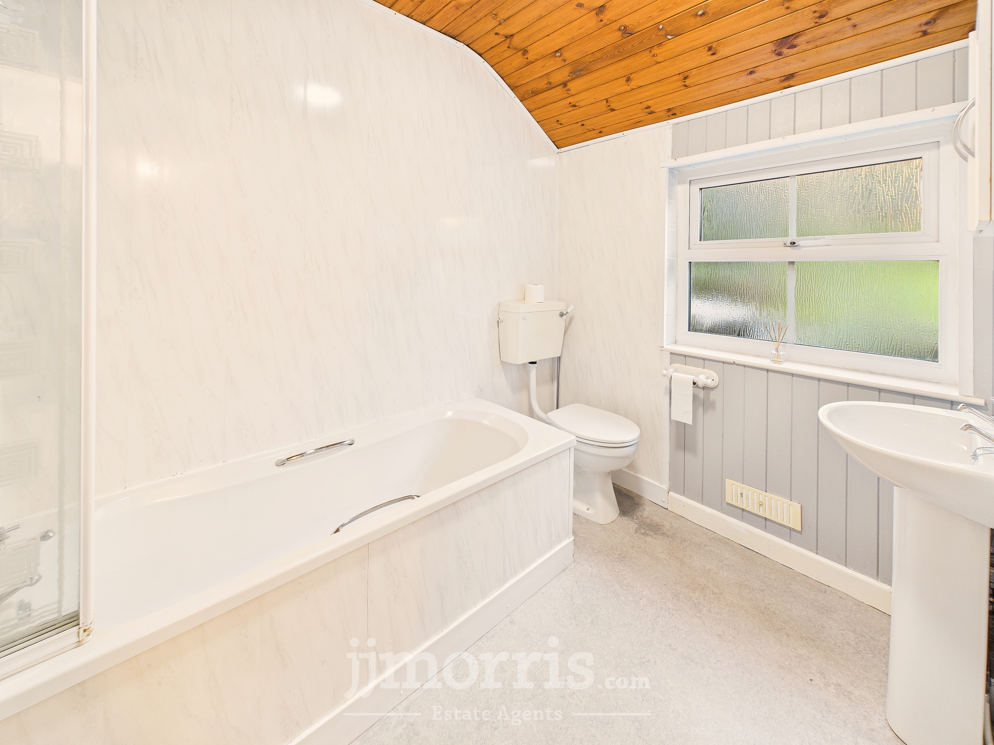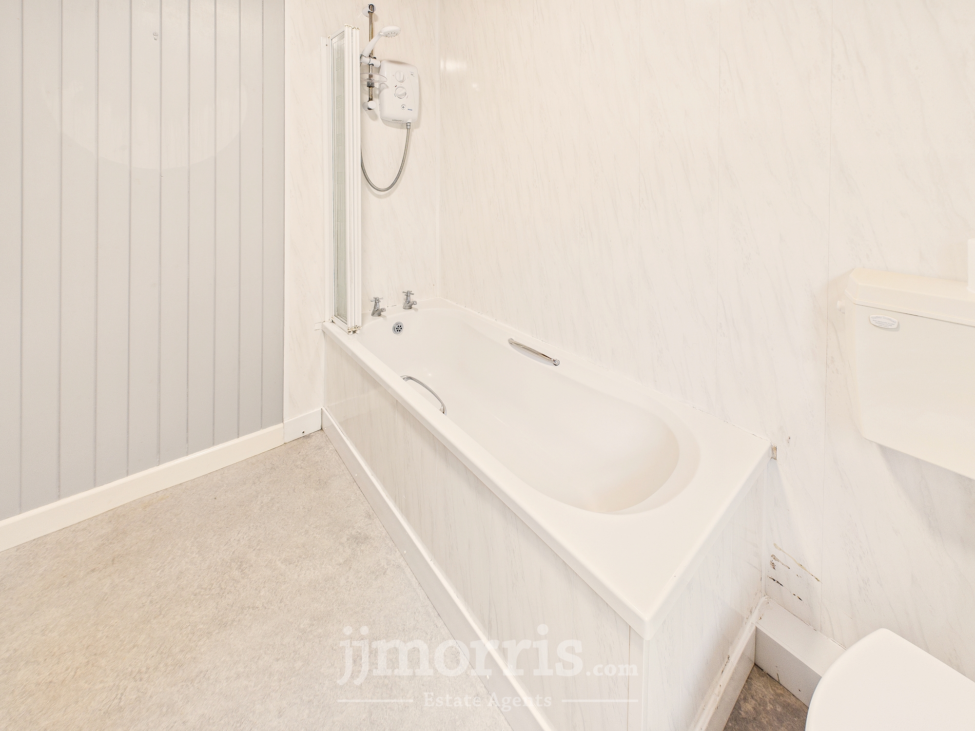 With vinyl floor covering, white suite of panelled Bath, Wash Hand Basin and WC, toilet roll holder, shaver point, wall mounted Electric Fan Heater, glazed folding shower screen, Triton T80Z Electric Shower over Bath, heated towel rail/radiator, ceiling light, uPVC double glazed window, Respatex/Aquaboard clad wall, Pine tongue and groove clad ceiling, painted tongue and groove clad wall and a mirror fronted bathroom cabinet.