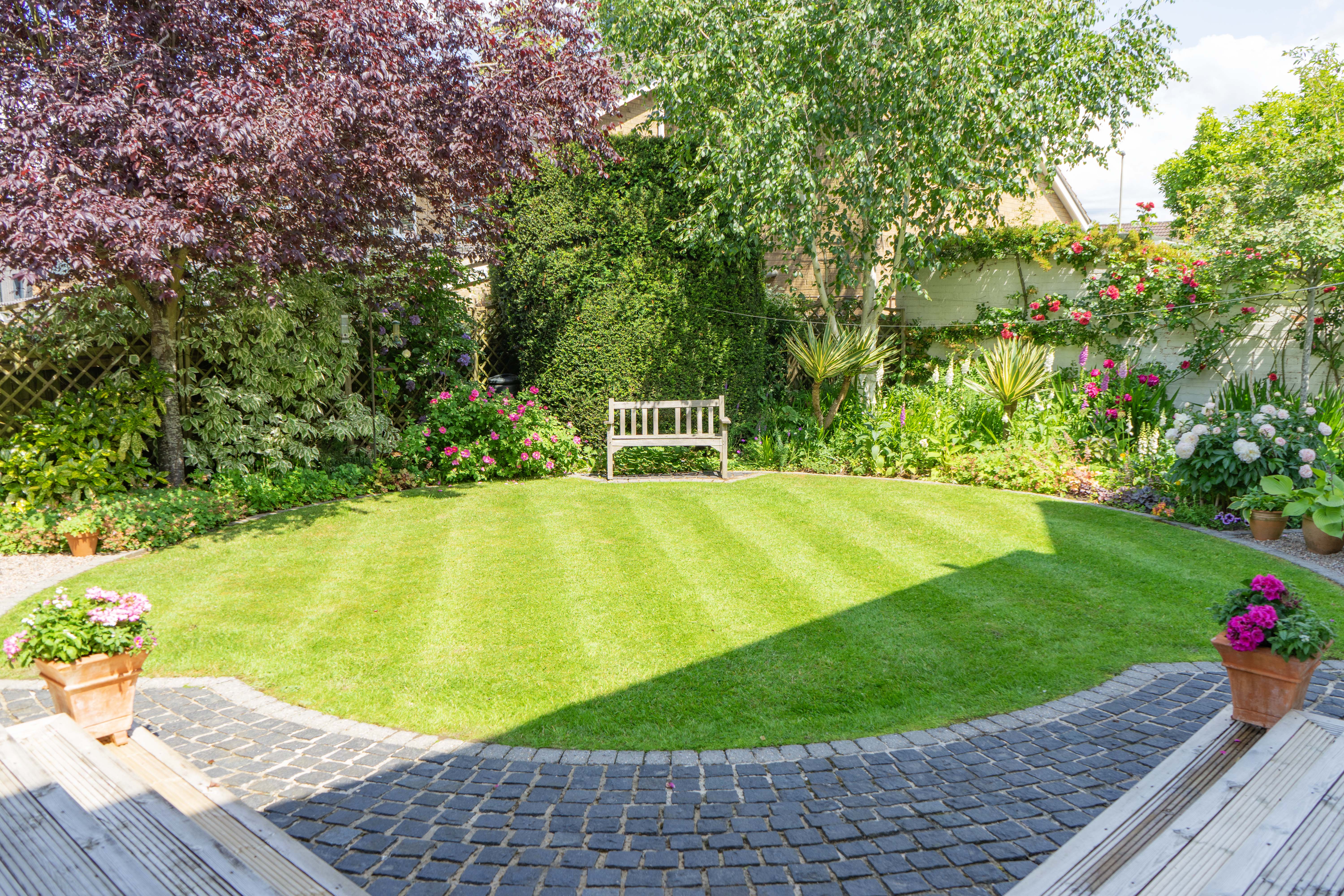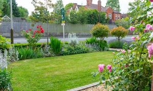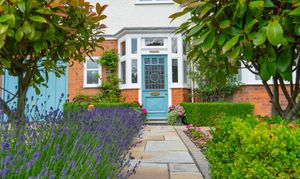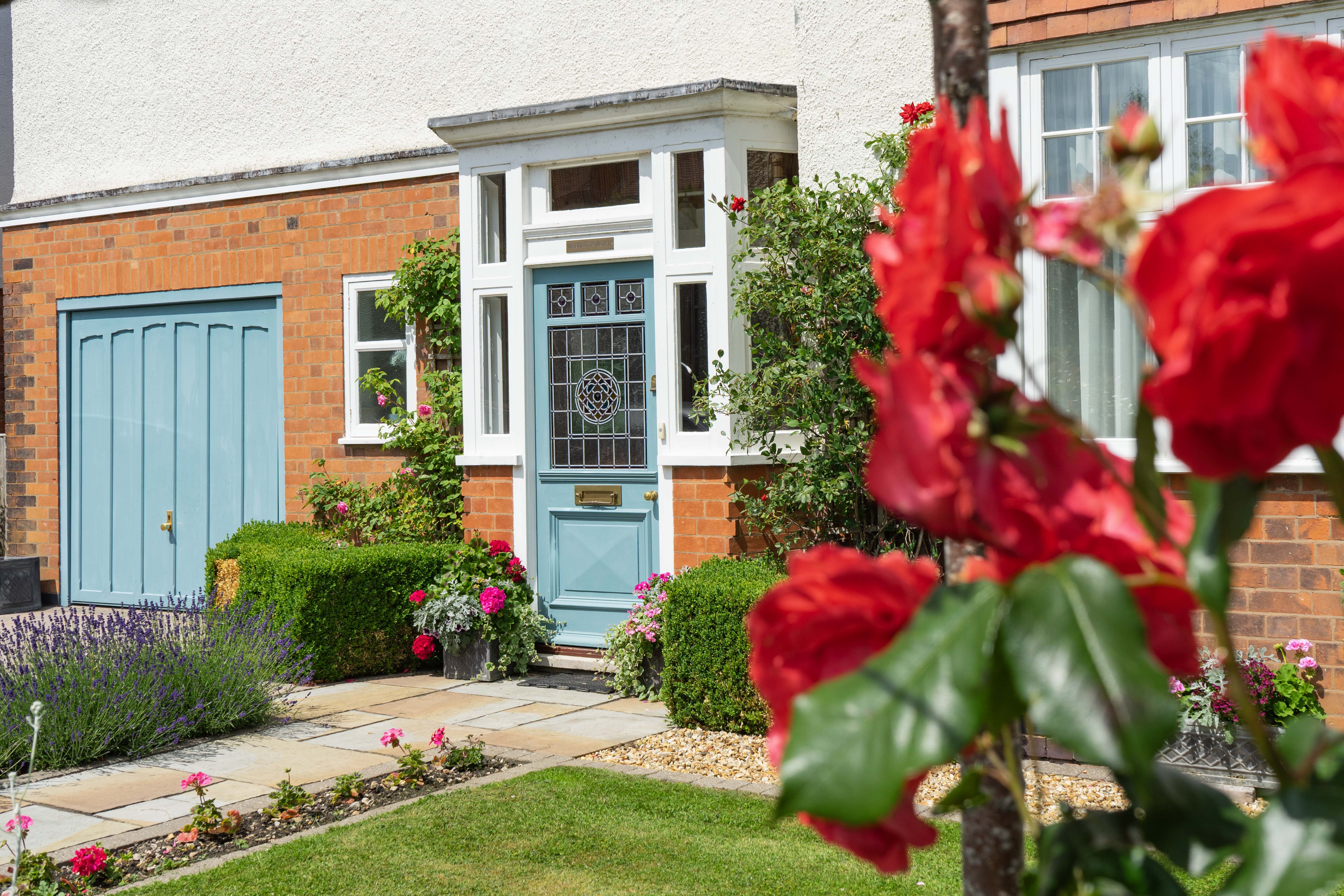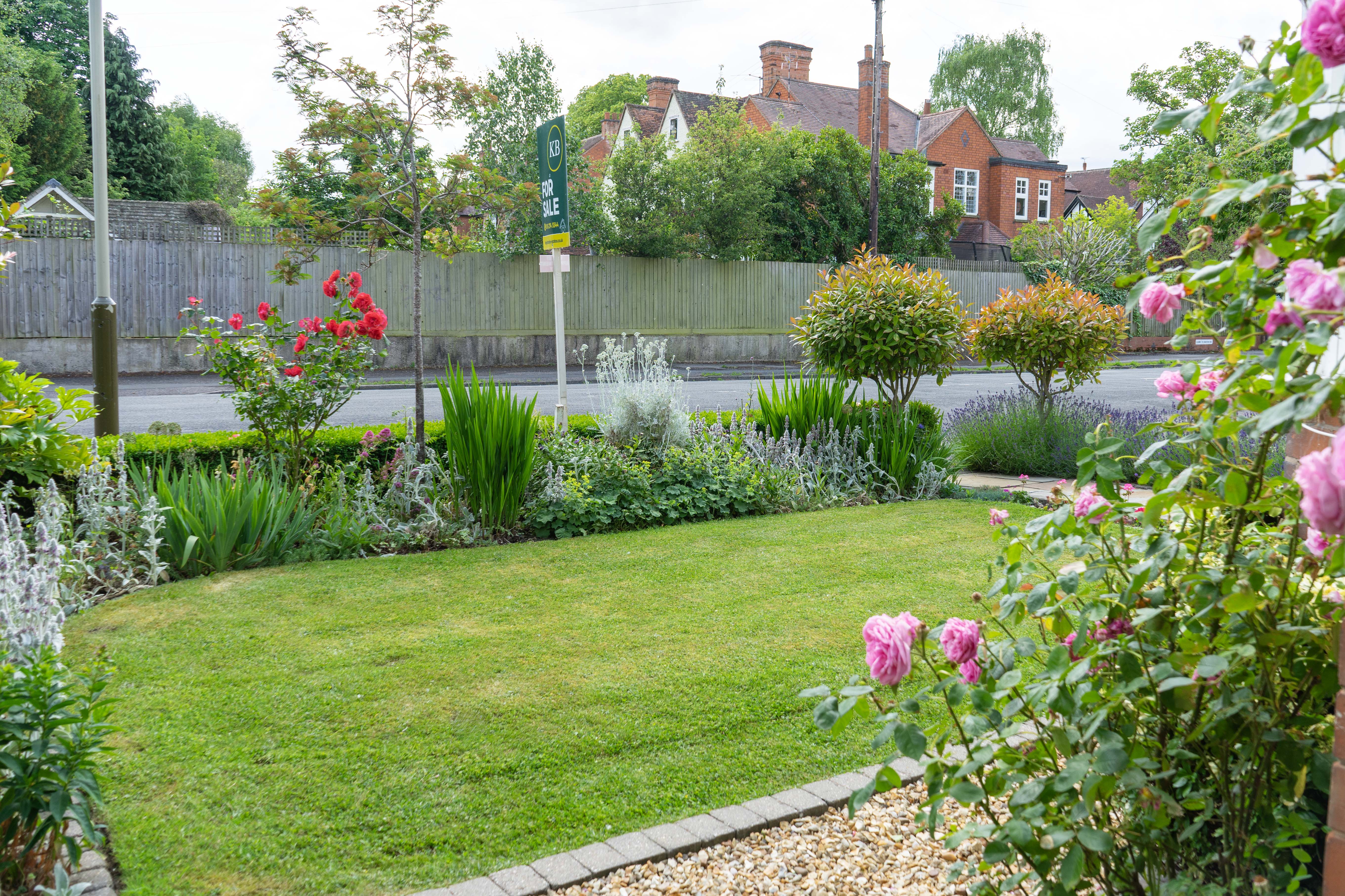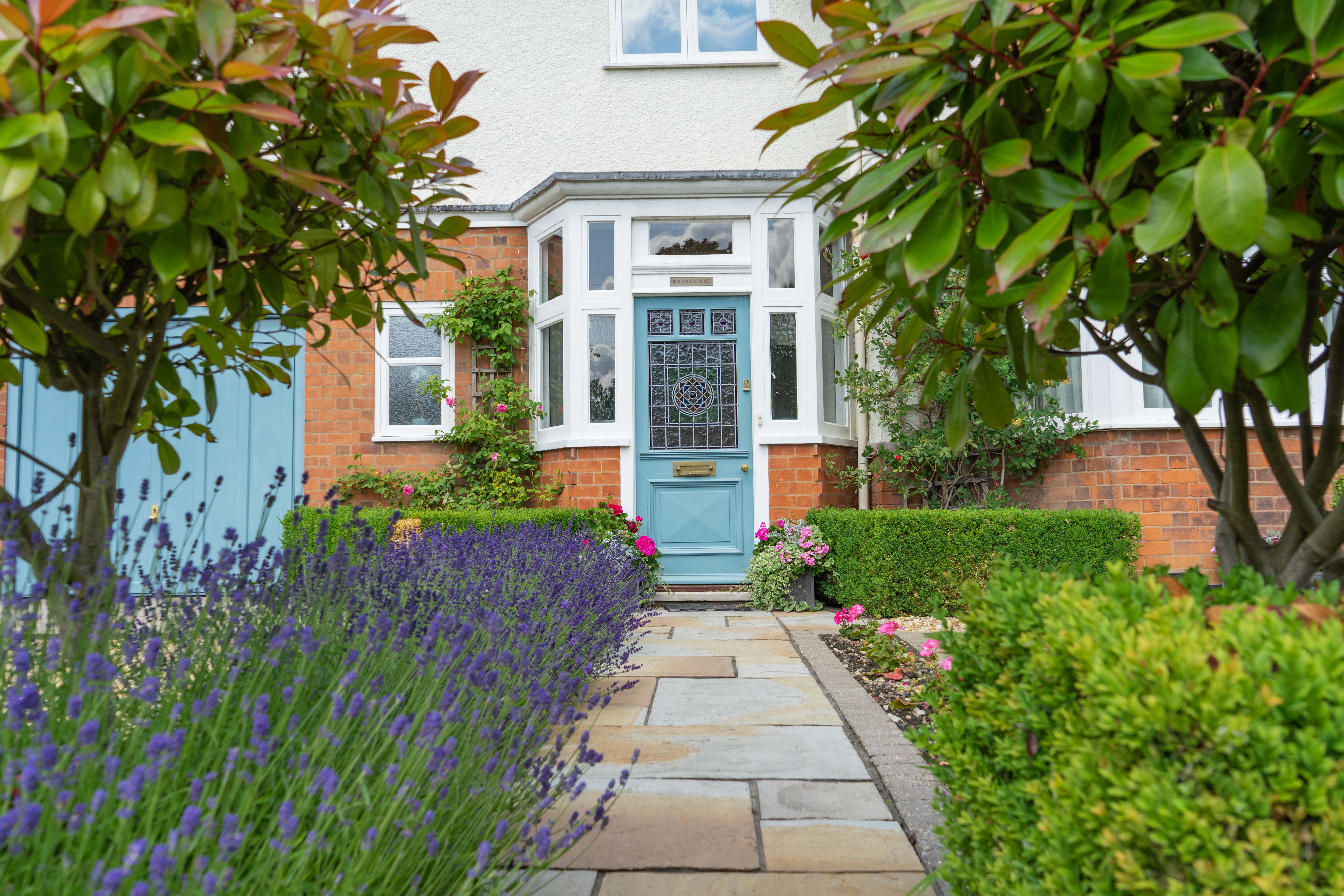 A landscaped front garden with dwarf hedging, paved pathway, lawn, well stocked flowerbeds and shrubs, stoned flowerbed.