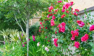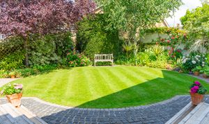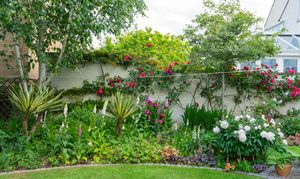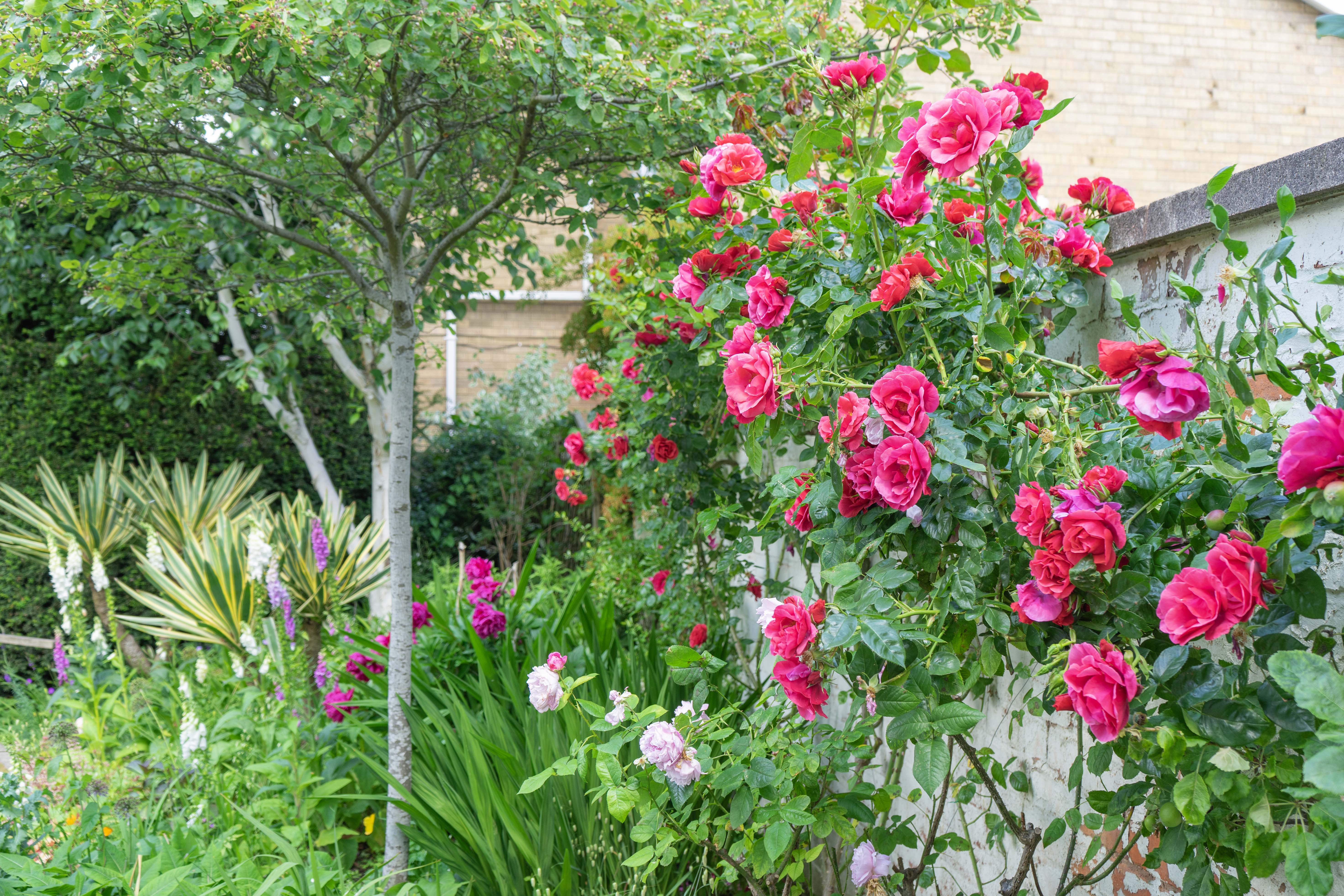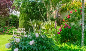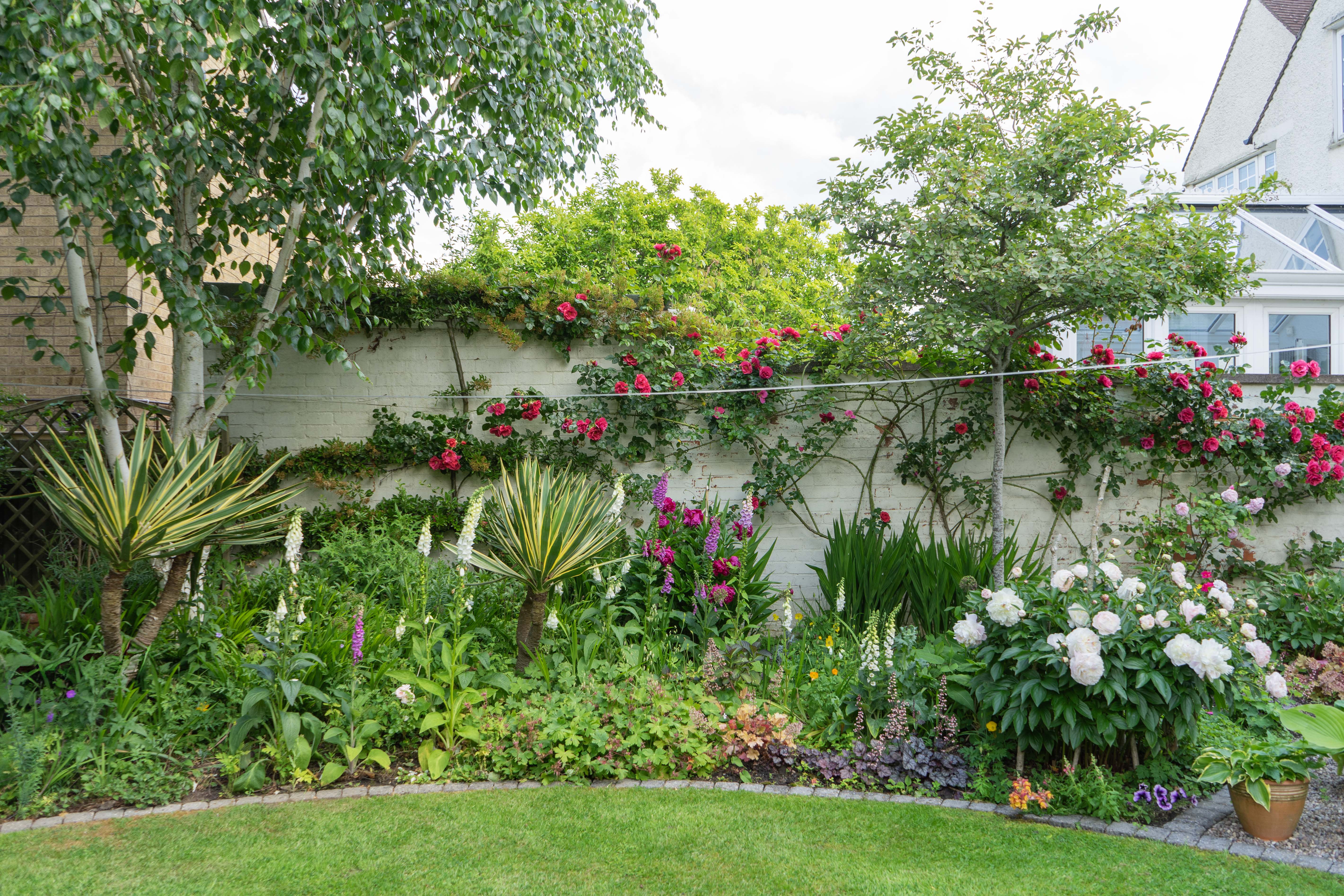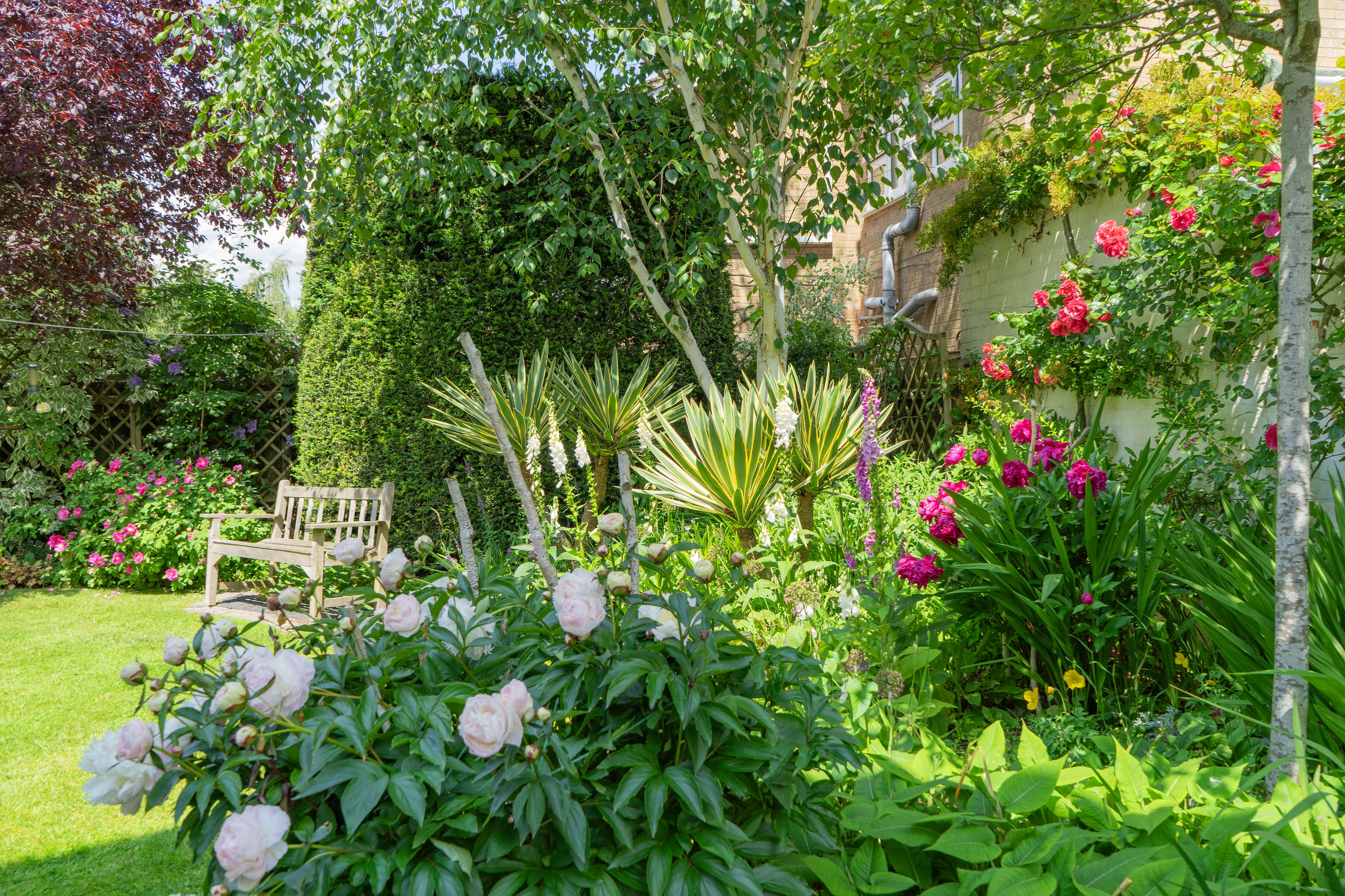 A landscaped front garden with dwarf hedging, paved pathway, lawn, well stocked flowerbeds and shrubs, stoned flowerbed.