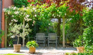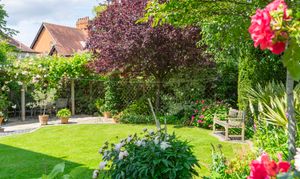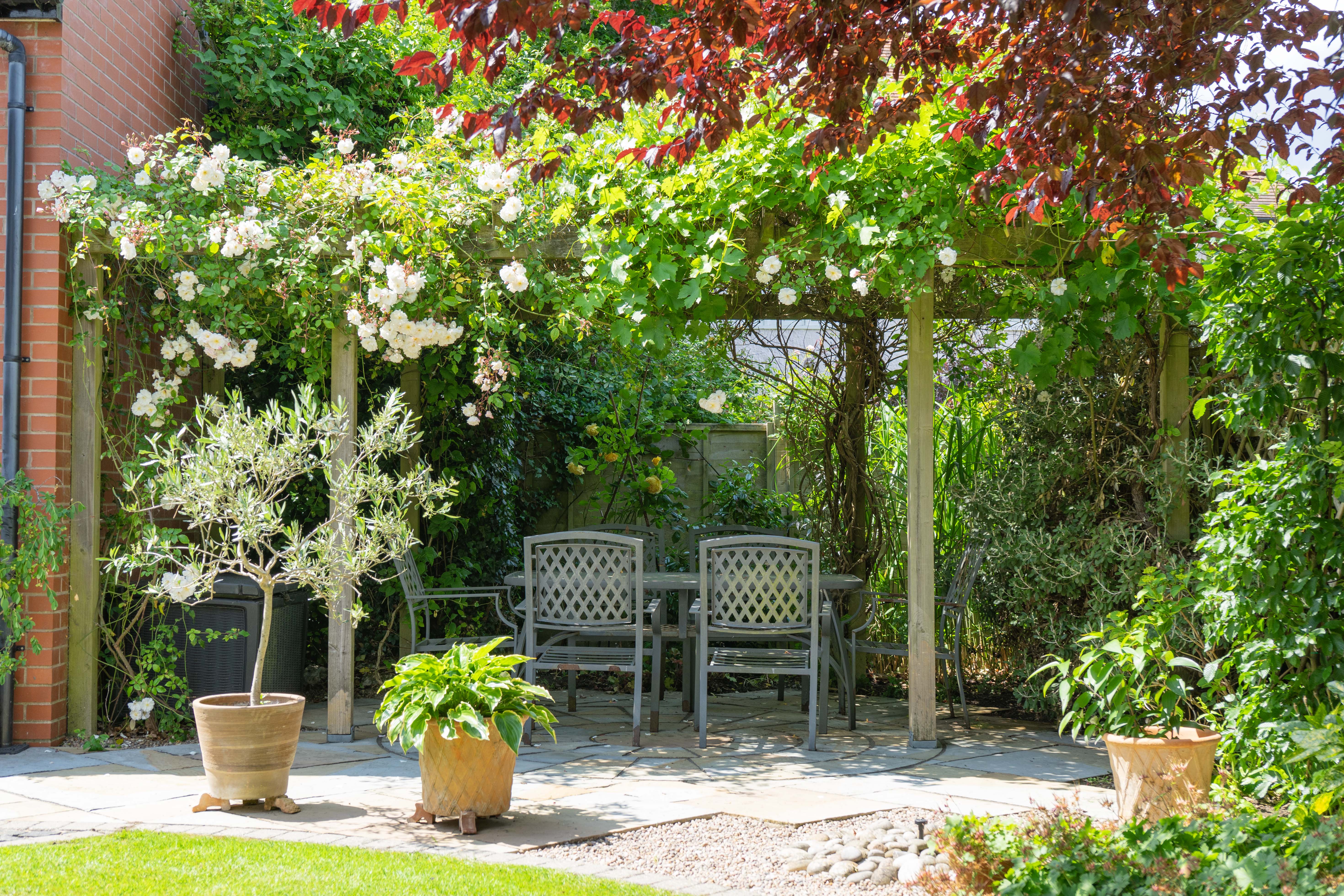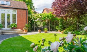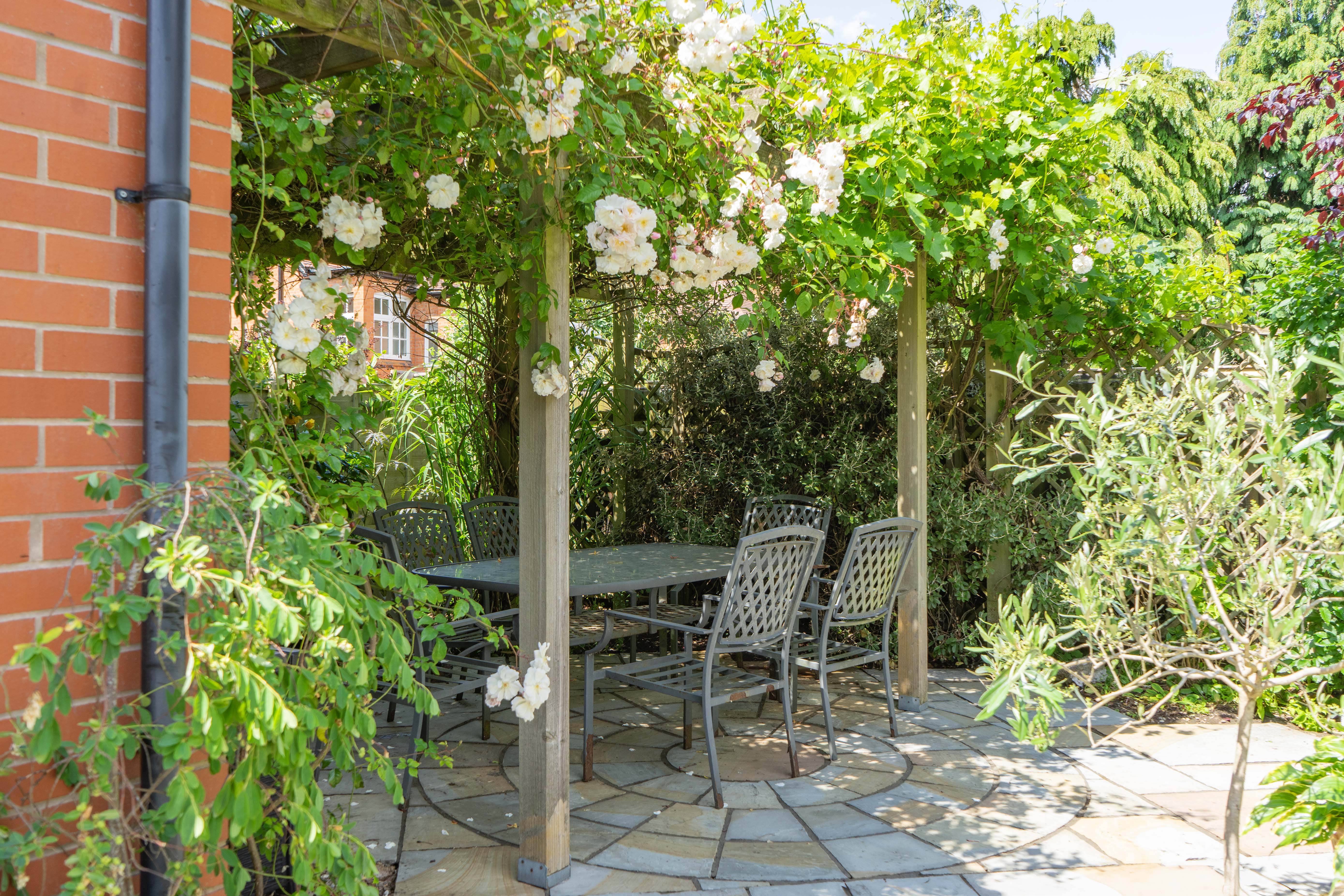 A well designed and landscaped rear garden with decked area accessed from the sun lounge and kitchen dining room, steps leading to paved patio area, block paved patio area, circular shaped lawn, flowerbeds and shrubs, water feature, mature tree, pergola with mature vine, circular paved seating area below, fenced and walled perimeter, gate to side access.