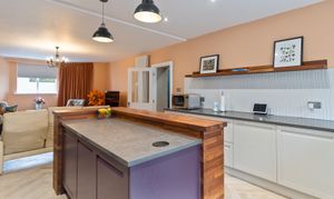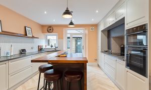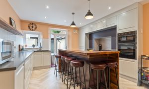 The garden level hosts the heart of the home — an impressive open-plan kitchen and family room. This luxurious, high-specification space features a large, fitted kitchen with a central island and breakfast bar, complemented by modern premium integrated appliances and stylish finishes. The open-plan layout allows for additional seating or dining, creating the perfect space for family gatherings or entertaining. Also located on this level is a large walk-in pantry offering excellent storage and a contemporary shower room for added convenience.