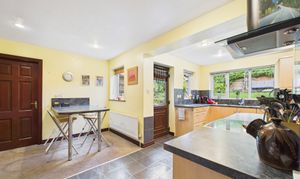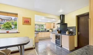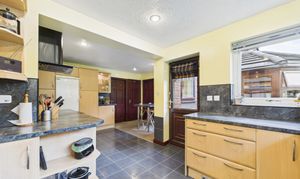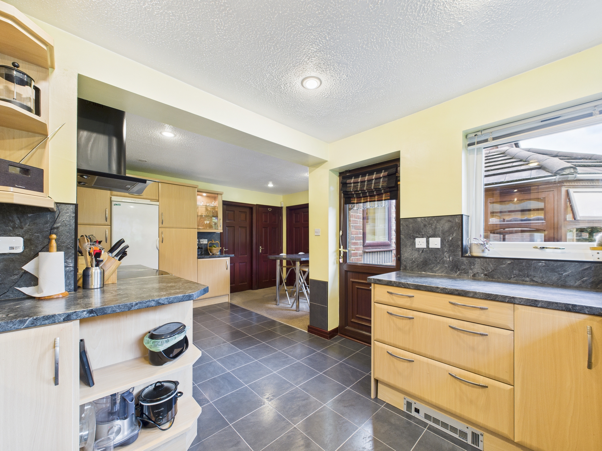 At the heart of the property is a LARGE OPEN-PLAN KITCHEN, fitted with ample storage, modern appliances, and a convenient BREAKFAST BAR. A separate PANTRY AREA provides extra storage, ideal for keeping essentials neatly organised and out of sight.