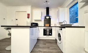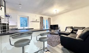 The property is presented in excellent order, with a modern, neutral décor and grey laminate flooring carried seamlessly through the apartment. The impressive open-plan lounge and breakfasting kitchen is flooded with natural light, enhanced by French doors opening to a Parisian balcony with attractive views over Memorial Park. The kitchen is fitted with a range of contemporary wall and floor units, contrasting worktops, and a breakfast bar, with integrated oven, 4-ring hob, and extractor hood creating a smart focal point.