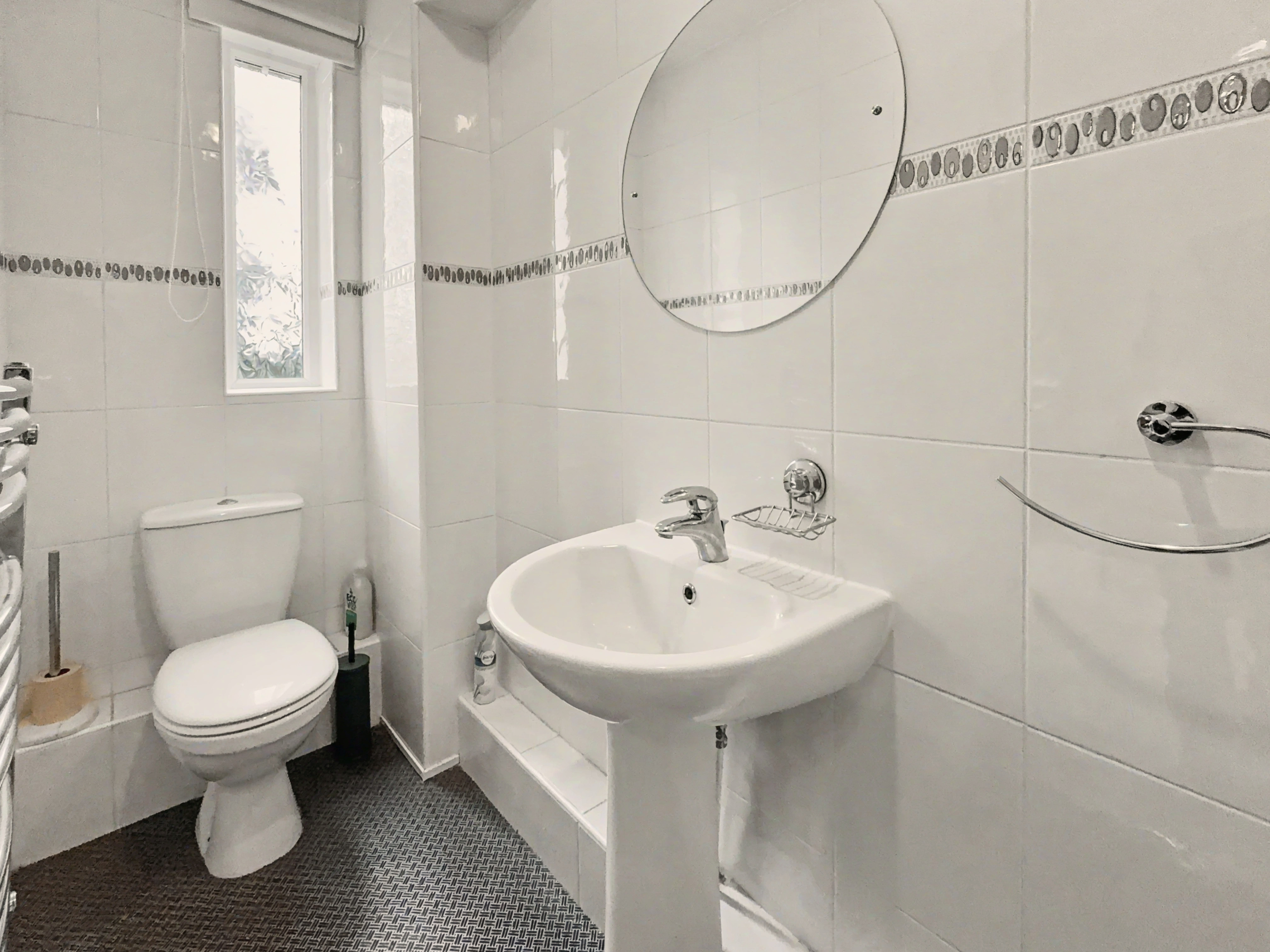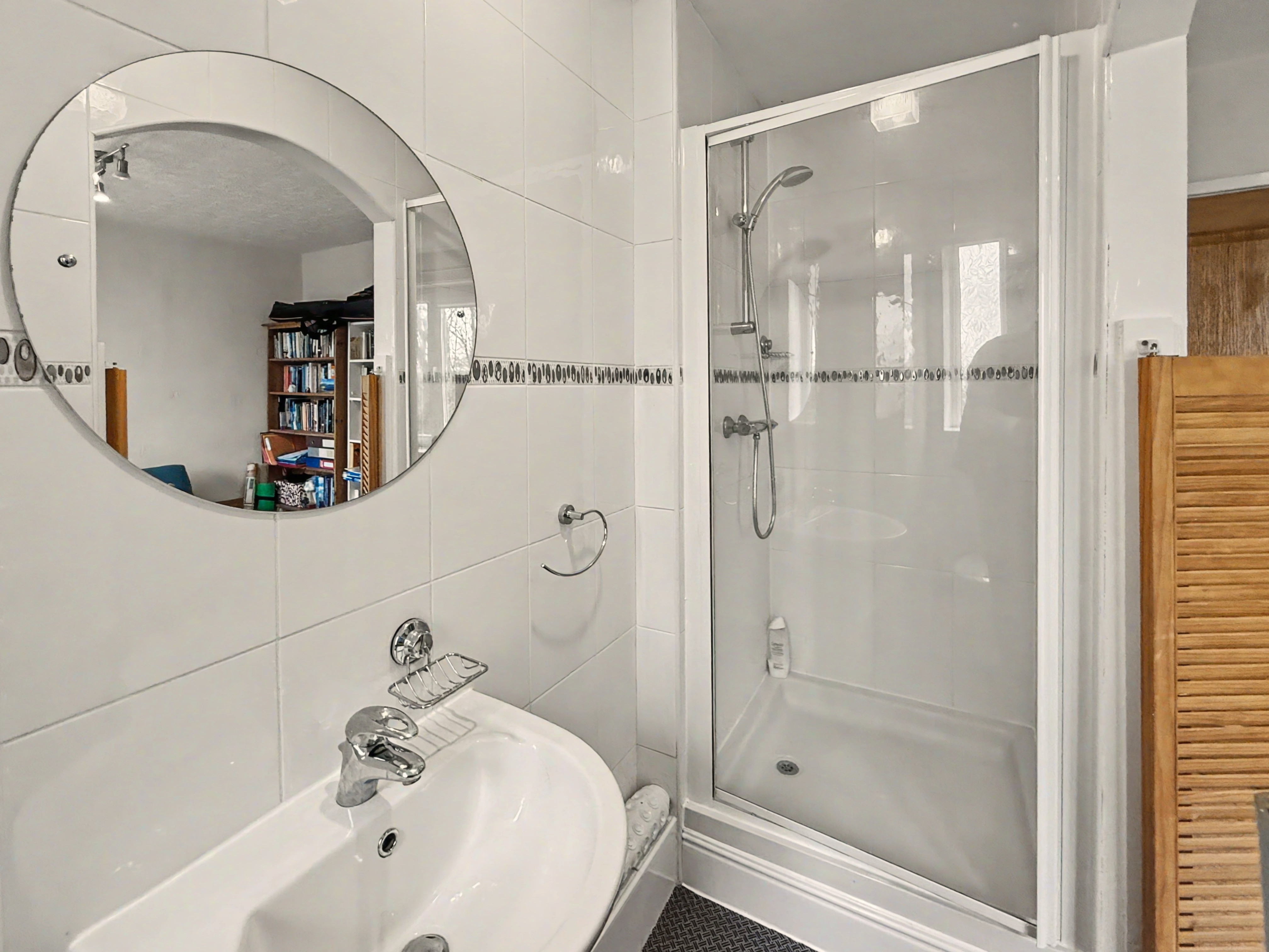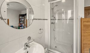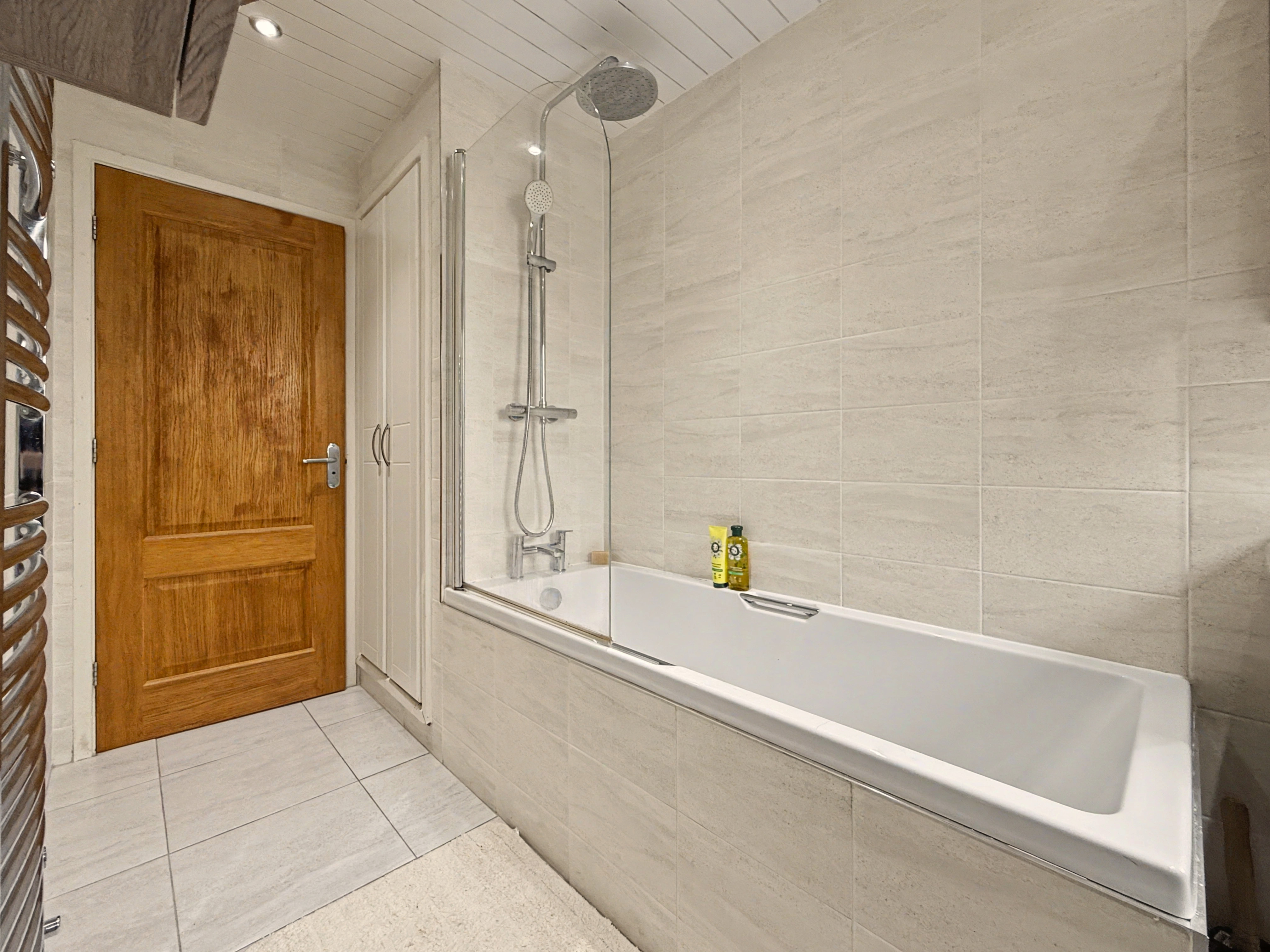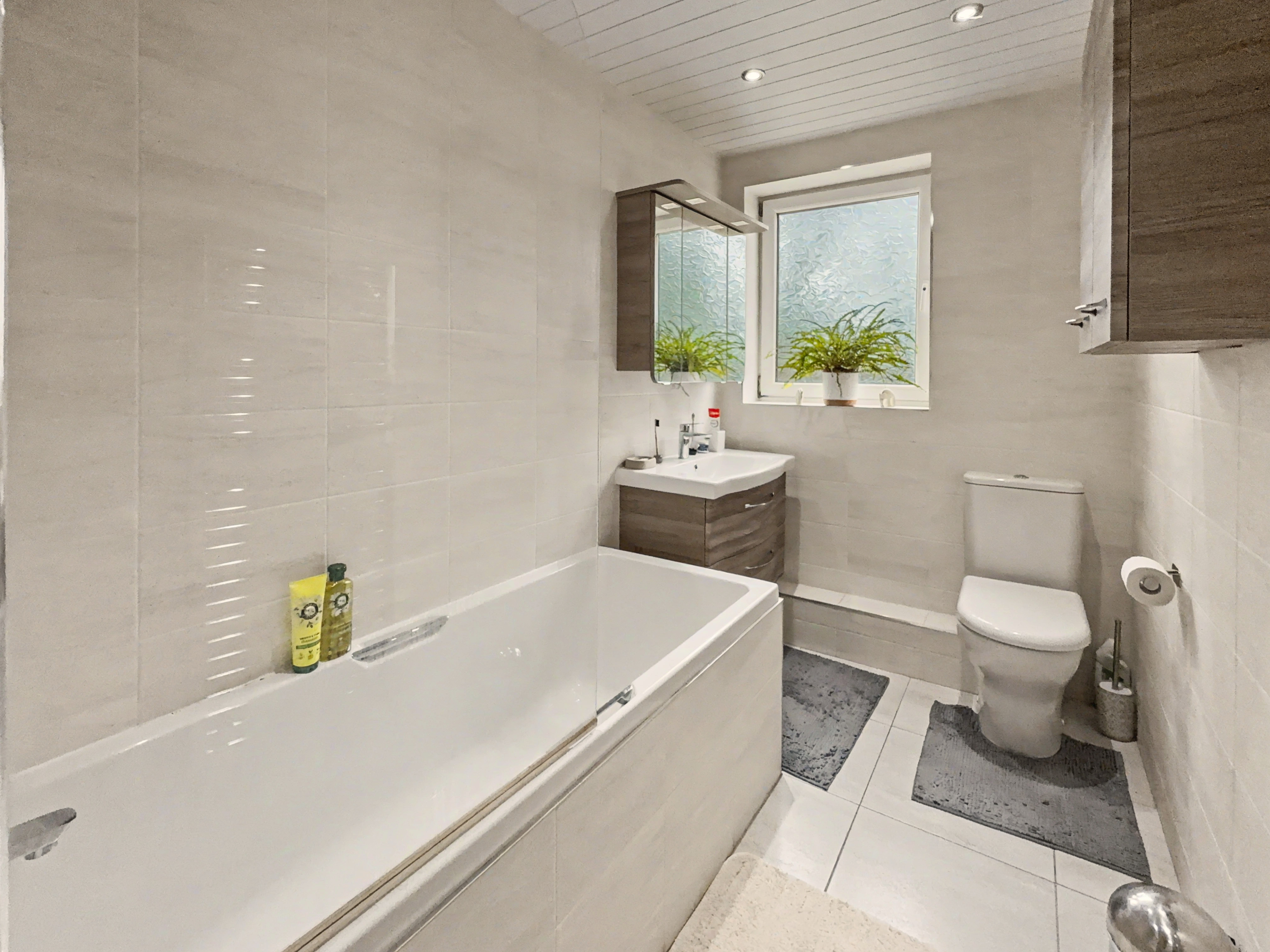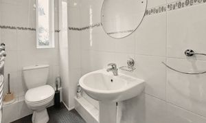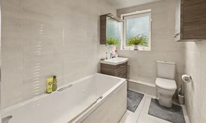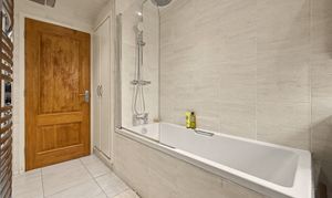 There is a full main bathroom, which is fully tiled with a white three-piece suite, bath with overhead shower, vanity sink unit and wc.