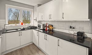 The welcoming entrance hall is complemented with a built-in cloaks/storage cupboard and carpeted flooring. There are also lower and upper hall cupboards with space for cloaks and secure space for gas and electricity meters. The spacious open plan lounge/dining room has ample room for sofas and further furniture as well as a dining table and chairs with double windows which floods the room with natural light and overlook the communal gardens. The kitchen has a host of white gloss wall/base units and granite effect work surfaces, in built in appliances such as split level oven and hob and space for white goods.