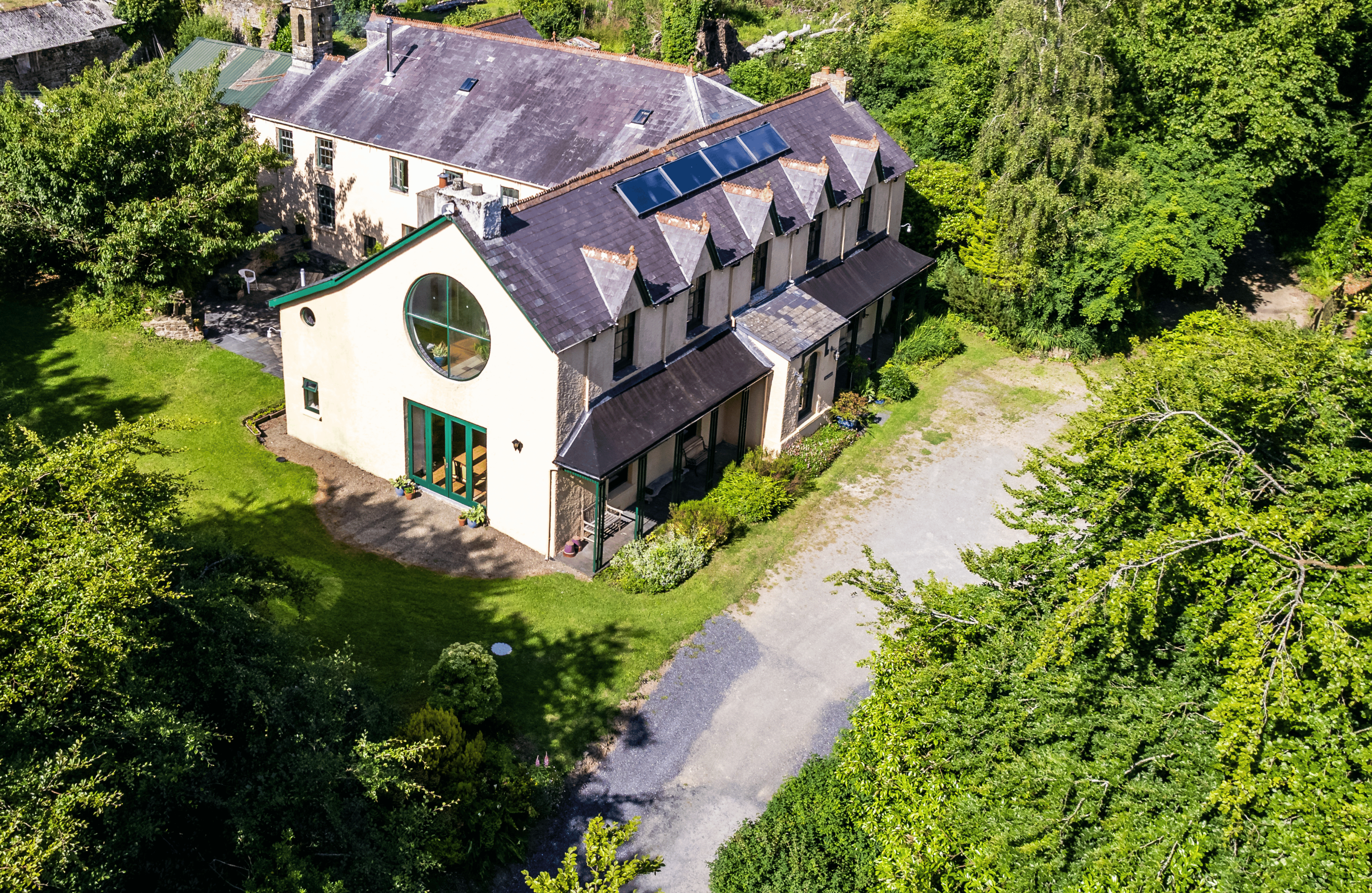 Tyllwyd combines period charm with modern eco-conscious features. A roof-mounted solar thermal array provides hot water for the home, while a 4kW ground-mounted solar PV array supplies electricity and feeds into the national grid under an index-linked Feed-in-Tariff running until 2037. These installations support lower energy costs and contribute to sustainable living.