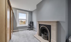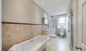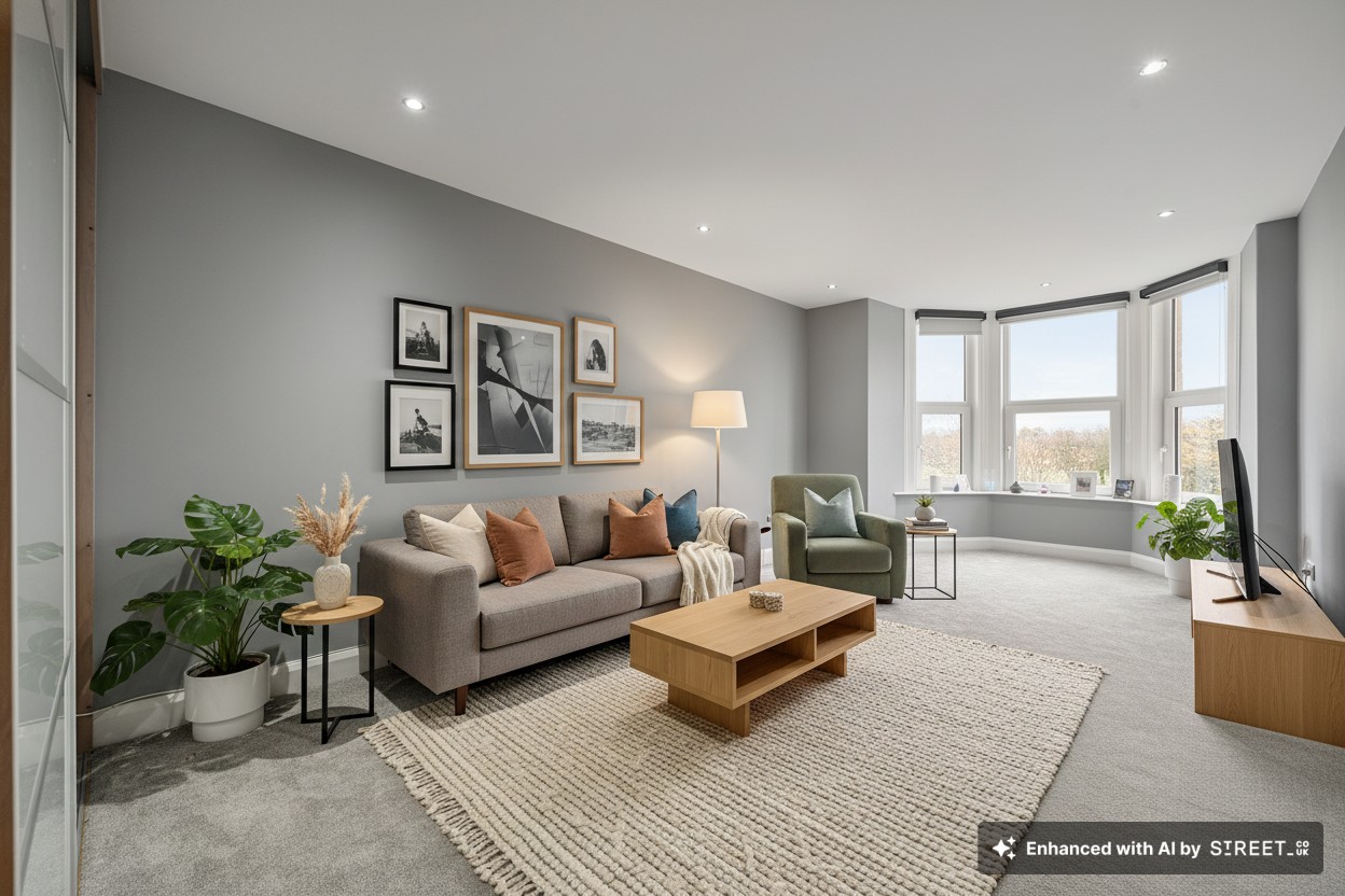 Directly ahead, you’ll find the contemporary bathroom featuring both a bathtub and a walk-in shower, along with the bright and generously sized living room. This lovely space includes a bay window offering picturesque views over the renowned Stray parkland.