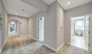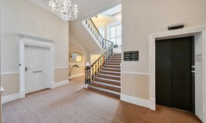 The building is approached via a secure entrance that opens into an attractive communal hallway, complete with an ornate chandelier. The apartment can be reached by either lift or stairs. Inside, a spacious and welcoming hallway provides access to all rooms and includes useful built-in storage.