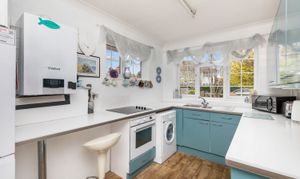 Adjacent to the lounge is the kitchen, which is well equipped and enjoys pleasant views to the front. Both bedrooms are generously sized, with the principal bedroom benefiting from built-in wardrobes and views of the rear garden.