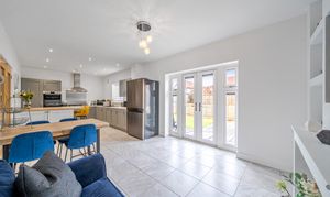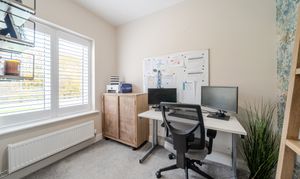The ground floor welcomes you with a bright reception room complete with feature electric fire and in-built storage, perfect for family relaxation, and a versatile study ideal for home working. The heart of the home is the impressive open-plan kitchen and dining room, featuring modern fittings and spotlights, sleek flooring and French doors that open directly to the rear garden—perfect for entertaining or enjoying summer evenings. A utility room, guest WC, and handy storage spaces complete the ground floor.