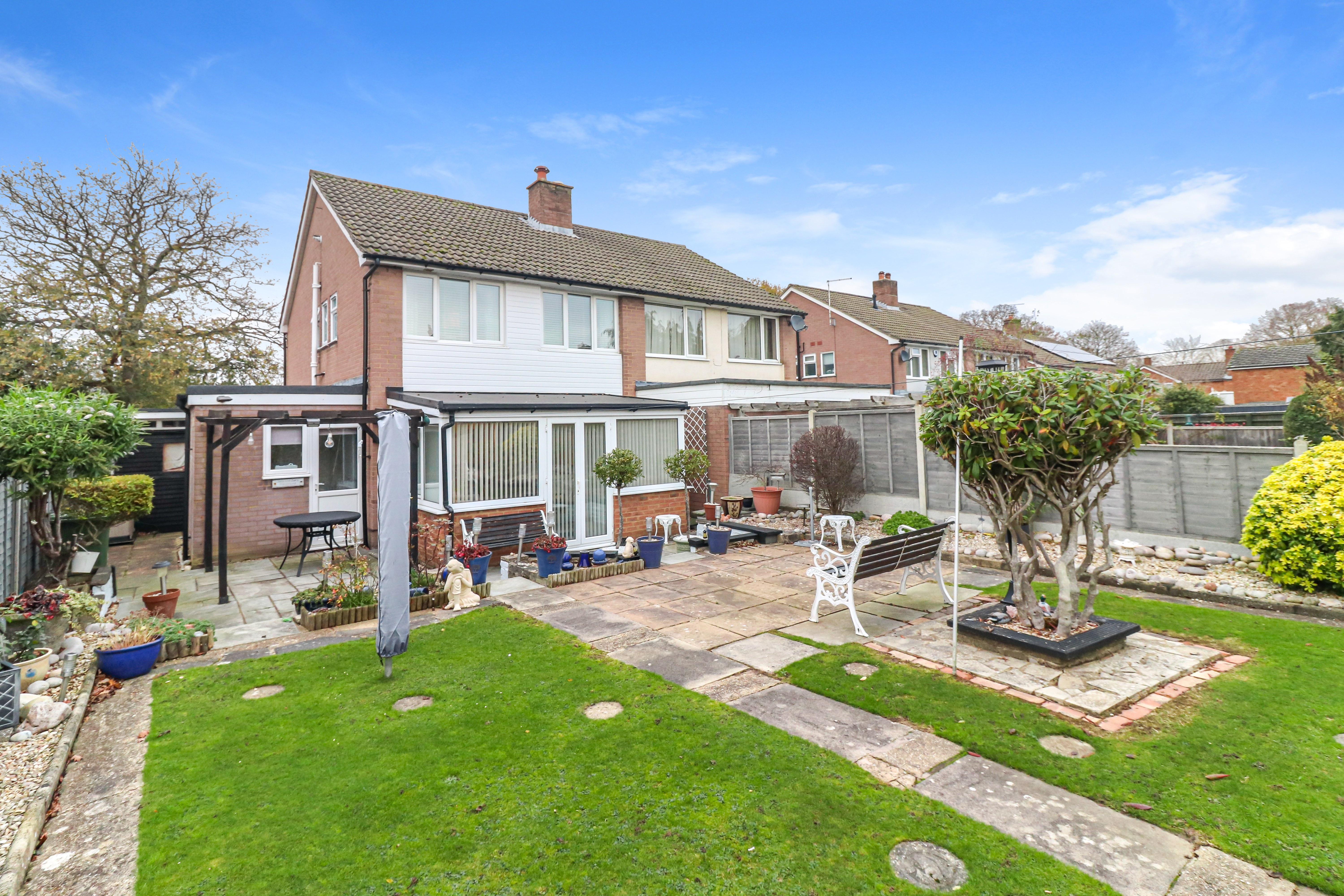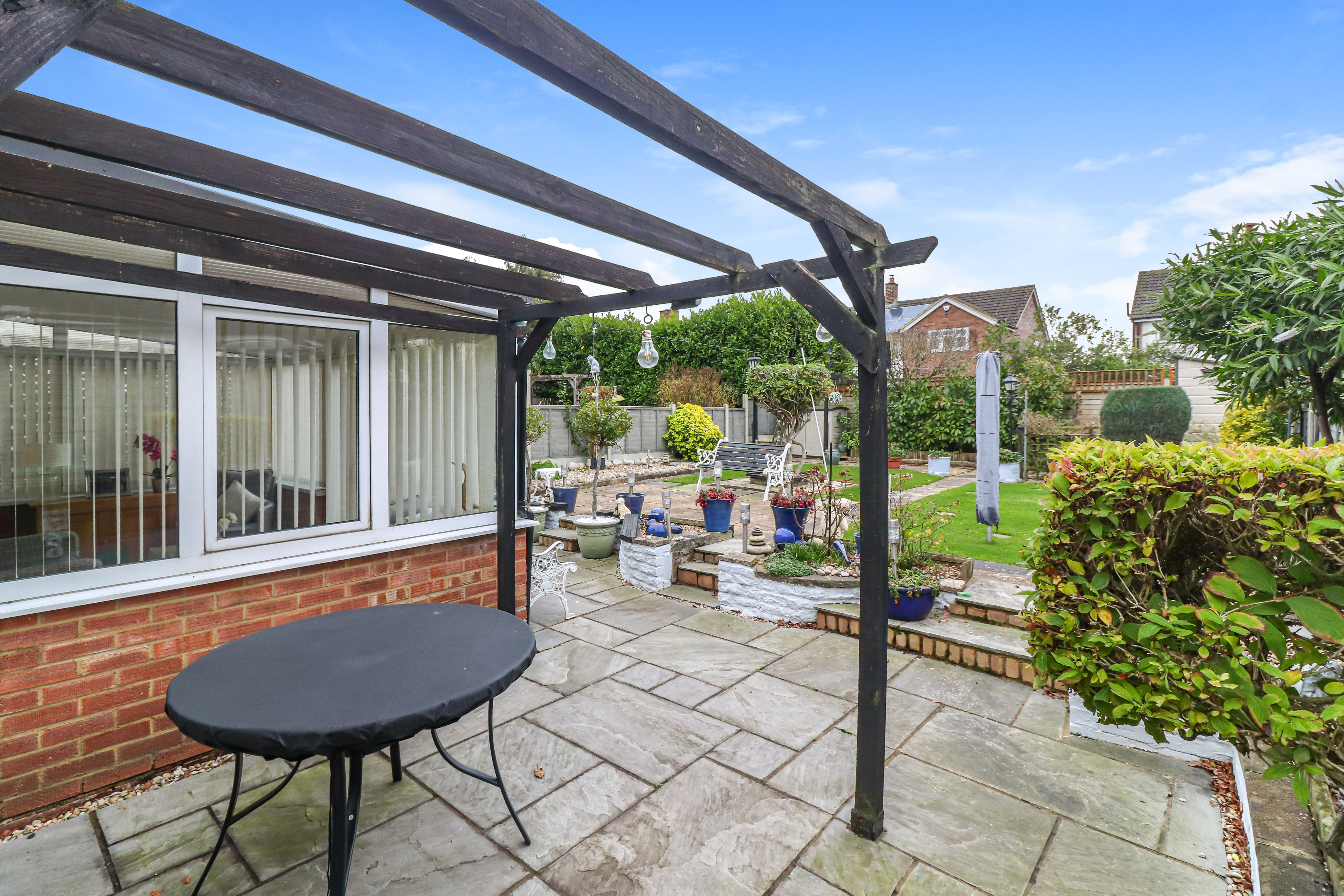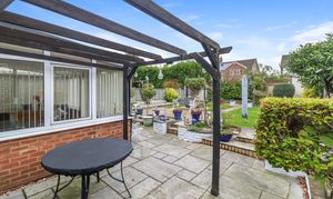 Externally, the large rear garden has been thoughtfully designed, with various paved seating areas, attractive borders and manicured lawned spaces. Additionally, covered access leads you to the front of the house where there is a driveway offering parking for multiple vehicles and access to a single garage.